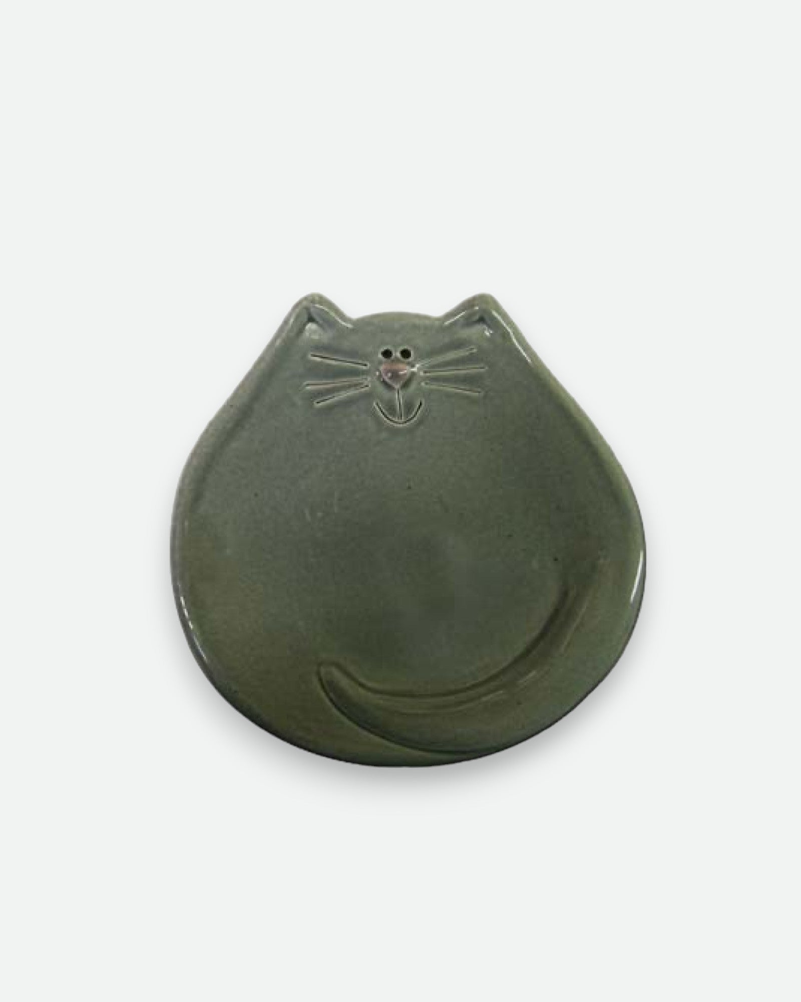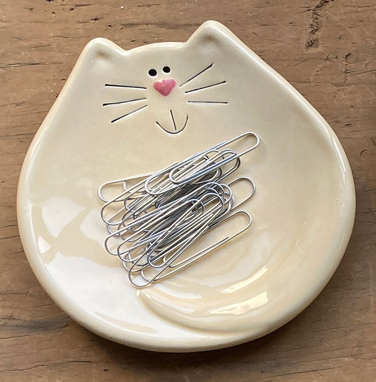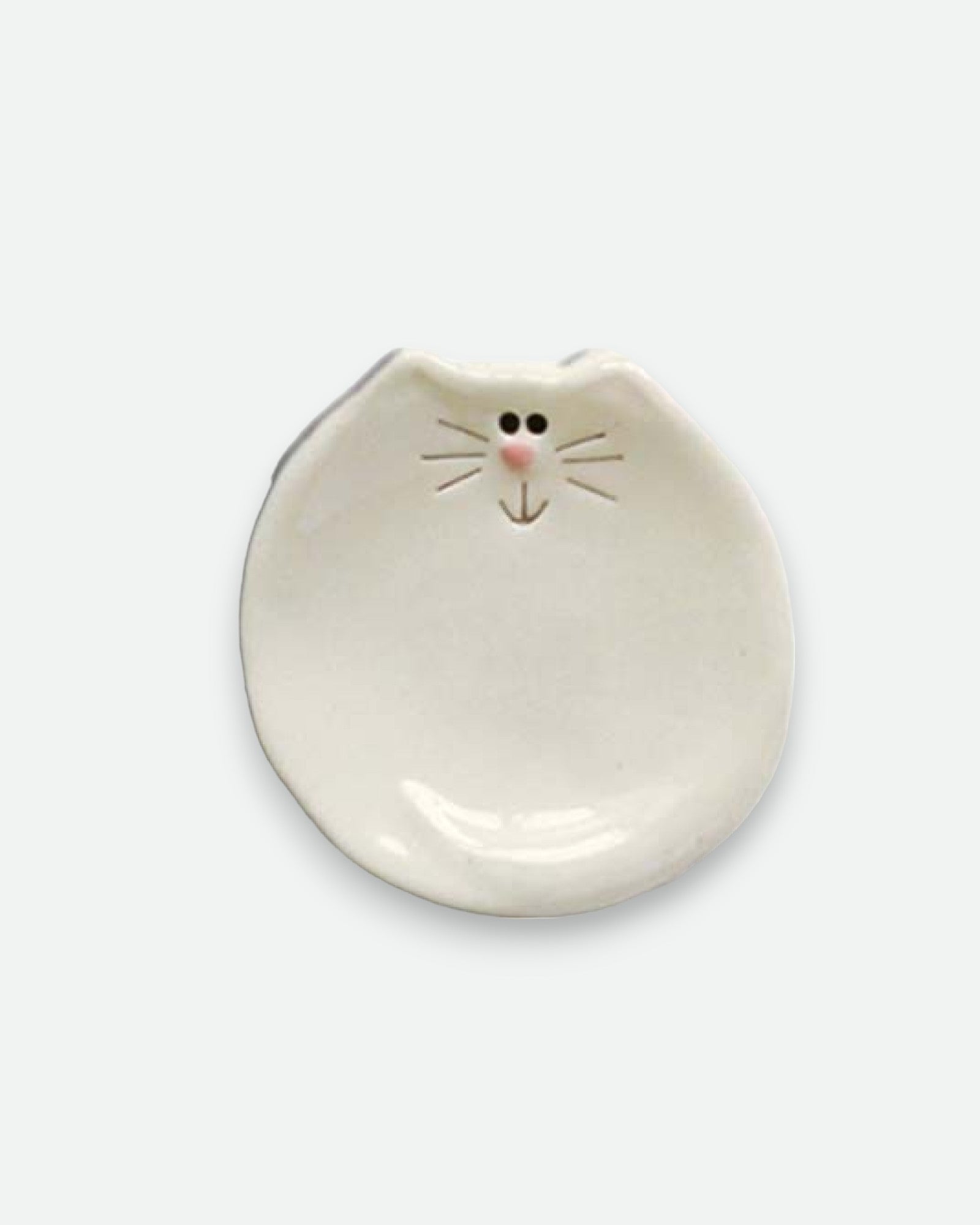 Handmade kitty dish by August ceramics studio in Whitinsville, MA. Hand painted with ceramic glazes. It is food and dishwasher safe and has many uses: little snacks, spoon-rest, soap dish, tea bag rest, ring dish, or even ashtray. You might find one that looks similar to your cutie at home!