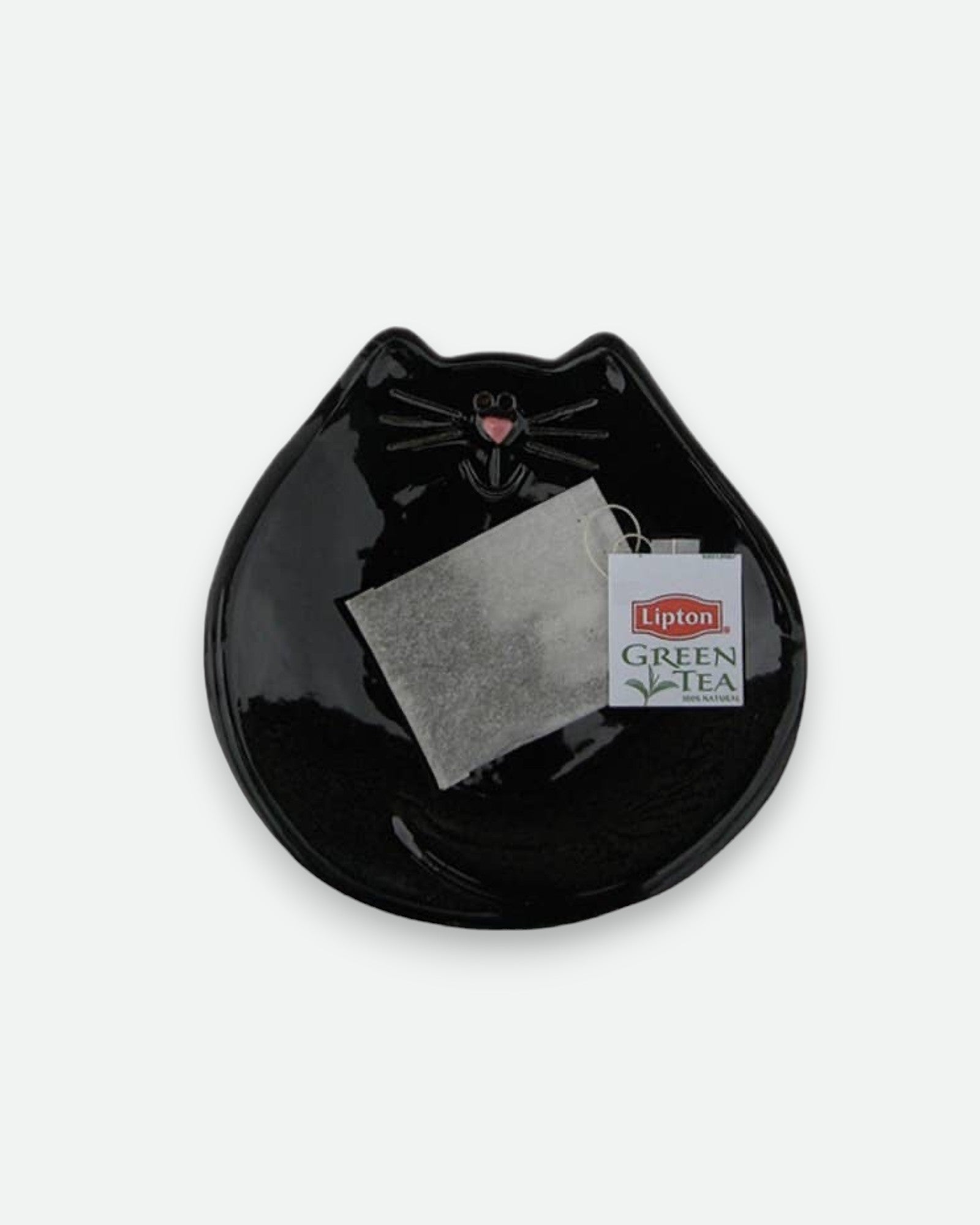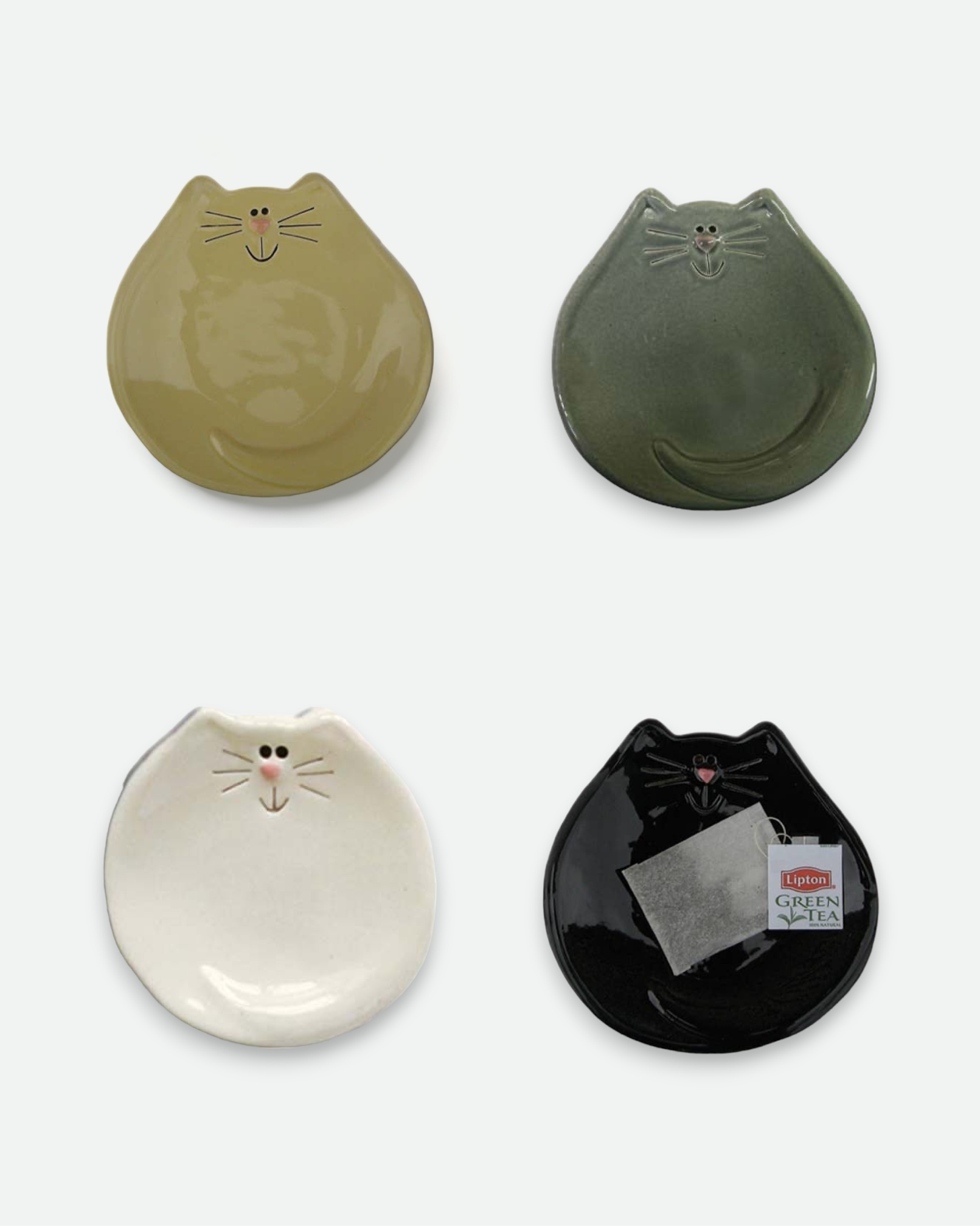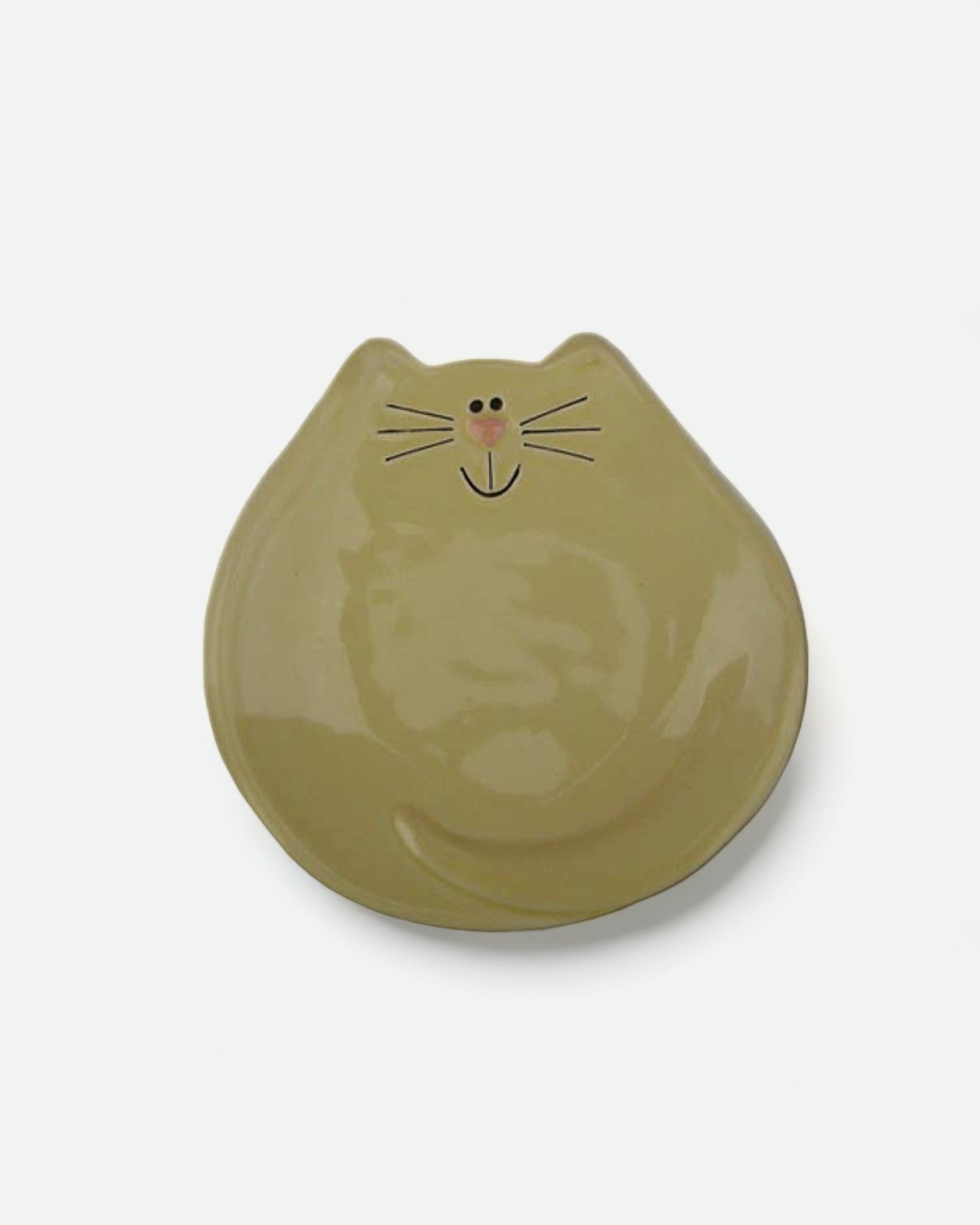 Handmade kitty dish by August ceramics studio in Whitinsville, MA. Hand painted with ceramic glazes. It is food and dishwasher safe and has many uses: little snacks, spoon-rest, soap dish, tea bag rest, ring dish, or even ashtray. You might find one that looks similar to your cutie at home!