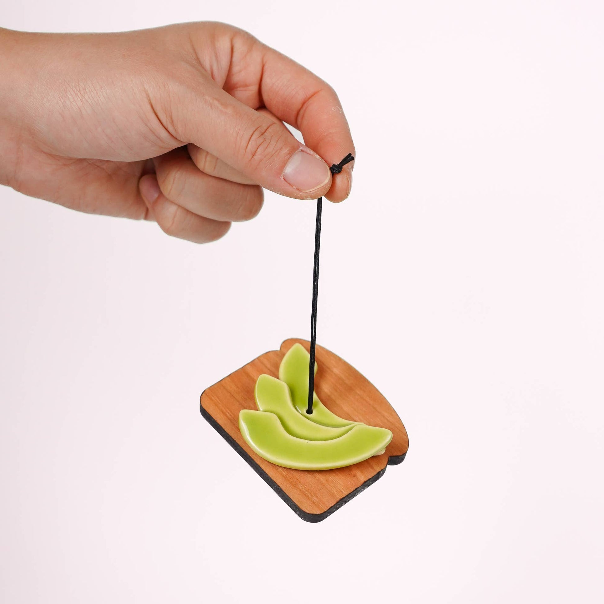 A unique ornament featuring ceramic avocado slices atop cherry wood toast!