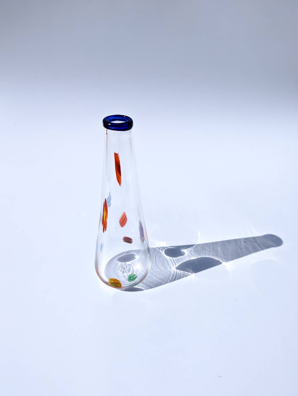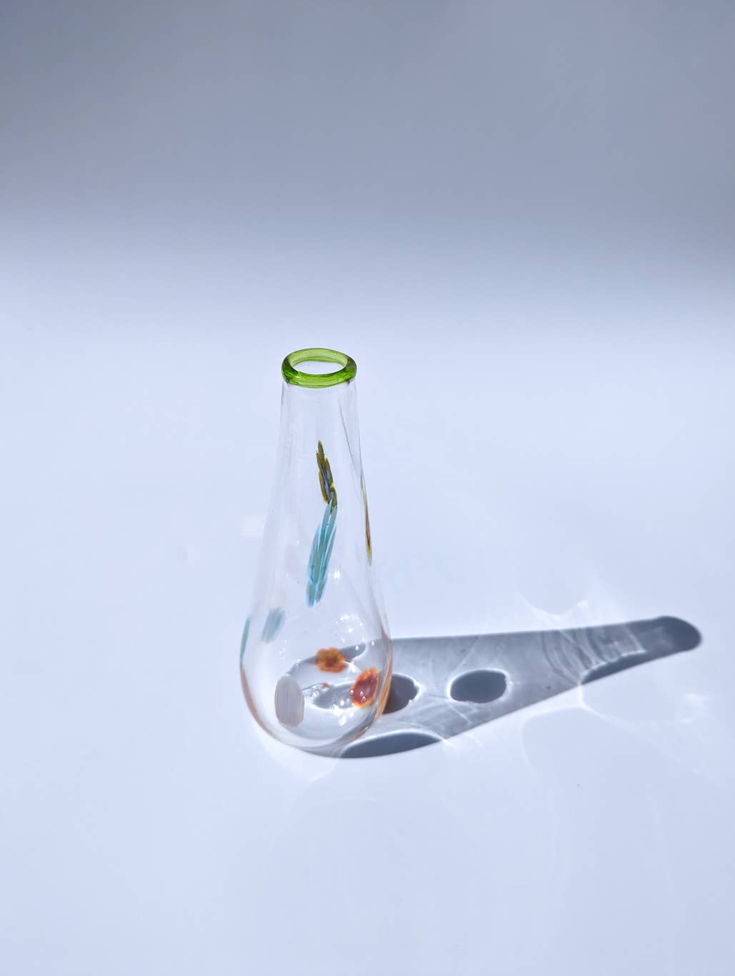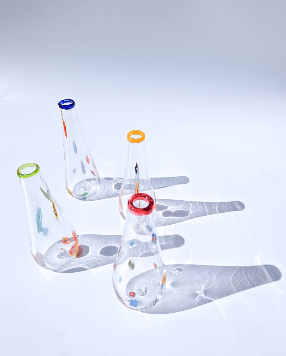 Hand-blown glass poppy bud vase by New Zealand glass artist Lauren Hunt. Perfect way to display those garden flowers you've been harvesting. Each vase is unique from the last. They are all colorfully displayed with a wrap a color around the rim.