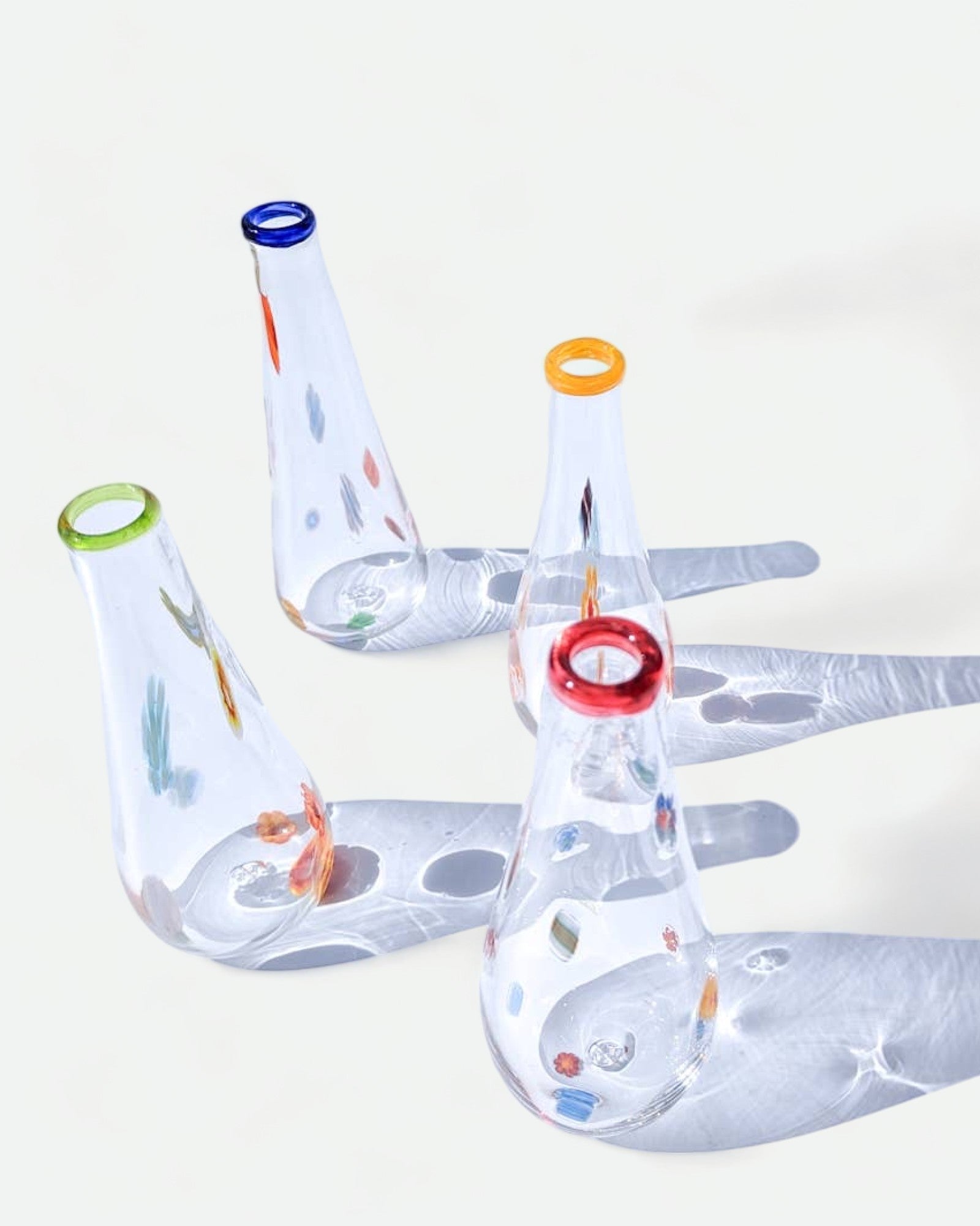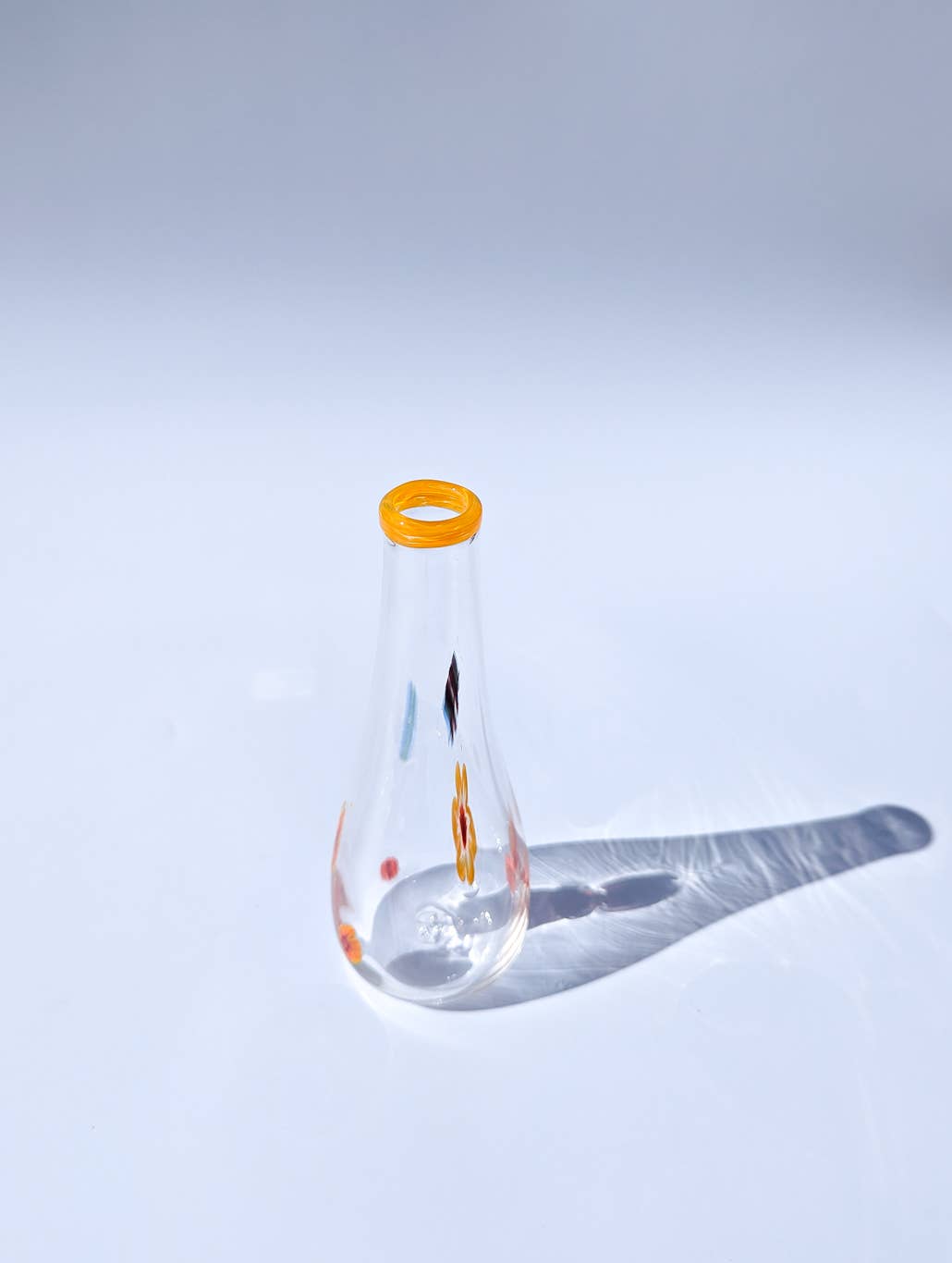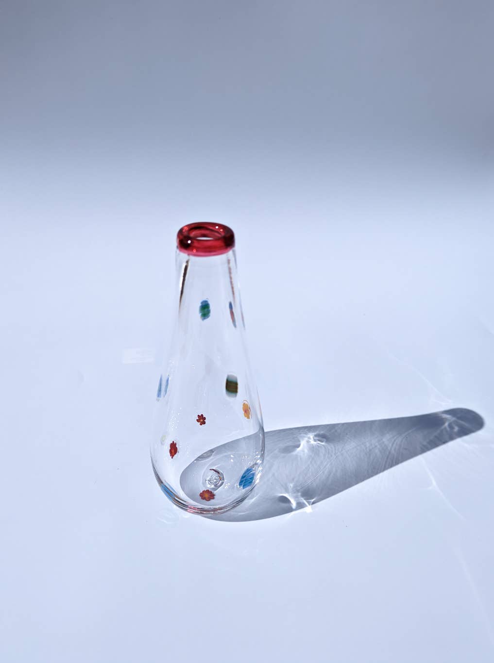 Hand-blown glass poppy bud vase by New Zealand glass artist Lauren Hunt. Perfect way to display those garden flowers you've been harvesting. Each vase is unique from the last. They are all colorfully displayed with a wrap a color around the rim.