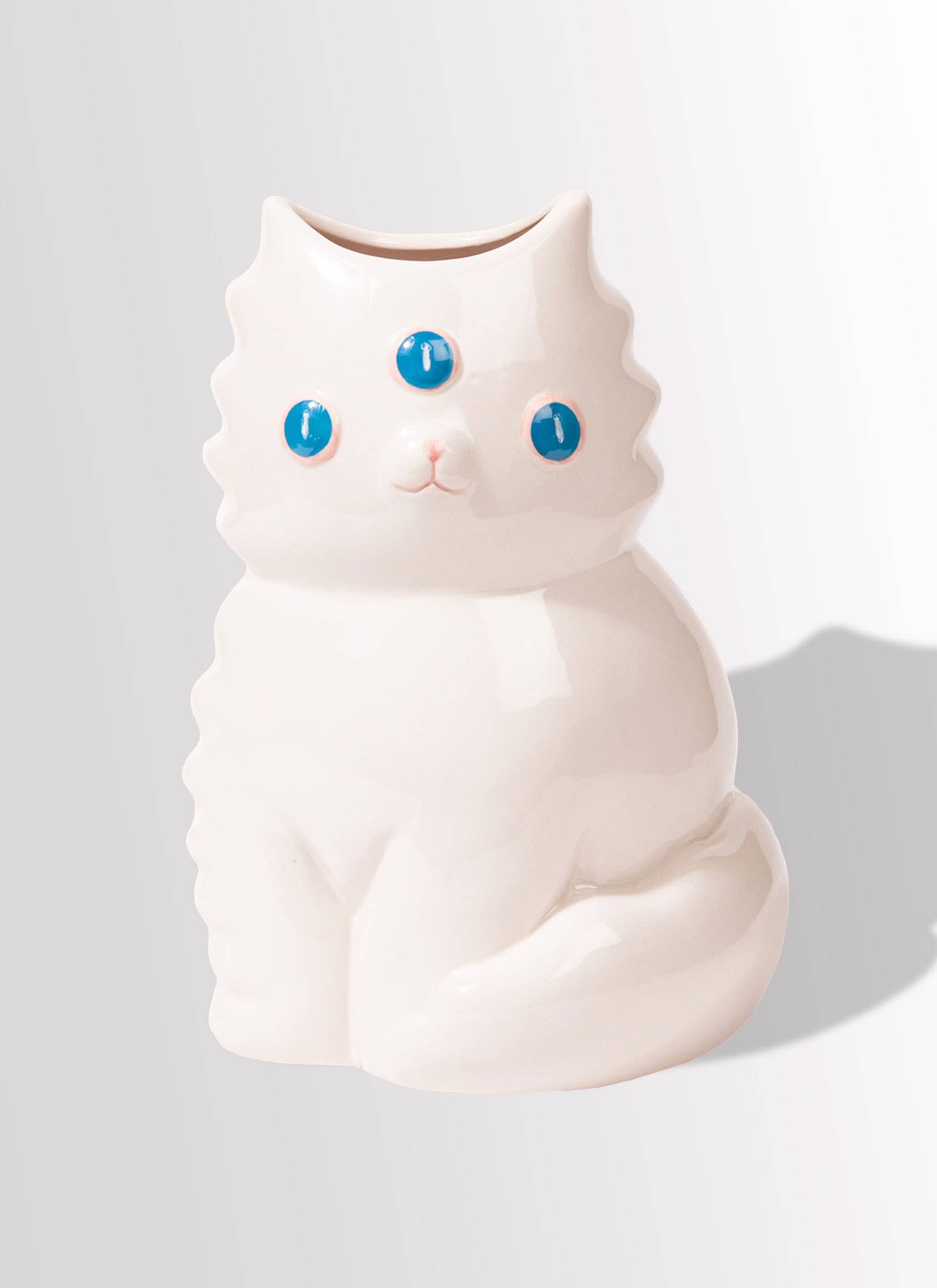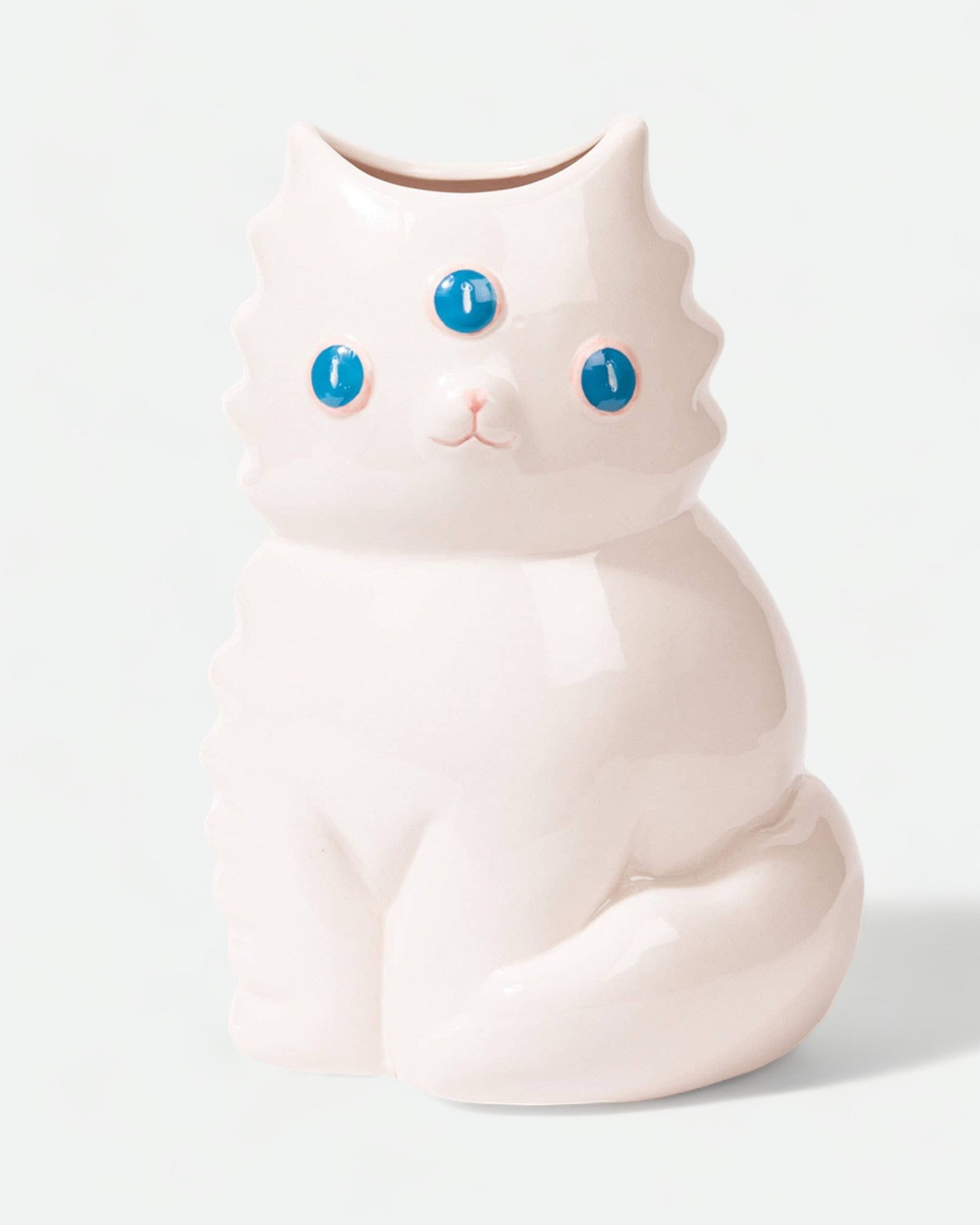 Handmade Blanco the Cat ceramic vase by Mexican contemporary artist Valfré. Crafted to display your favorite flowers, hold your art supplies, or make-up brushes.