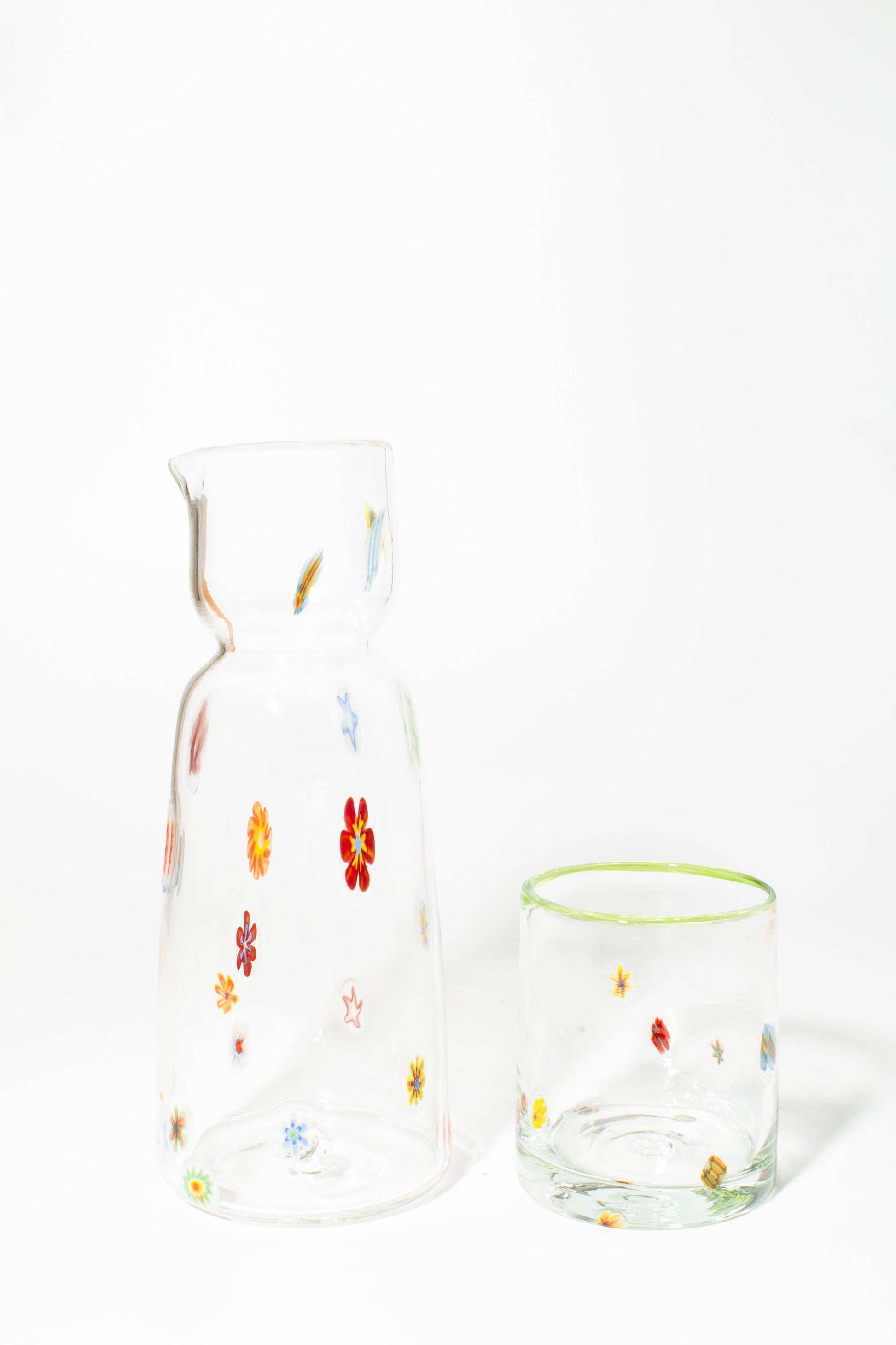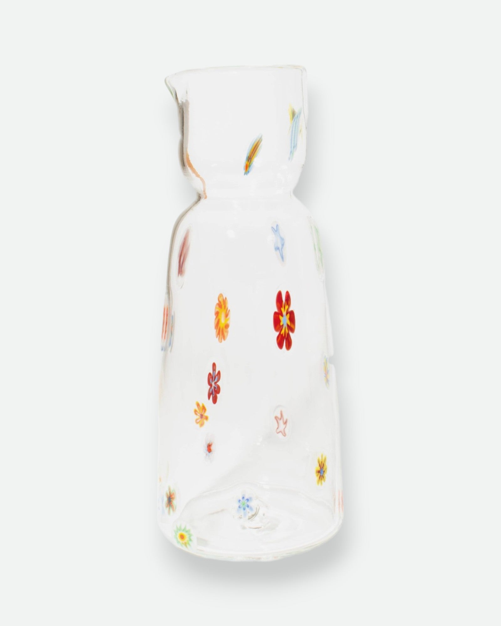 Introducing the Cassie Carafe—a stunning hand-blown glass carafe that effortlessly combines elegance with artistry. Each Cassie Carafe is a unique piece, featuring intricate, decorative glass flowers embedded within its design. These delicate floral accents add a touch of natural beauty, making the carafe not just a functional vessel but also a work of art. Perfect for serving water, wine, or any beverage, the Cassie Carafe is both a practical and visually captivating addition to your table setting. Its handcrafted nature ensures that no two pieces are exactly alike, offering a one-of-a-kind experience in both form and function. Elevate your dining experience with the Cassie Carafe—a true masterpiece in glassware.