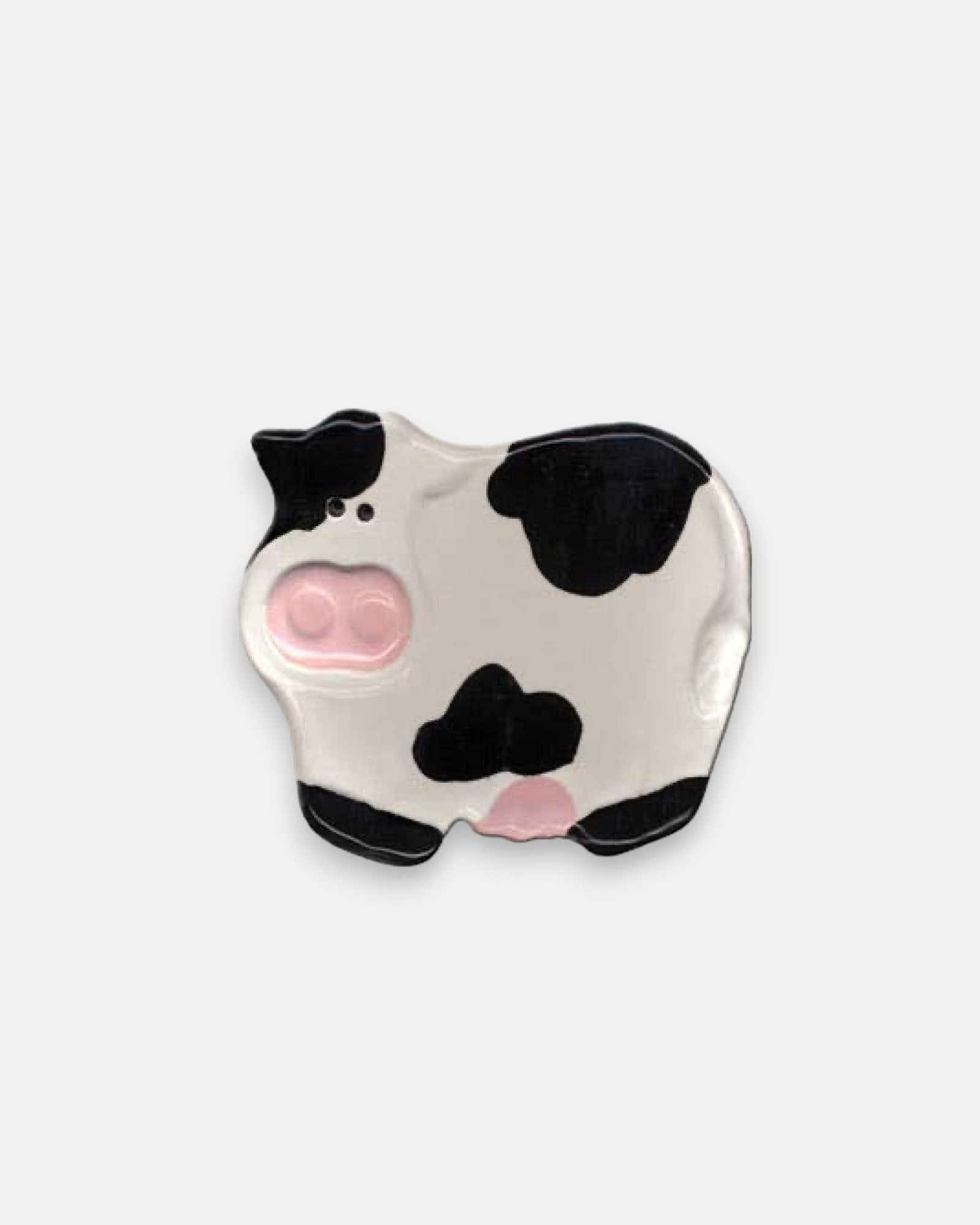 Handmade mini cow dish by August ceramics studio in Whitinsville, MA giving you a sense of farm life. Hand painted with ceramic glazes. It is food and dishwasher safe and has many uses: sauce, spoon-rest, tea bag rest, ring dish, etc.