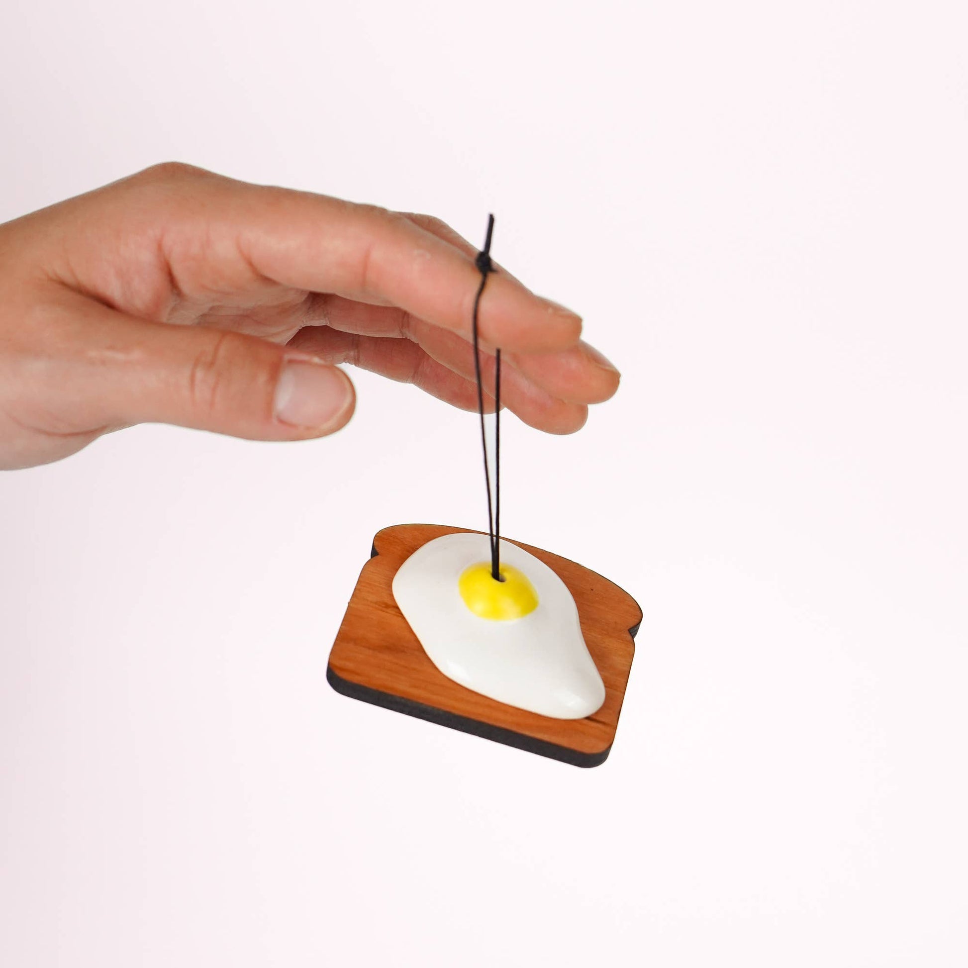 A unique ornament featuring a ceramic egg atop cherry wood toast!