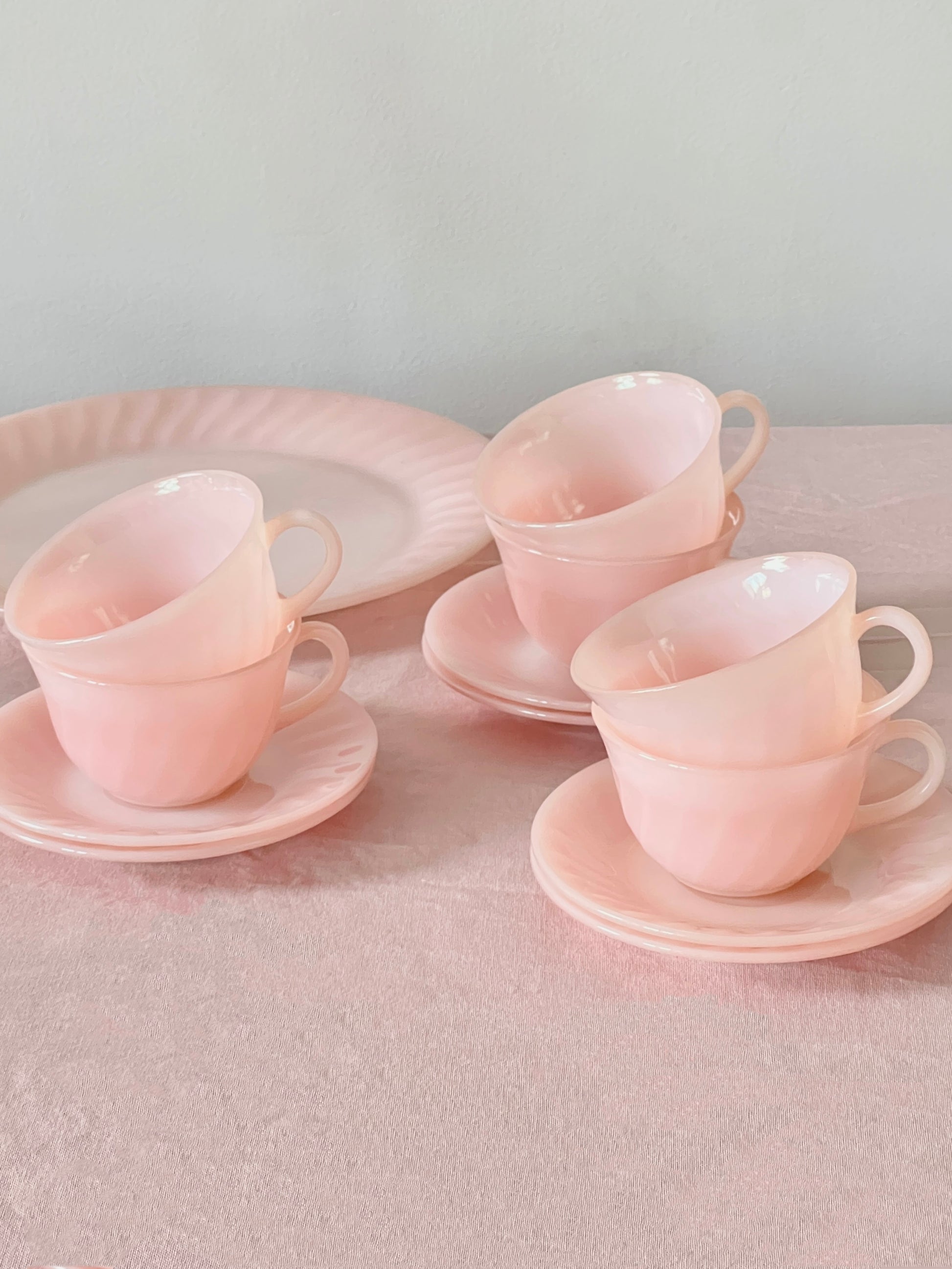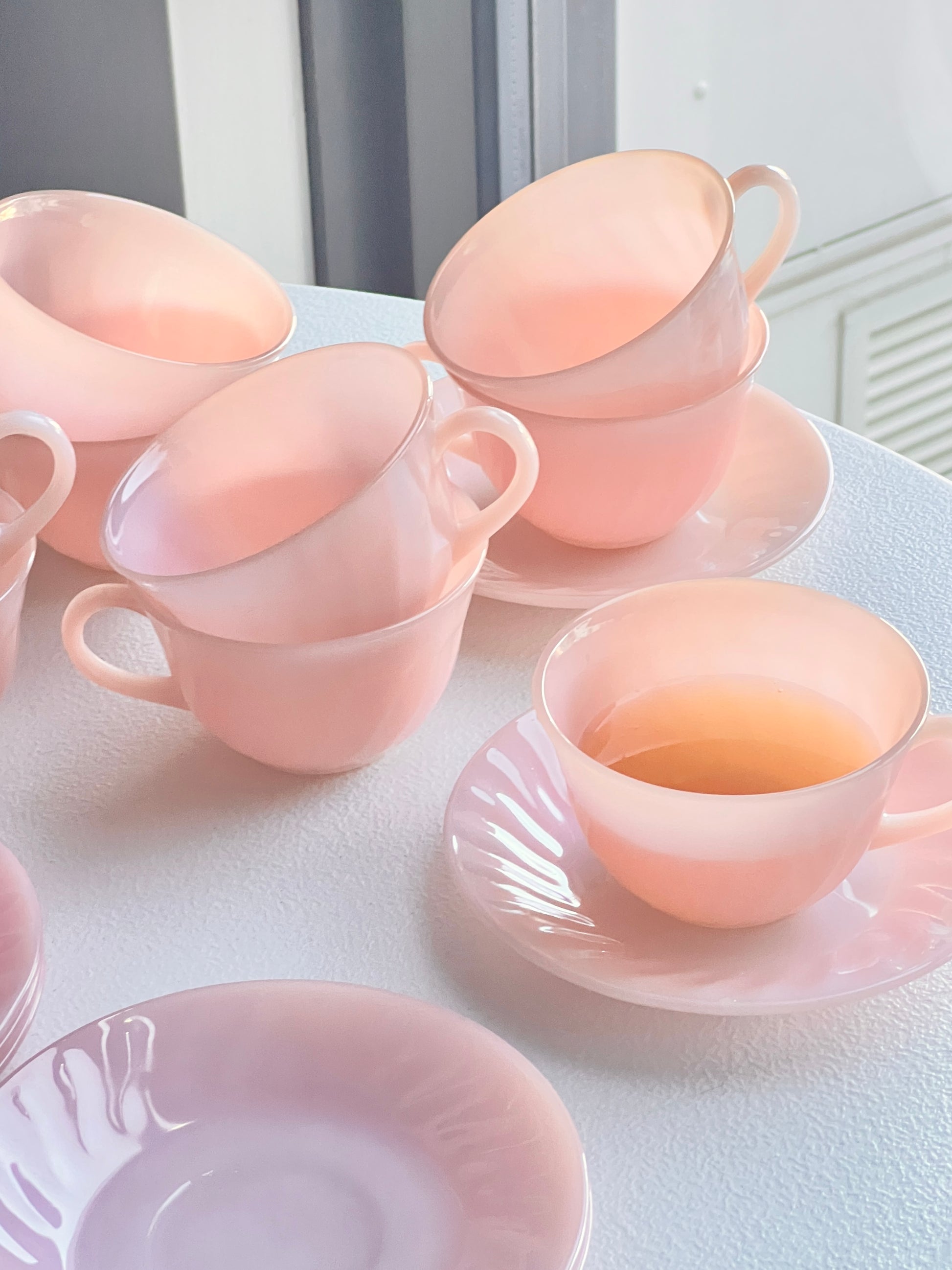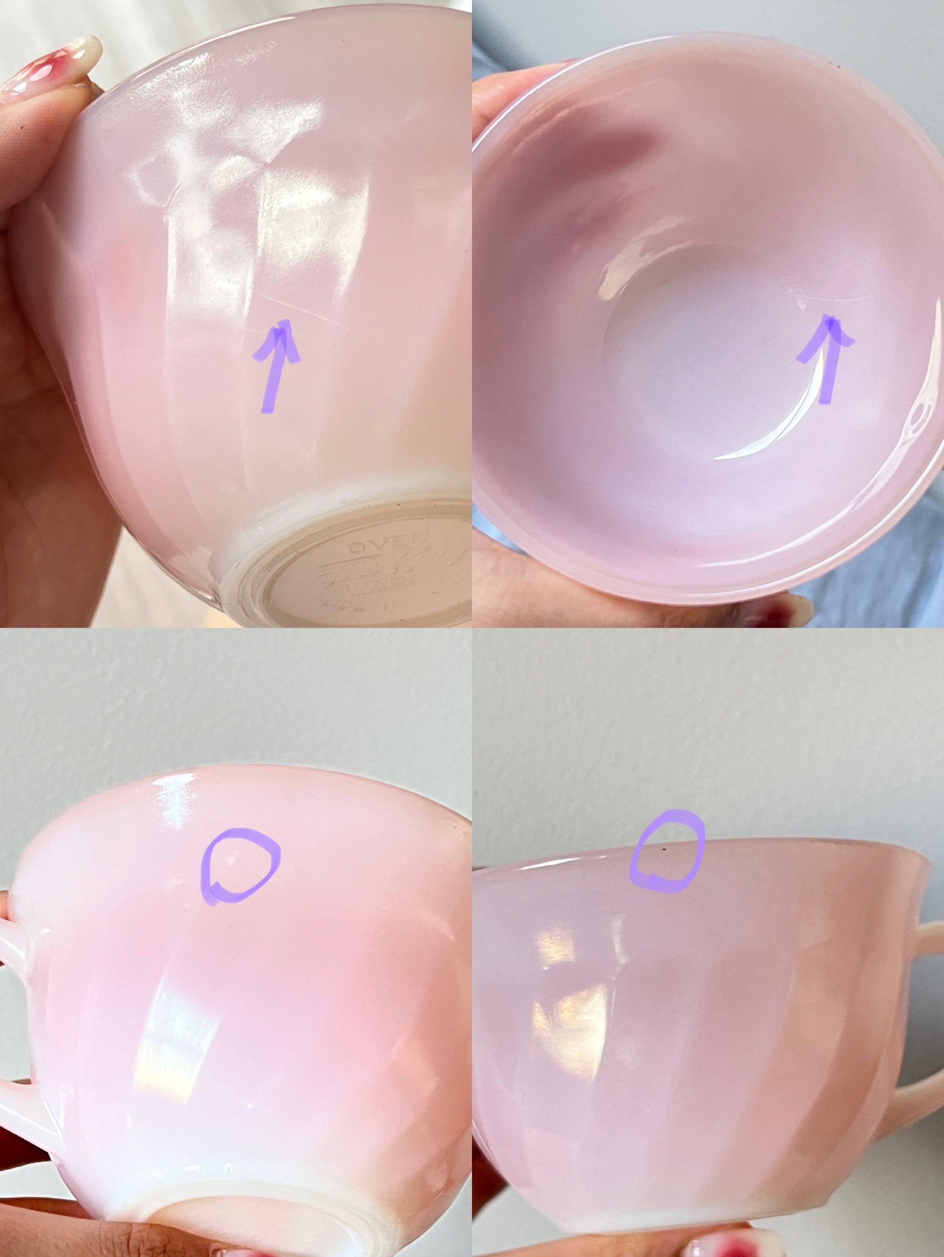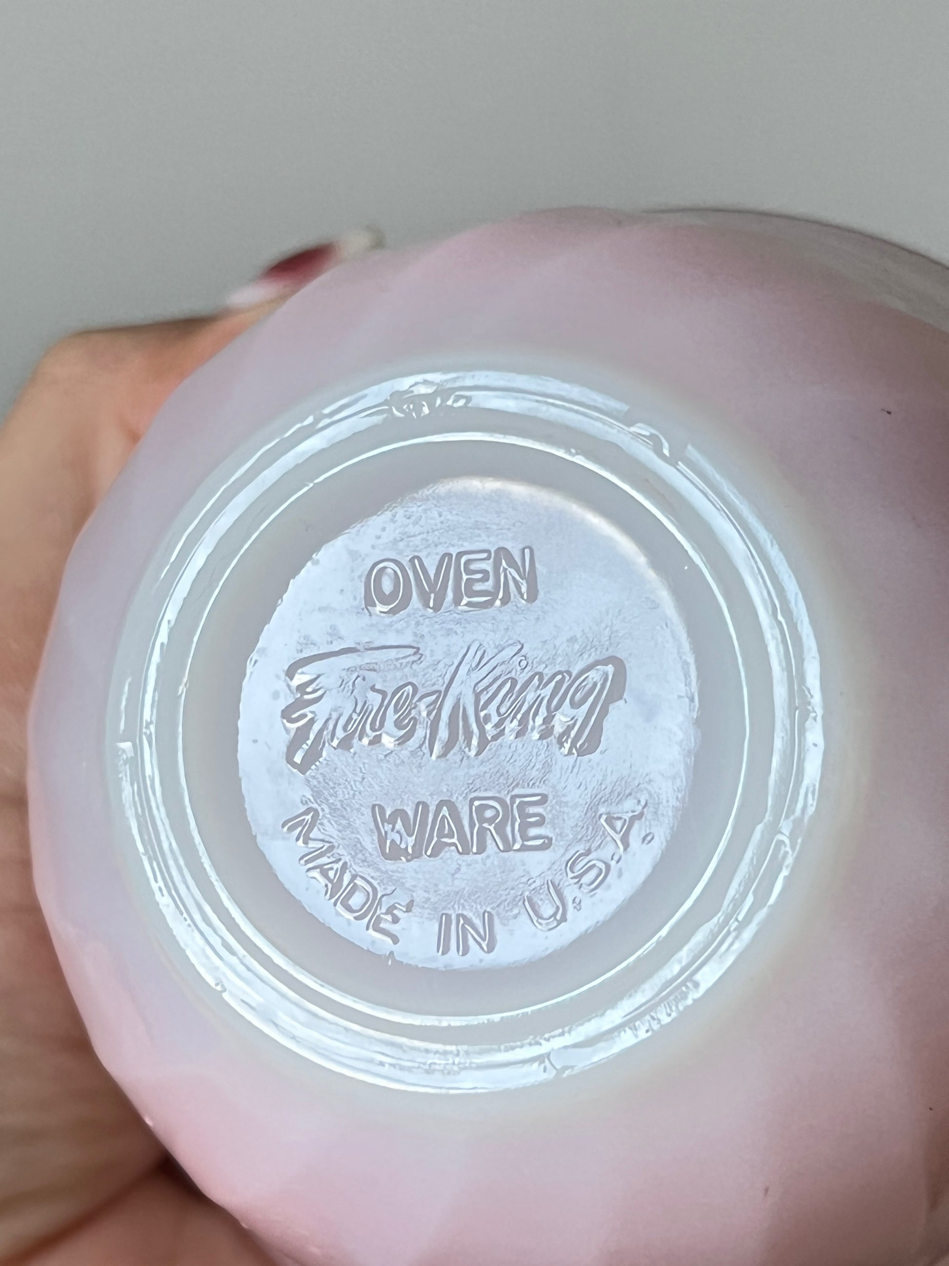 Rare Fire King pink Swirl pattern, translucent milk glass showing a jade-like texture and feeling, which is really hard to reproduce nowadays. No signs of use, vivid and even pink color.