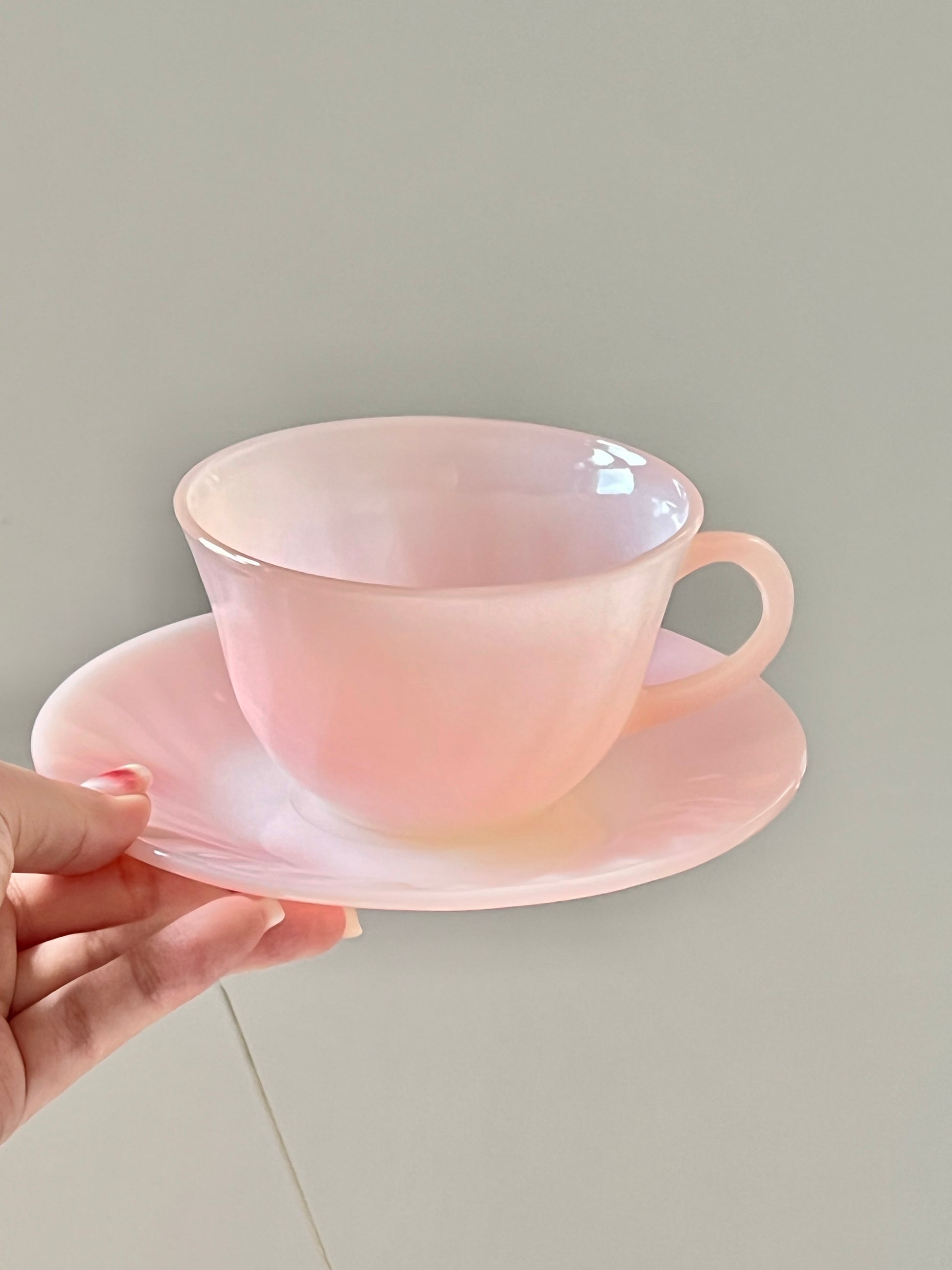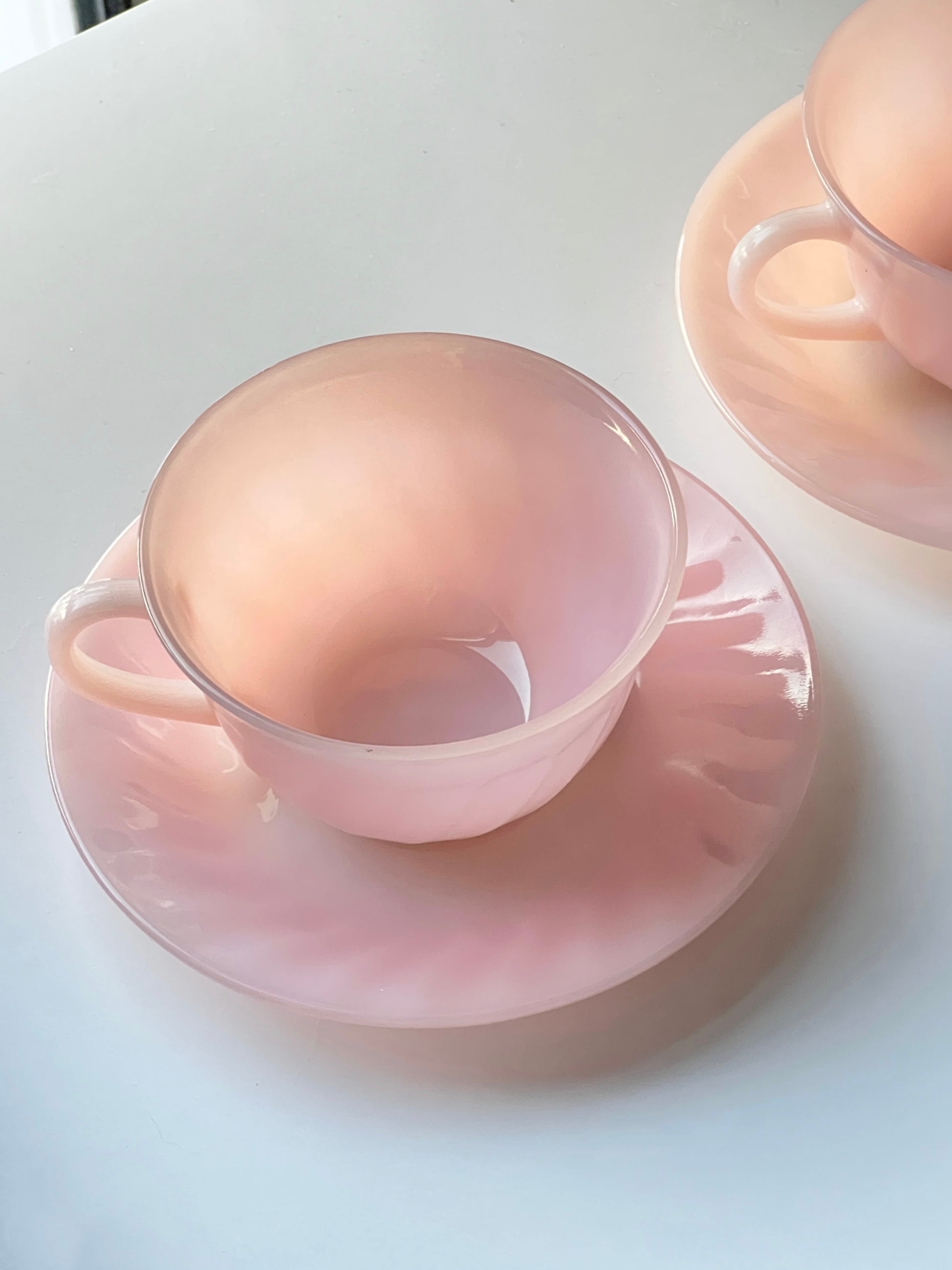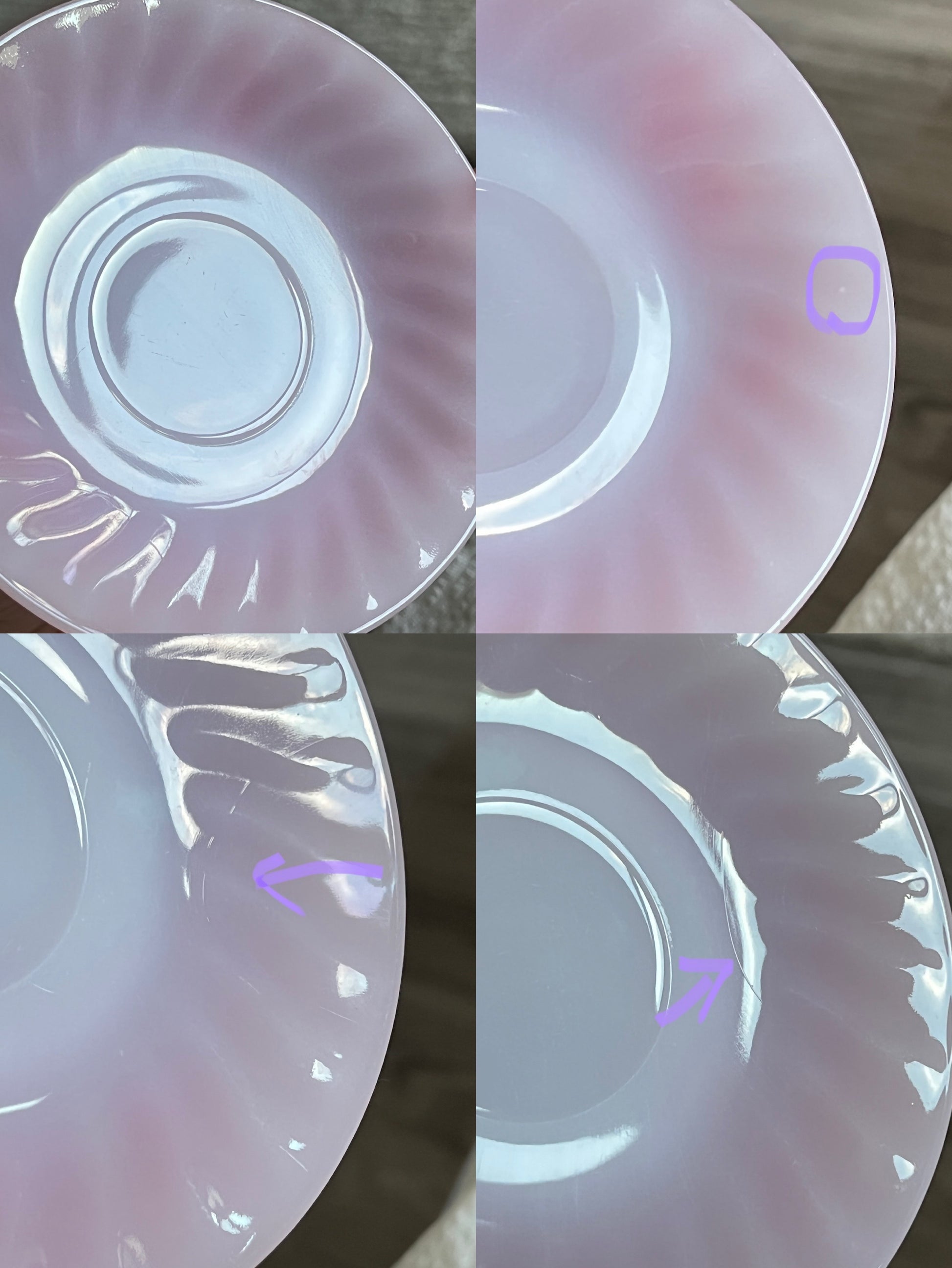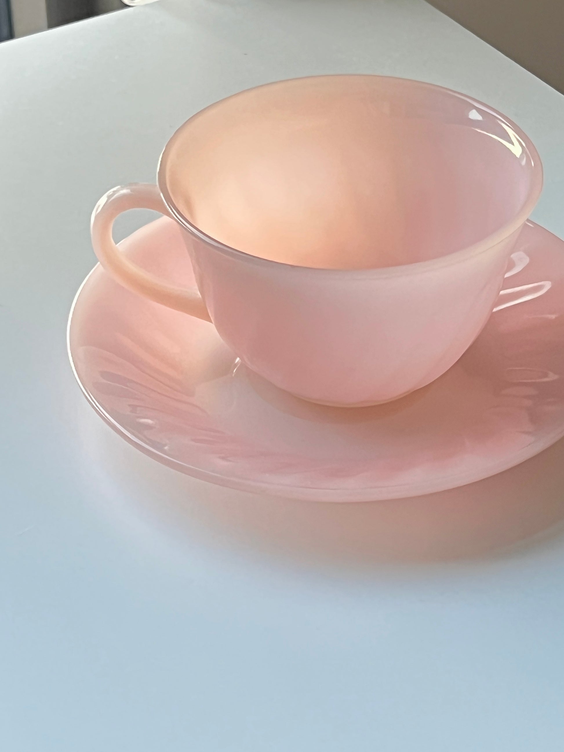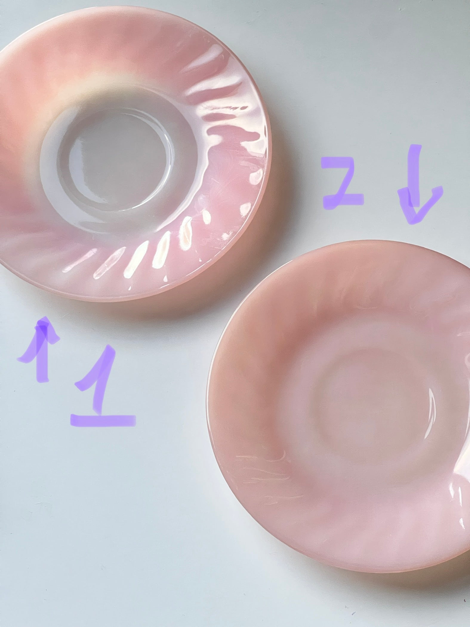 Rare Fire King pink Swirl pattern, translucent milk glass showing a jade-like texture and feeling, which is really hard to reproduce nowadays. No signs of use, vivid and even pink color.
