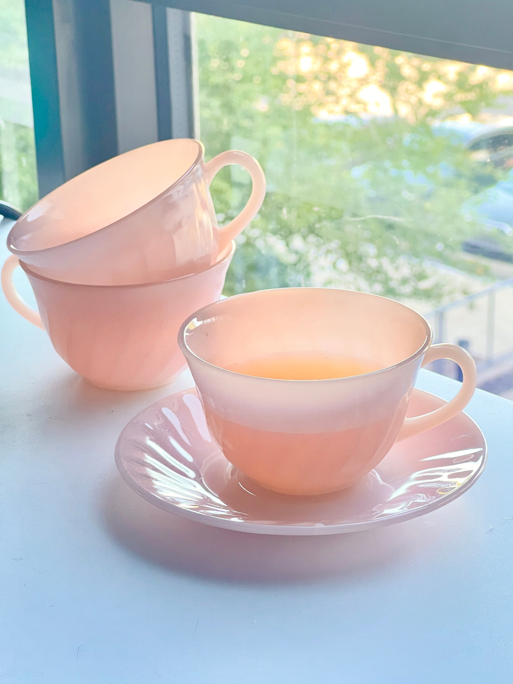 Condition: Like New (No signs of use and fading that often found on sets of this age, each has 1 or 2 very small marks from manufacturing, which is normal for vintage/Fire King glass, not noticeable under normal light and for normal use. Saucers have 2 color variants, both matching well with the cups. See pictures for reference. )