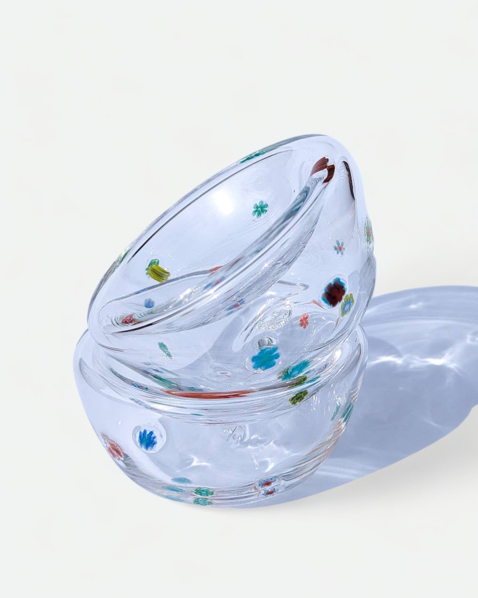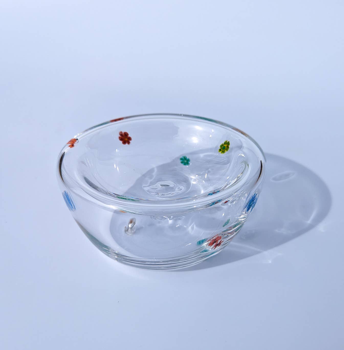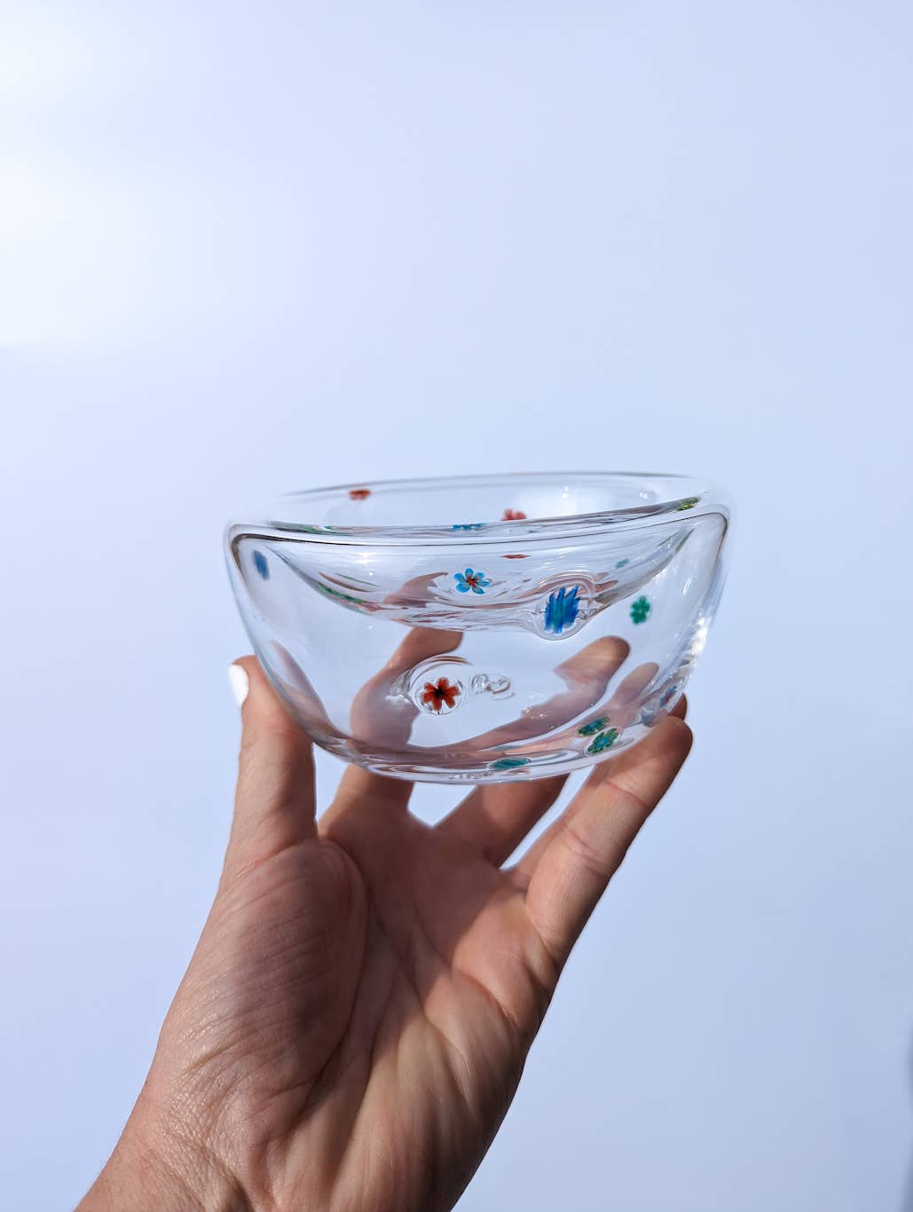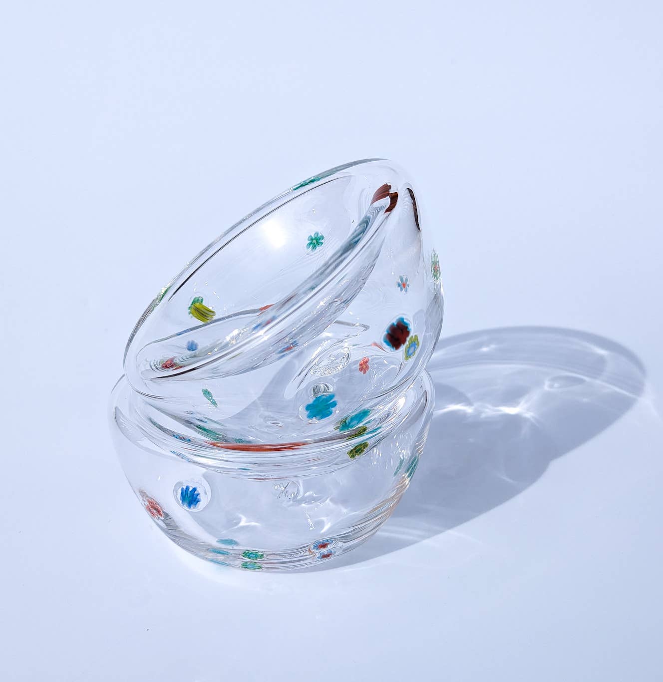Hand-blown double-wall glass bowl by New Zealand glass artist Lauren Hunt. Inspired by traditional Venetian color applications, these hand made bowls will bring life to any room. Adorned with colorful glass flowers, called murrine, each bowl is uniquely decorated yet equally beautiful.