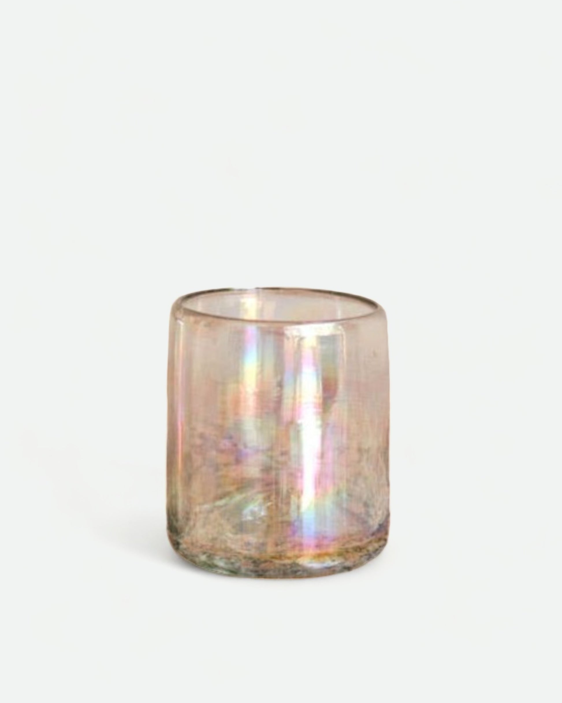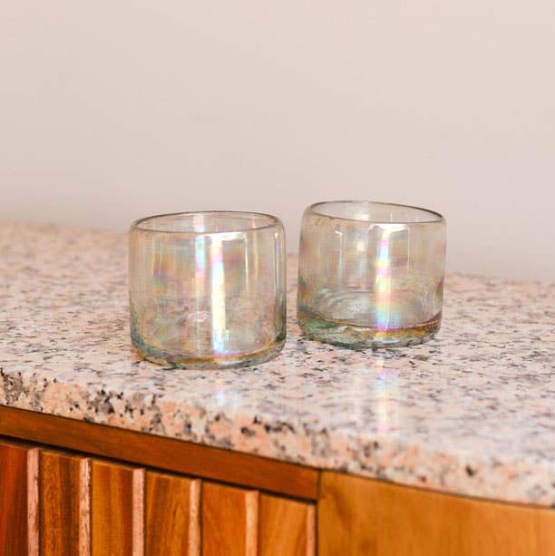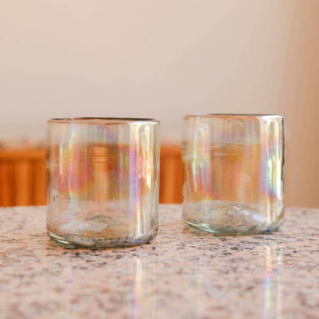Hand-blown glass tumbler made in Guadalajara, Mexico. Clear glass with a sheen of luster. Price for 1 glass.