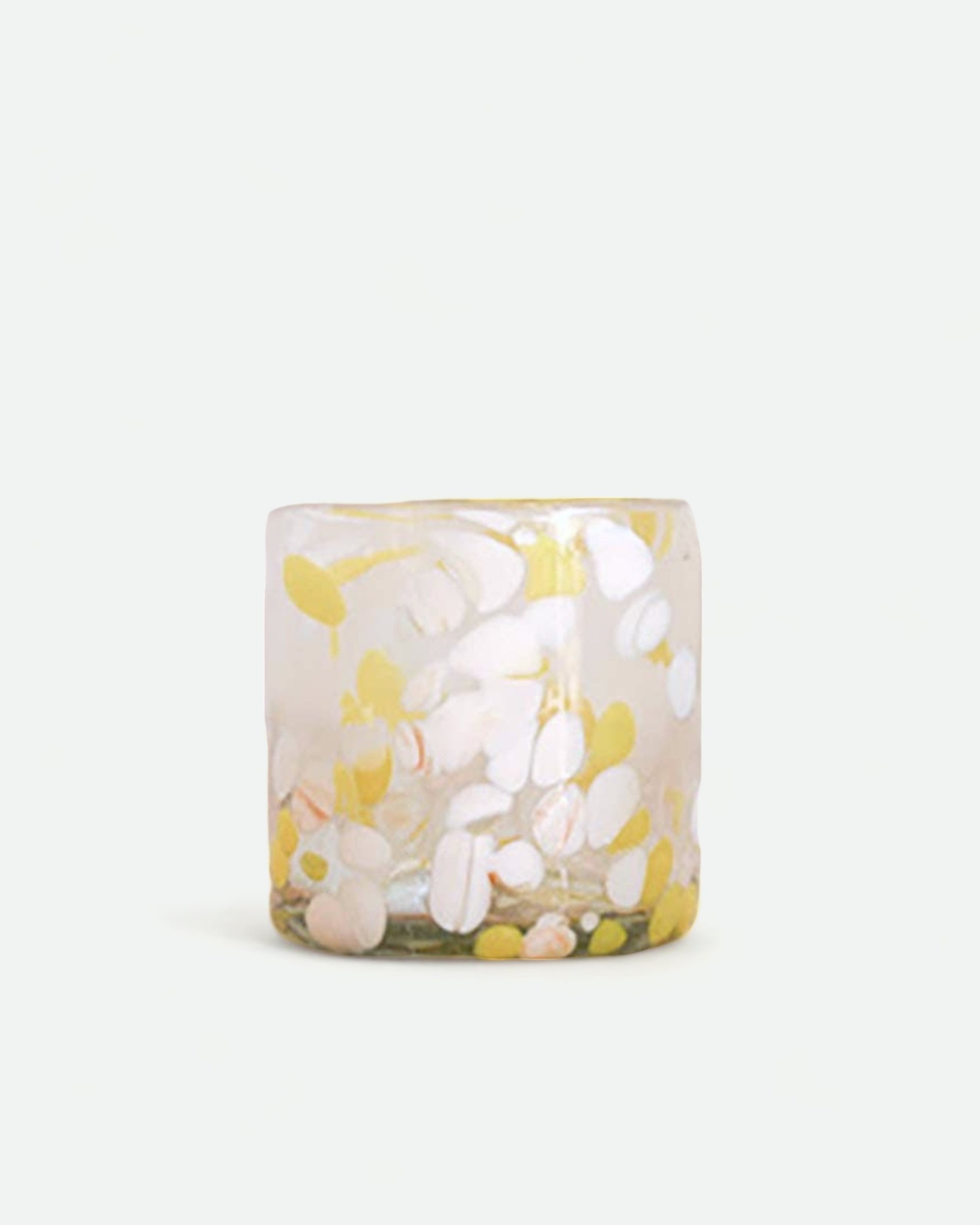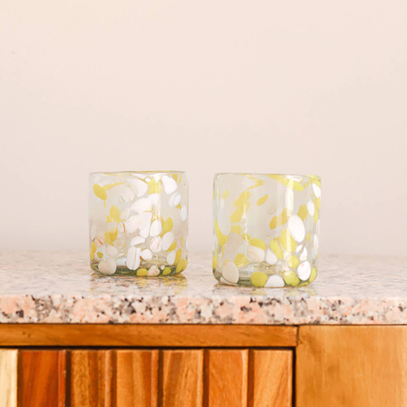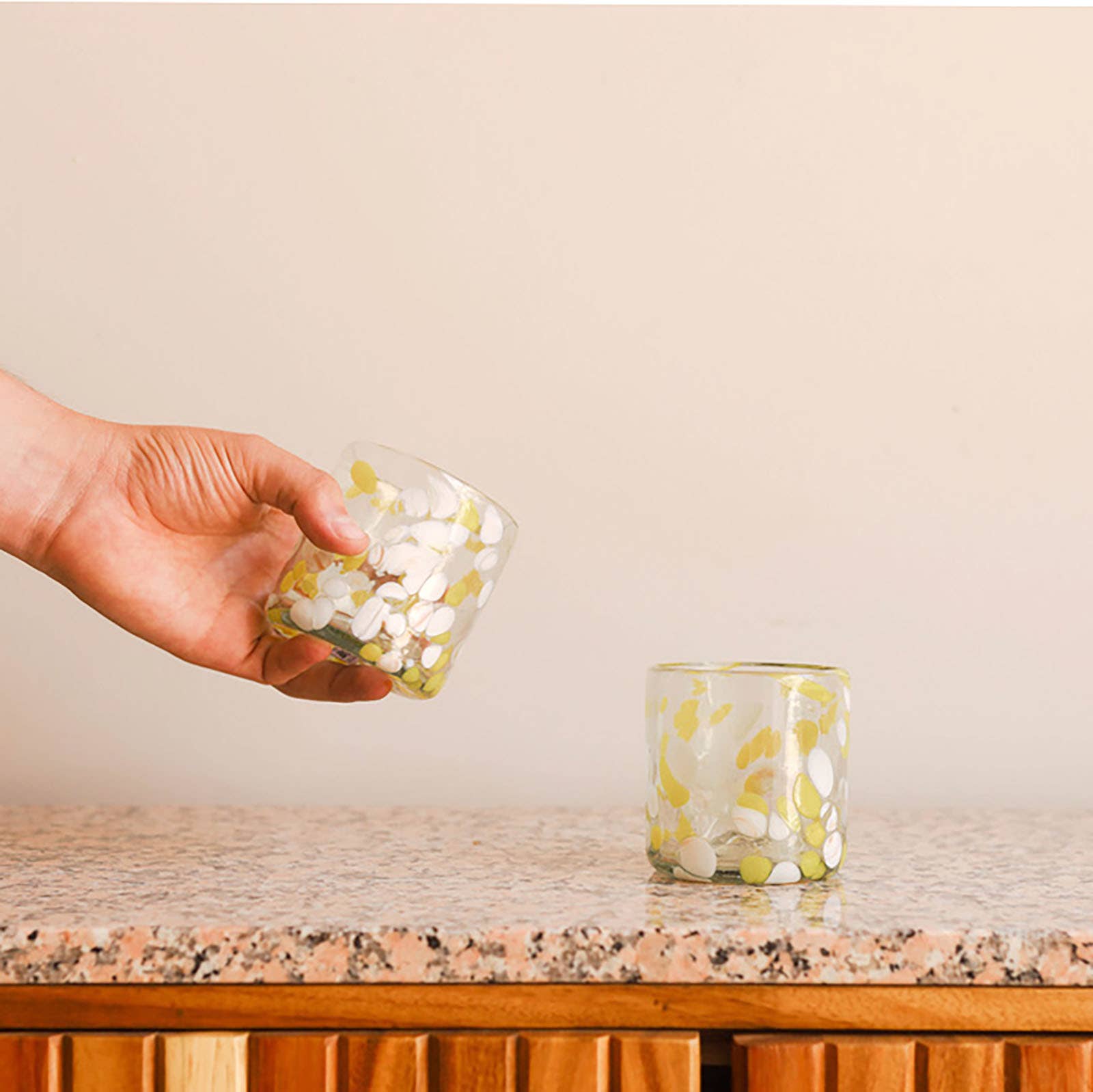 Hand-blown glass tumbler made in Guadalajara, Mexico. The pattern of white and yellow is unique for each glass, no two are exactly alike. Price for 1 glass.