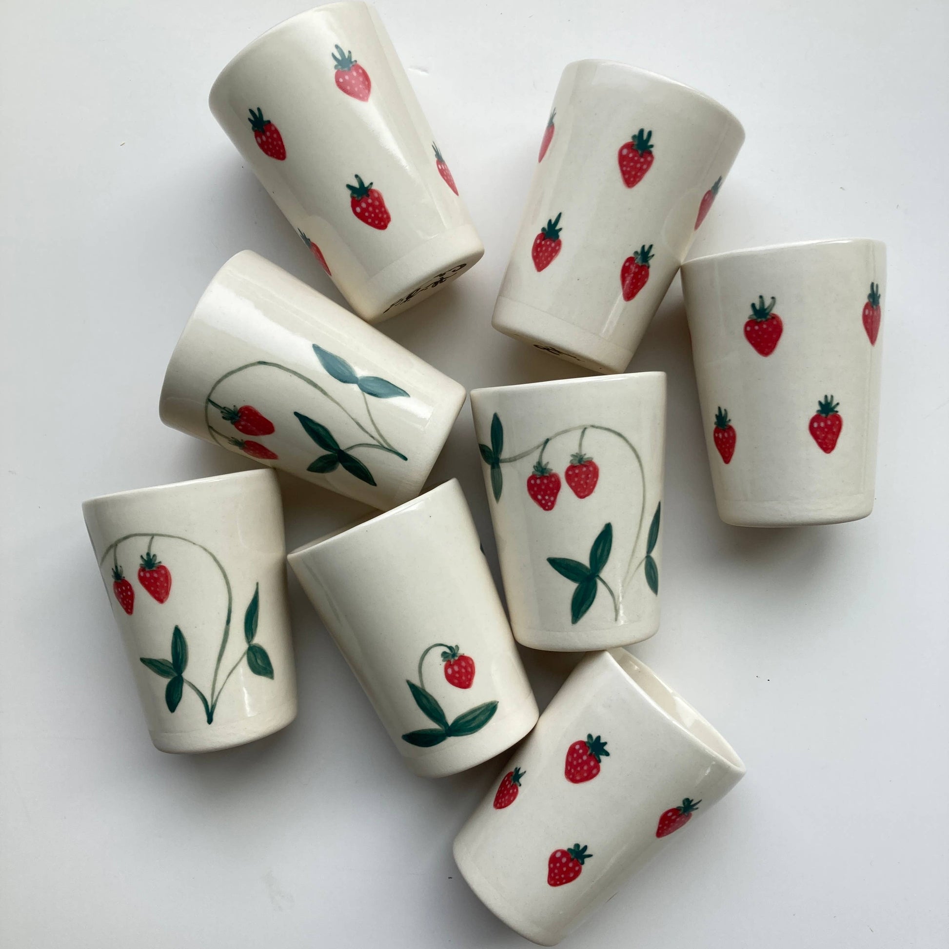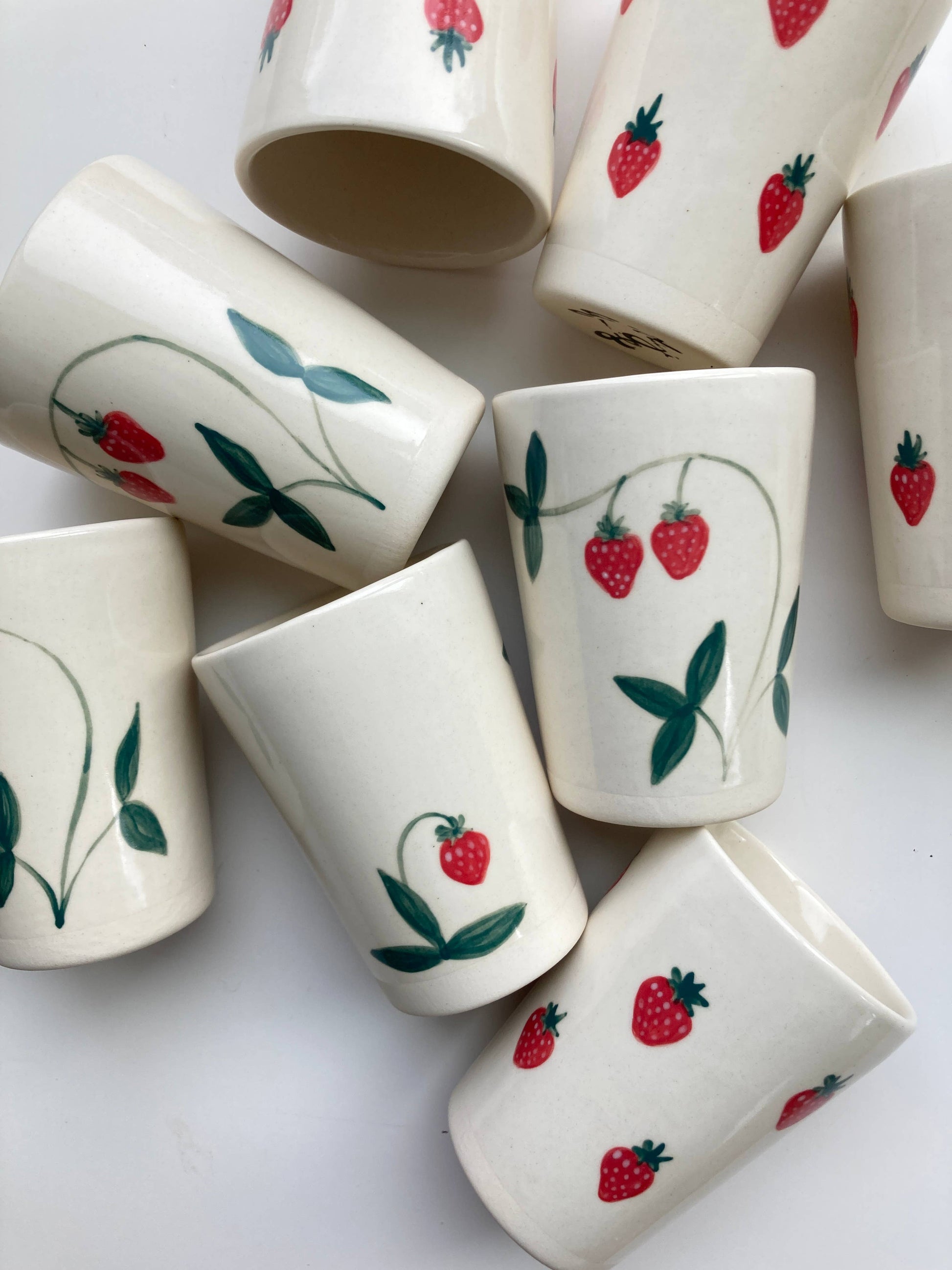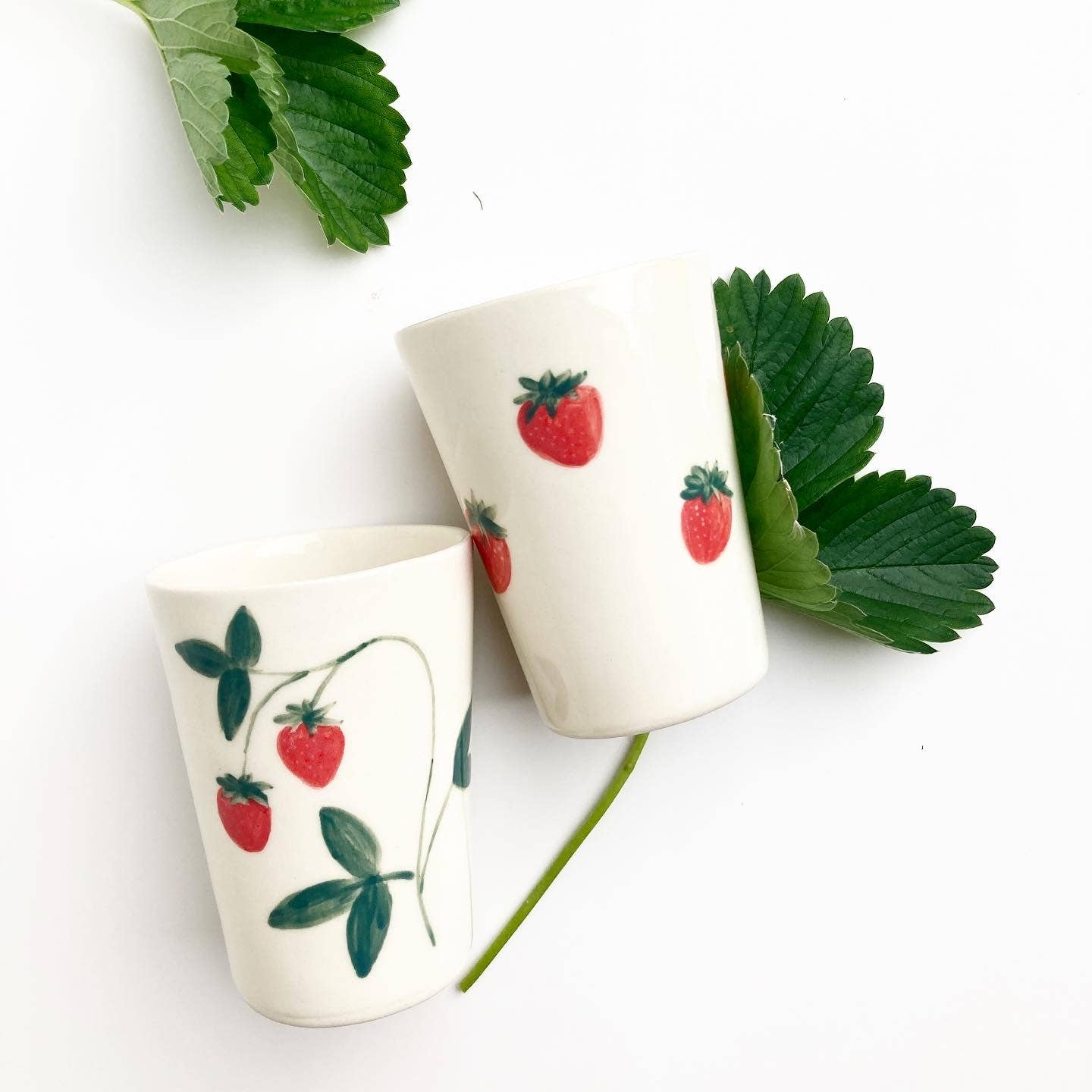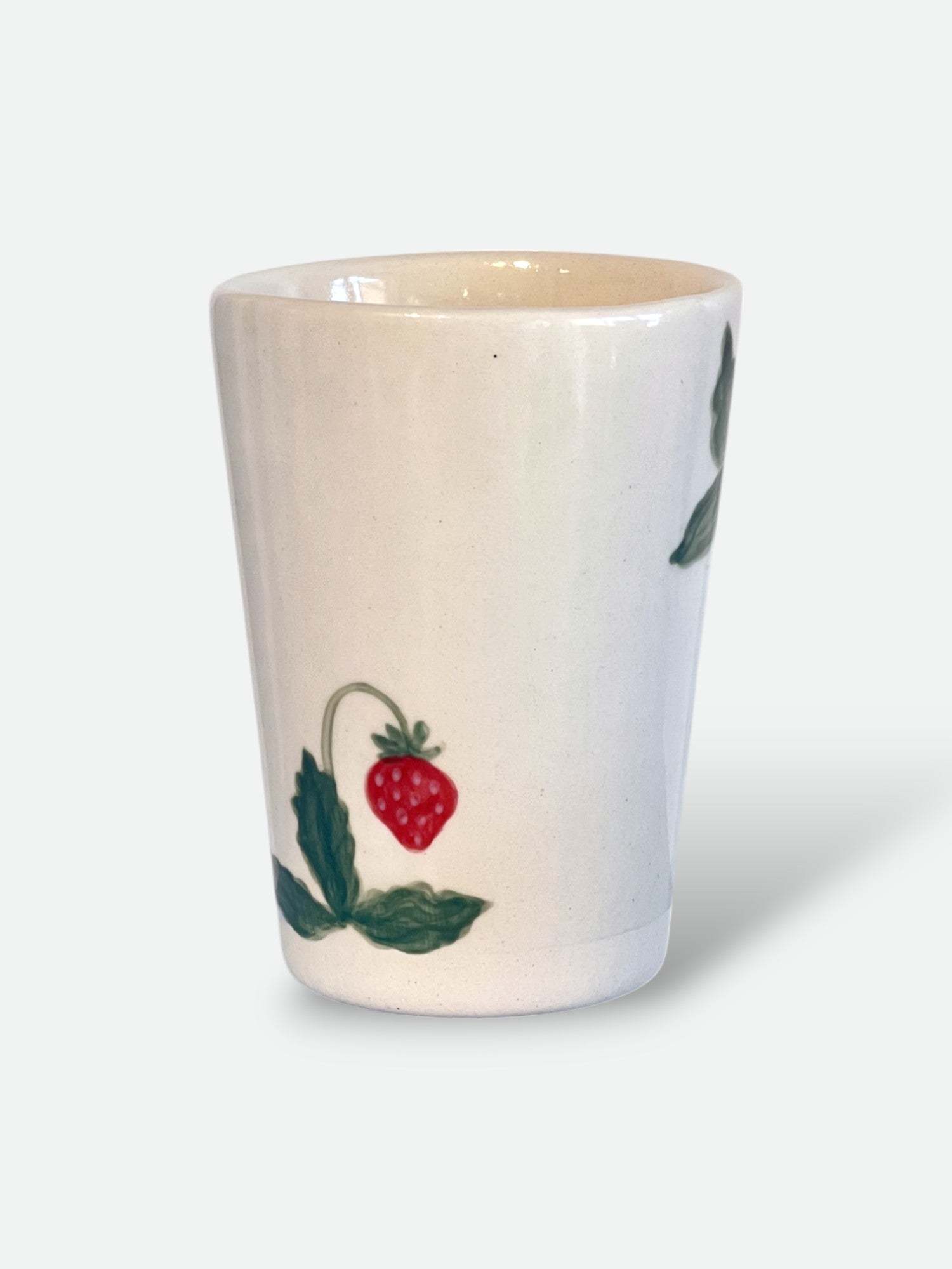 Slip casted ceramic cups in dover white (off white) and hand painted with strawberries. Each one a little different. These hand painted cups have two options one with leaves and one with simple strawberries.