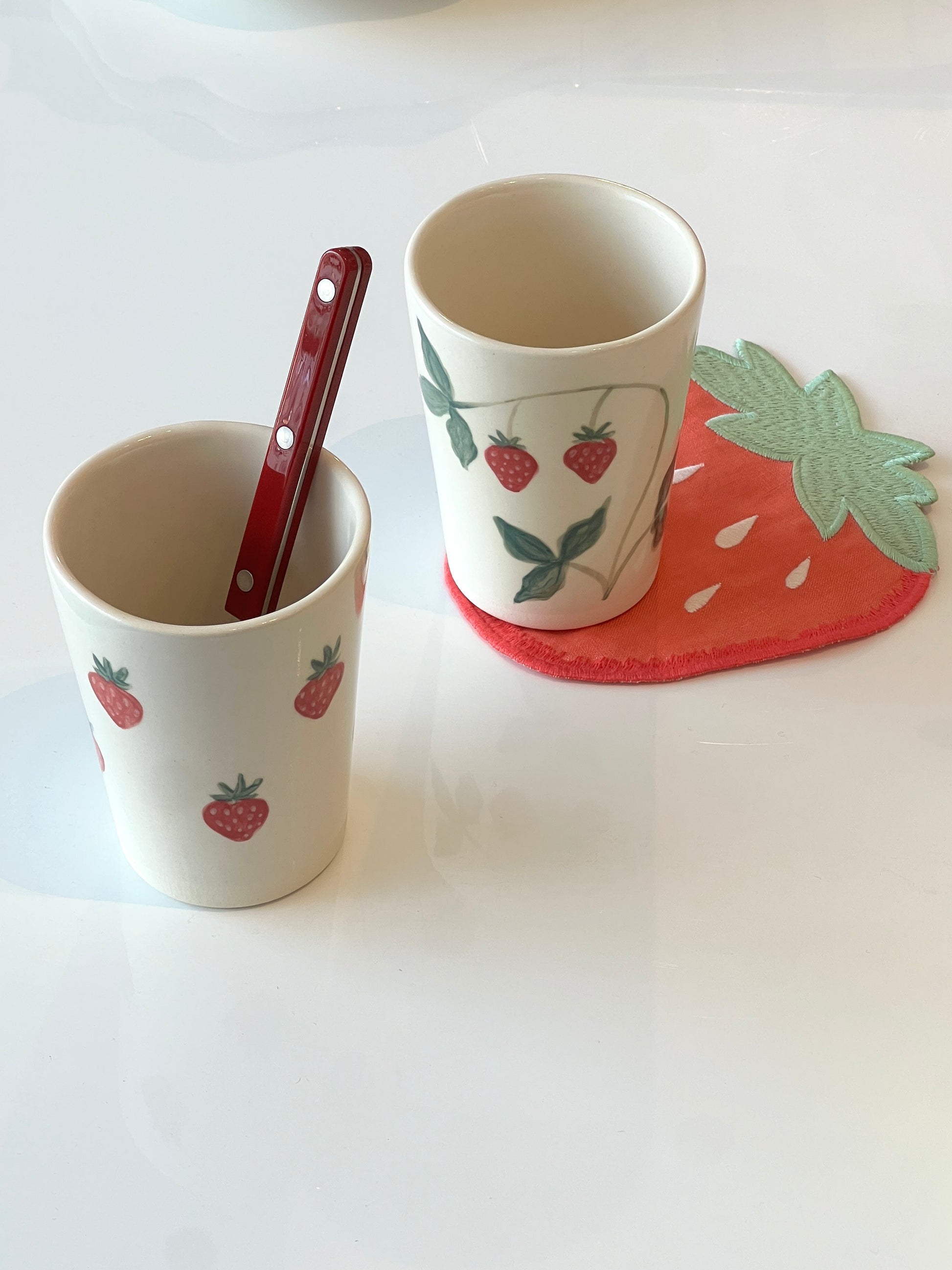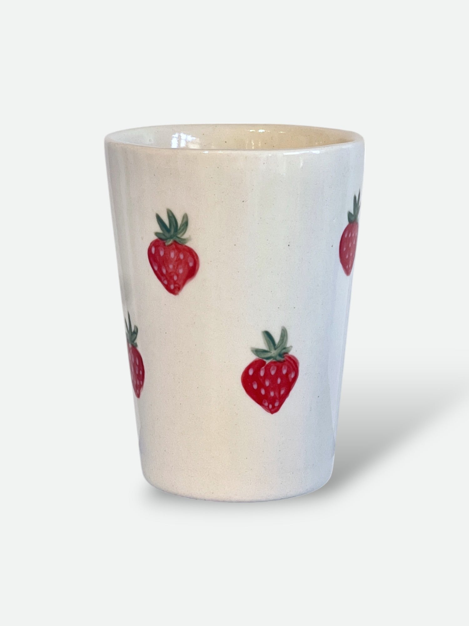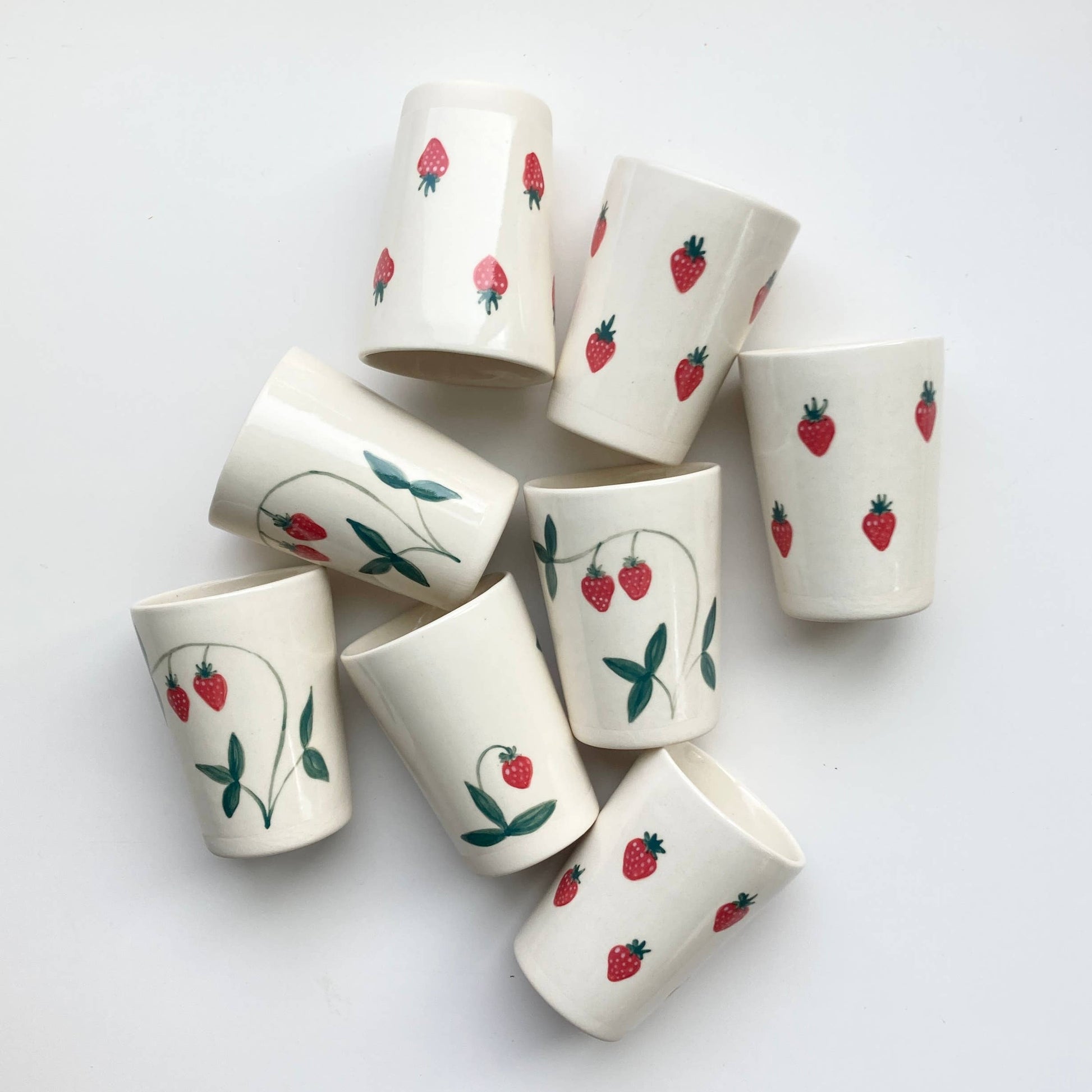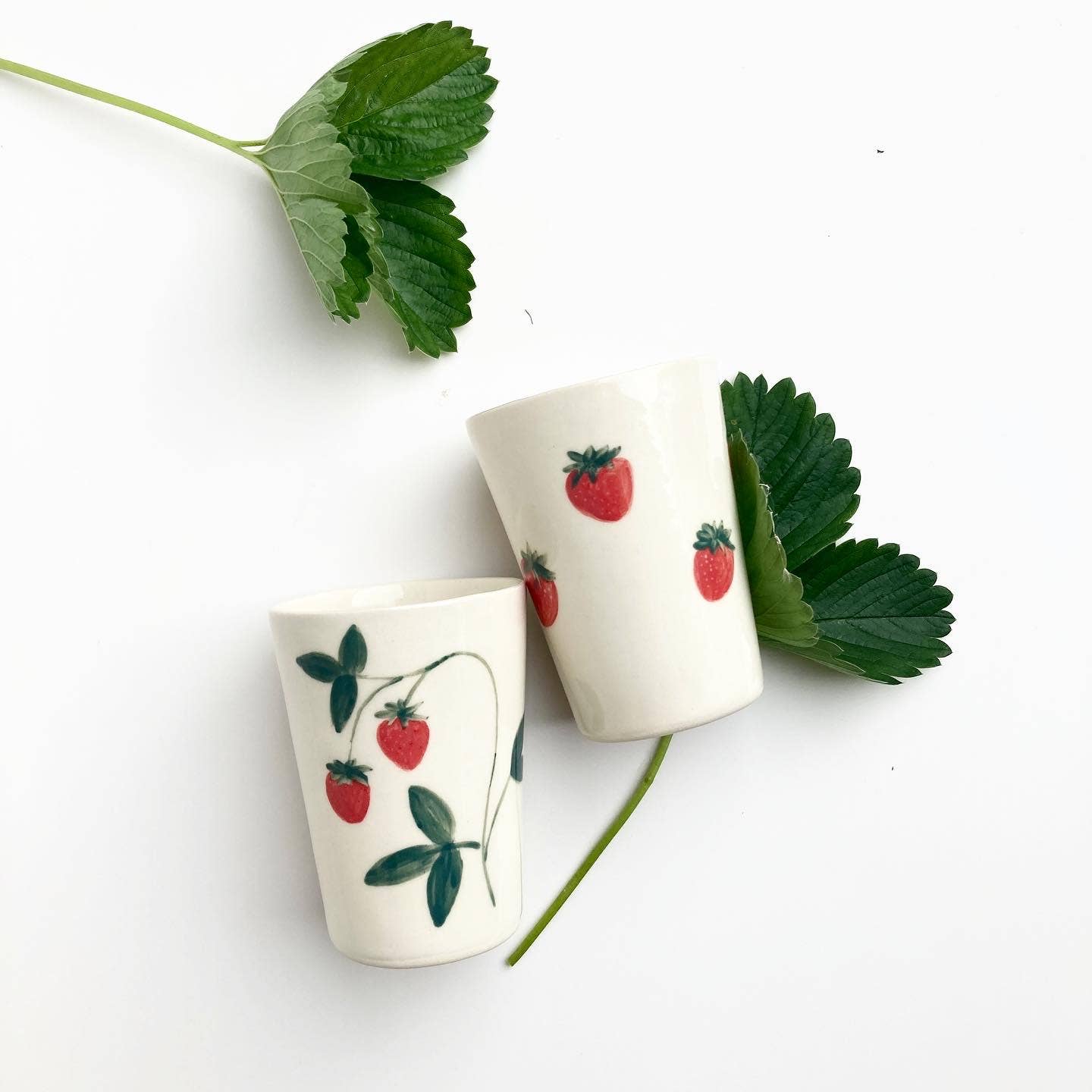 Slip casted ceramic cups in dover white (off white) and hand painted with strawberries. Each one a little different. These hand painted cups have two options one with leaves and one with simple strawberries.