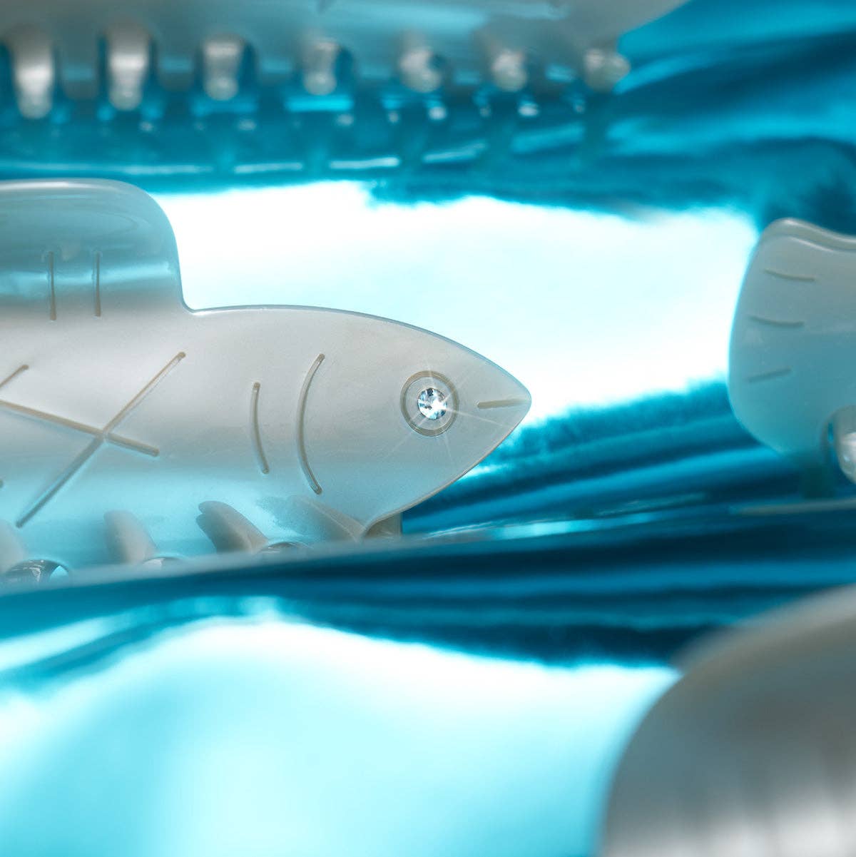 Whether you're a fan of pickled herring or just enamored by the sea, this claw is sure to quickly become a favorite in your collection! Featuring a claw that gently and securely wraps around and holds lots of hair, this sweet silvery fish brings just the right amount of sparkle.