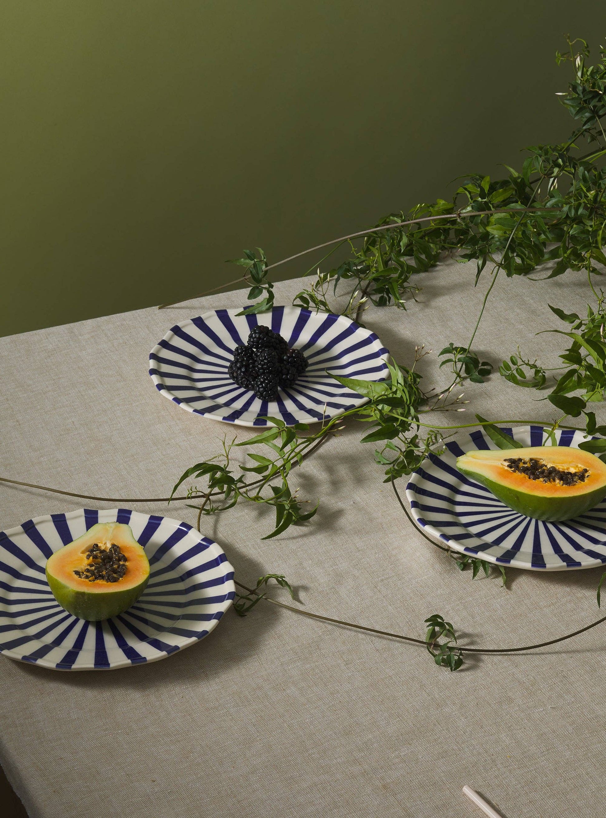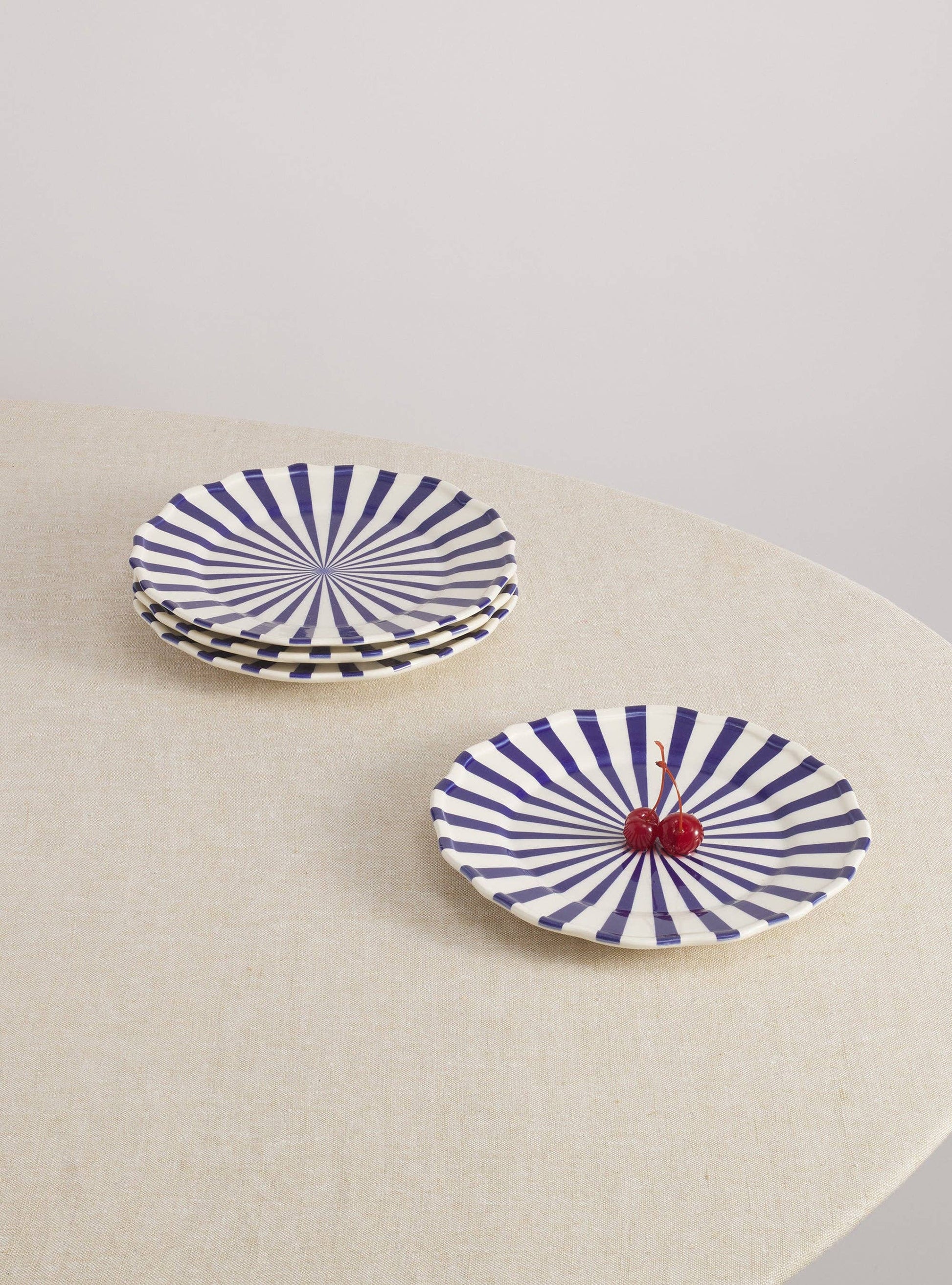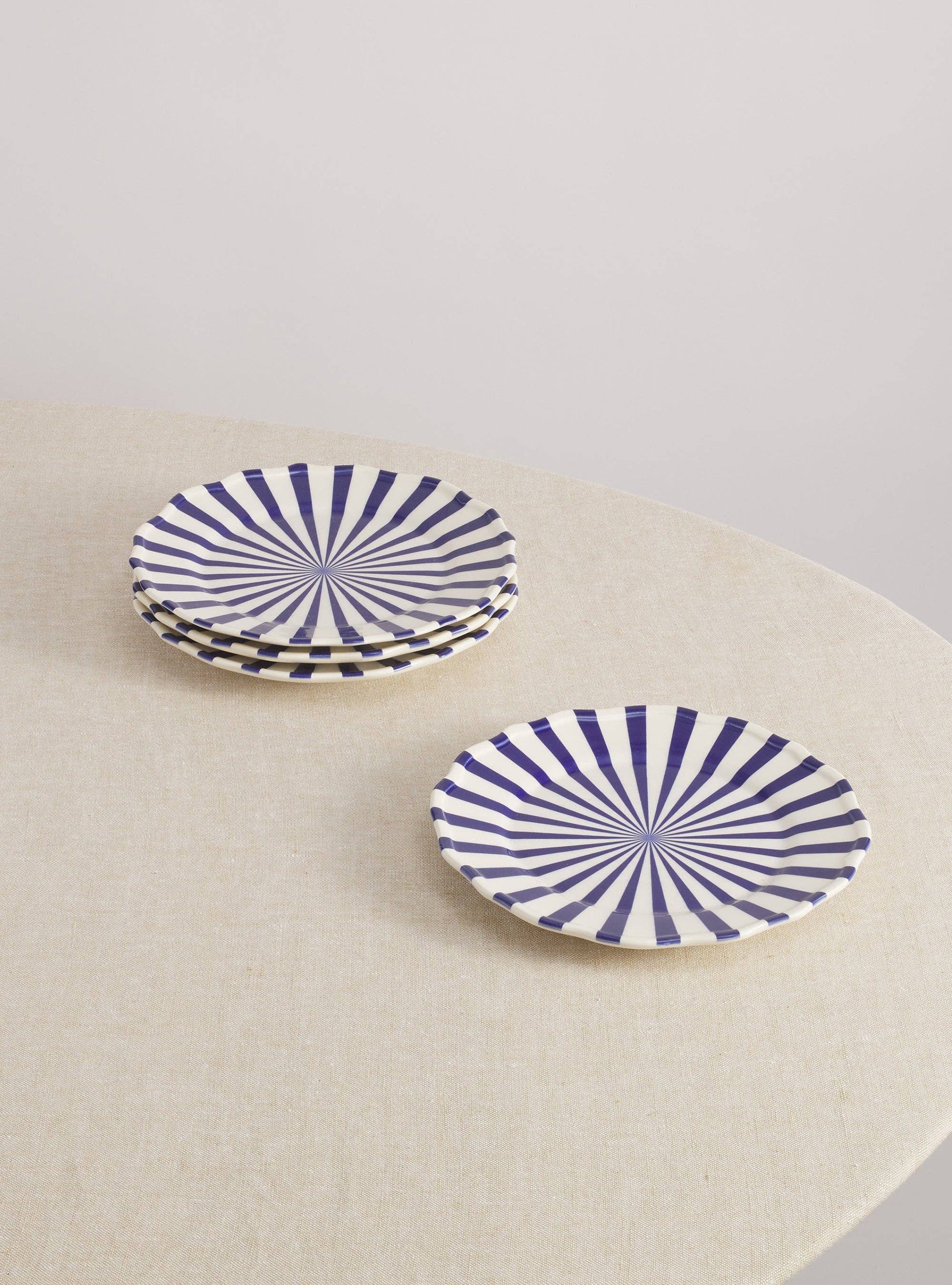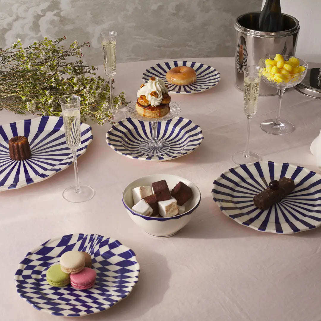 Handmade and hand-painted ceramic earthenware by Maison Madison, designed in New York and made in Portugal. The striped Mafalda Plates boast a glossy finish that also makes for a breezy post-dinner clean-up.
