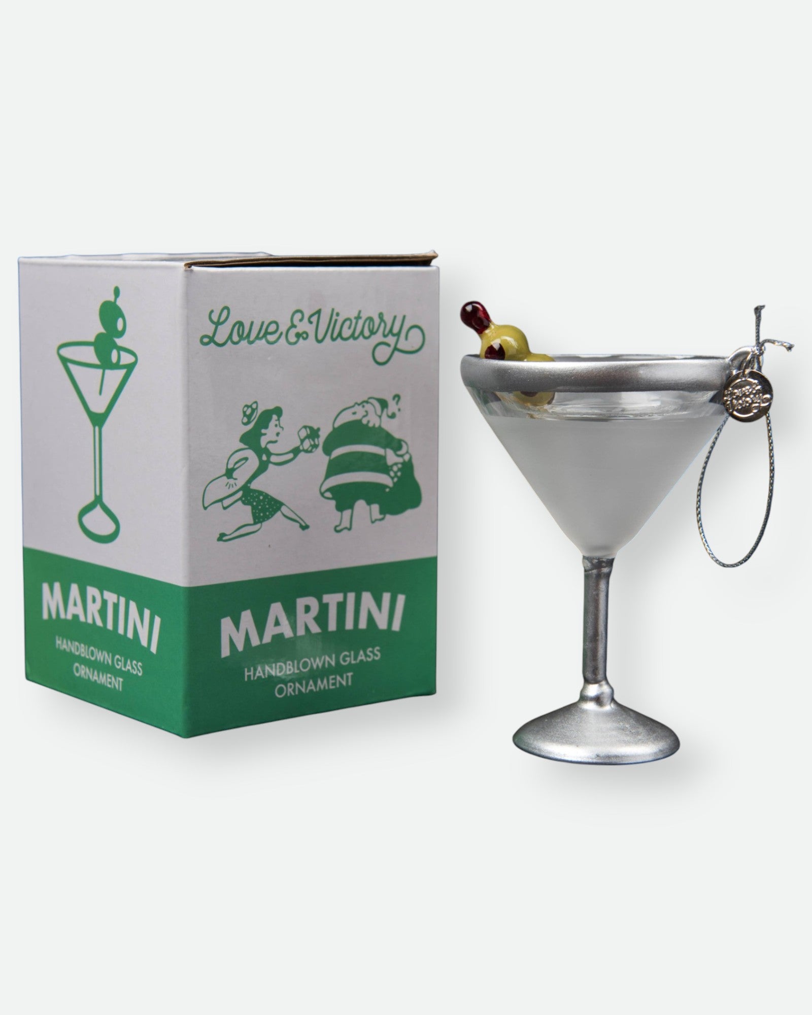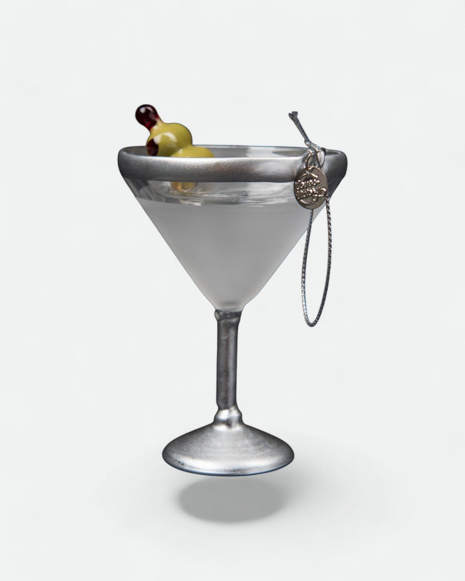 Deck the halls with ice cold Martinis. ‘Tis the season to celebrate our evergreen love of frosty Martinis (shaken OR stirred), now in ornament form. Each hand-blown glass cocktail ornament features a classic stemmed martini glass, with hand-painted details like an olive garnish. The glittery silver hanging loop includes a round L&V charm for added holiday cheer.