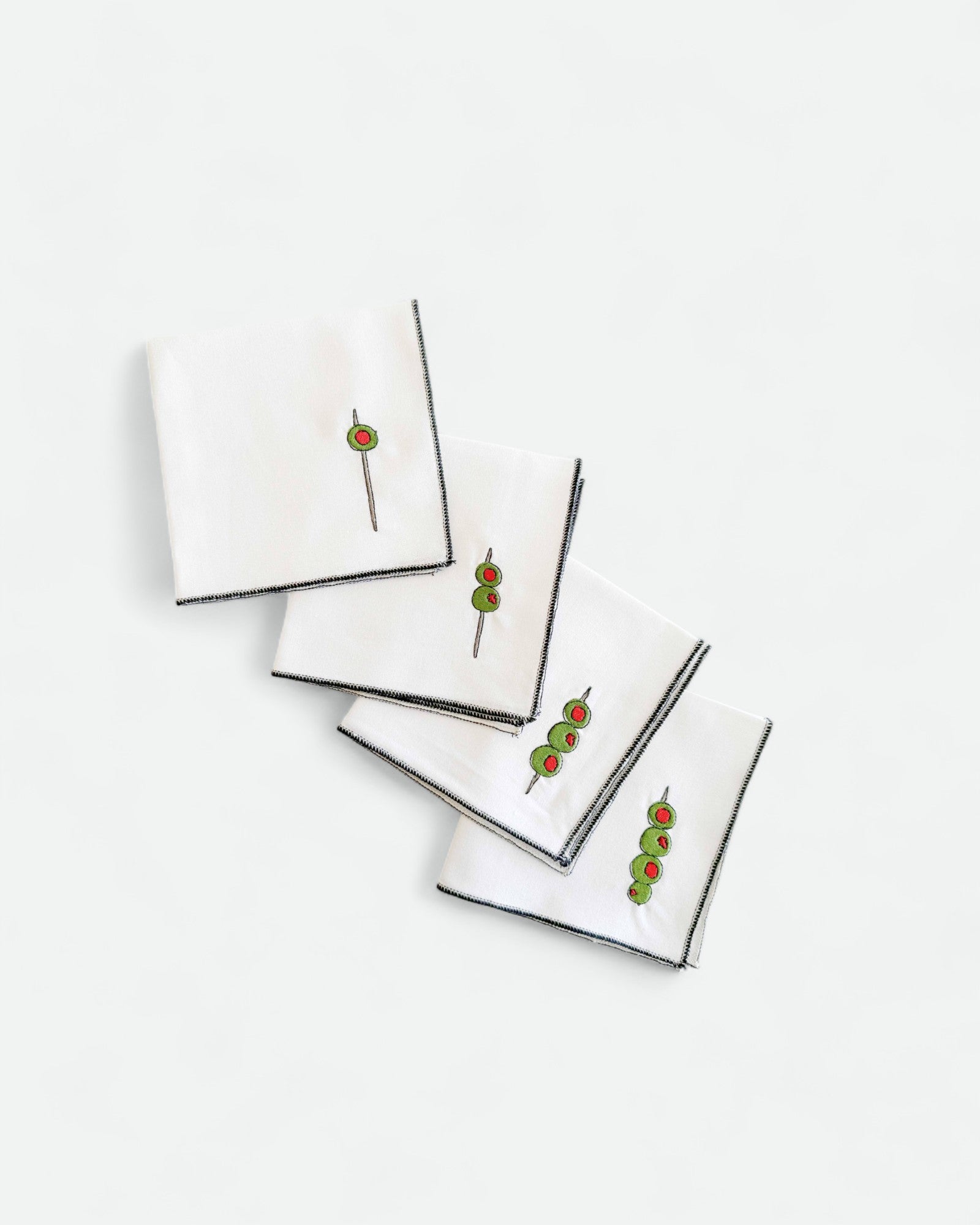 1, 2, 3, or 4?! These are the perfect martini napkins! Each set includes 1-4 olives, embroidered with original illustrations made by Dot and Army.
