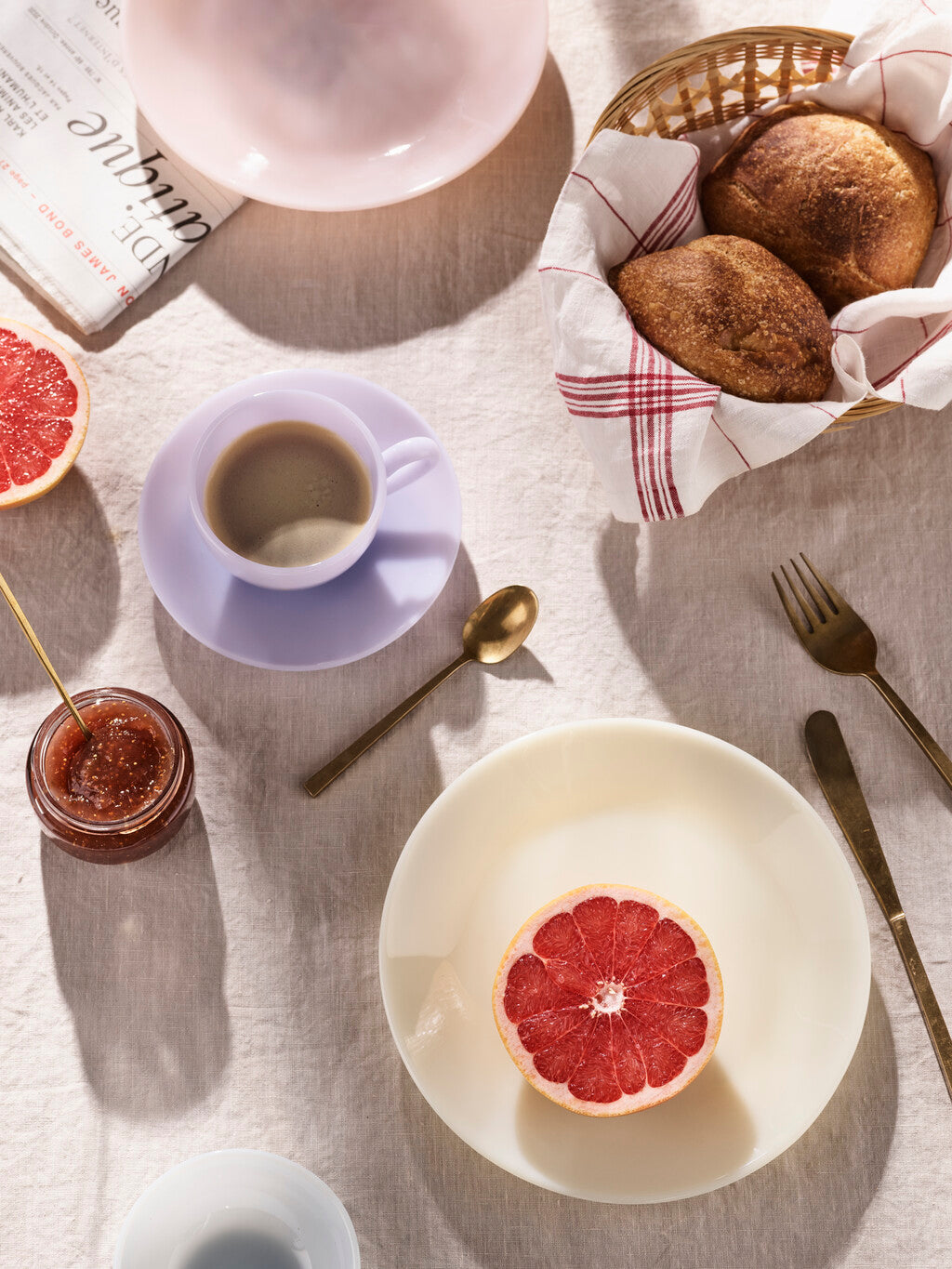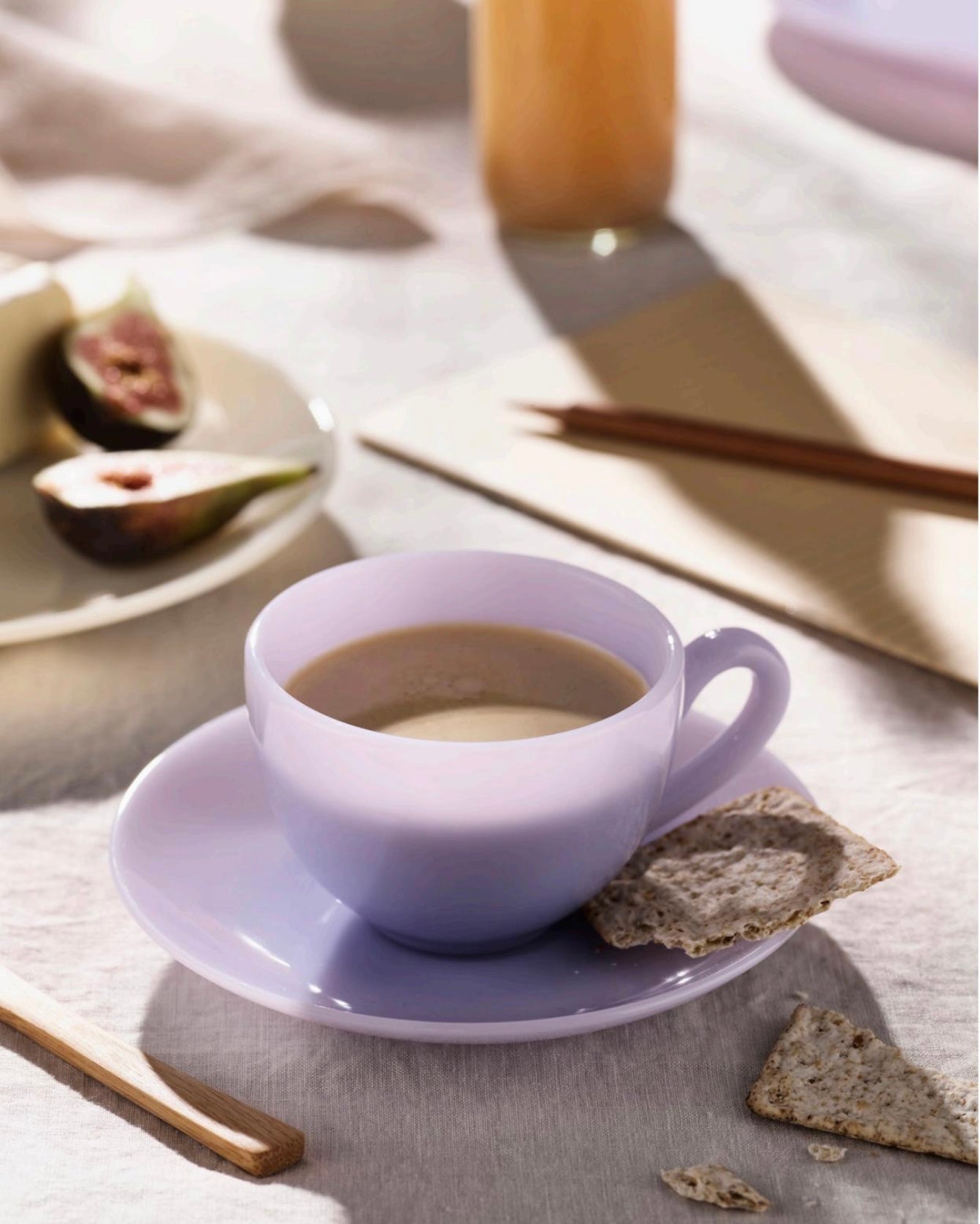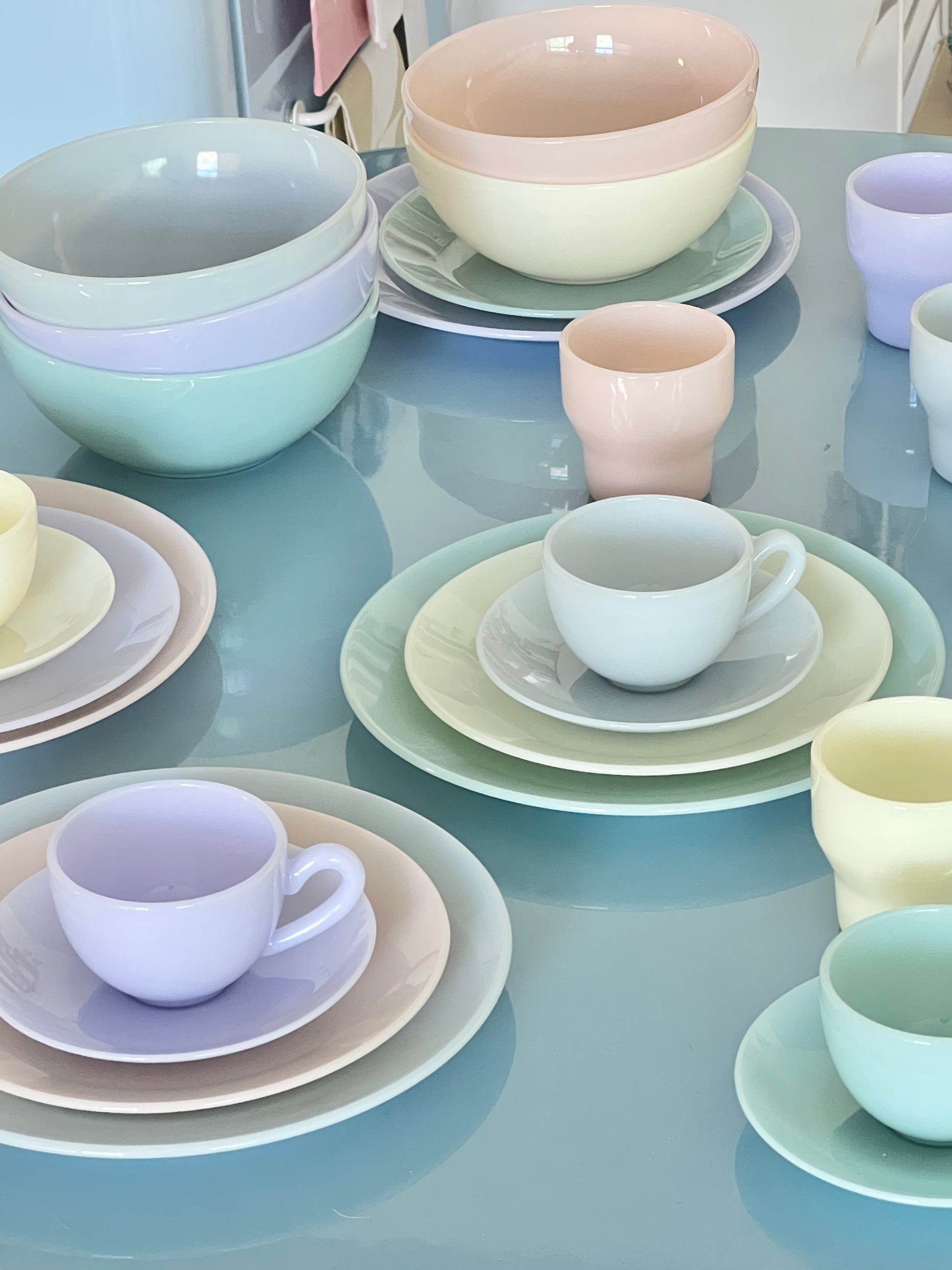 Modern pastel milk glass series by Copenhagen Denmark Lucie Kaas. Milk or Opal glass is known for its ‘foggy’ look, giving it a milk-ish touch. The range of colors invites you to experiment with different combinations to achieve a modern and festive setting. Bring that Danish Chic to your table.