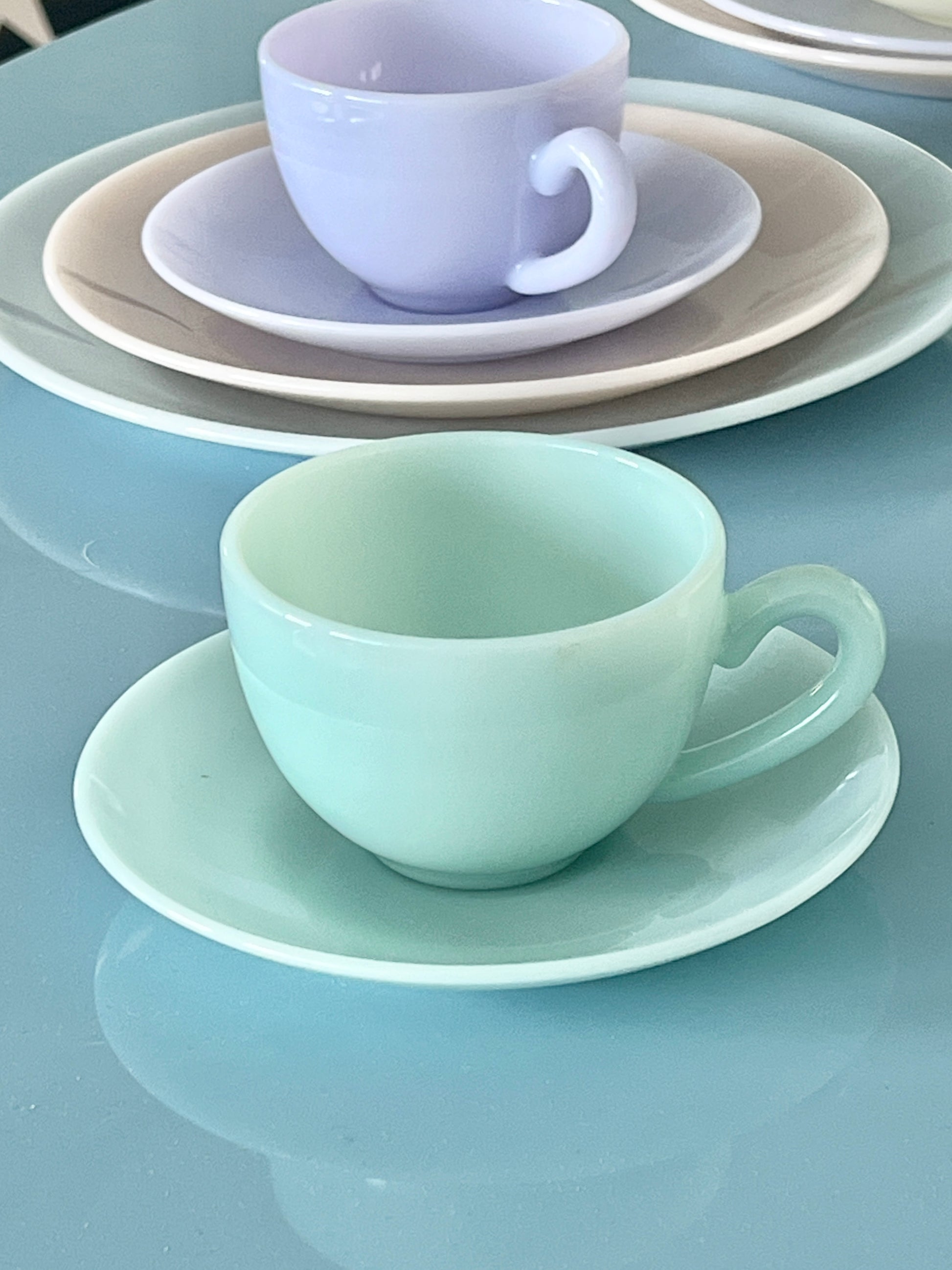 Modern pastel milk glass series by Copenhagen Denmark Lucie Kaas. Milk or Opal glass is known for its ‘foggy’ look, giving it a milk-ish touch. The range of colors invites you to experiment with different combinations to achieve a modern and festive setting. Bring that Danish Chic to your table.