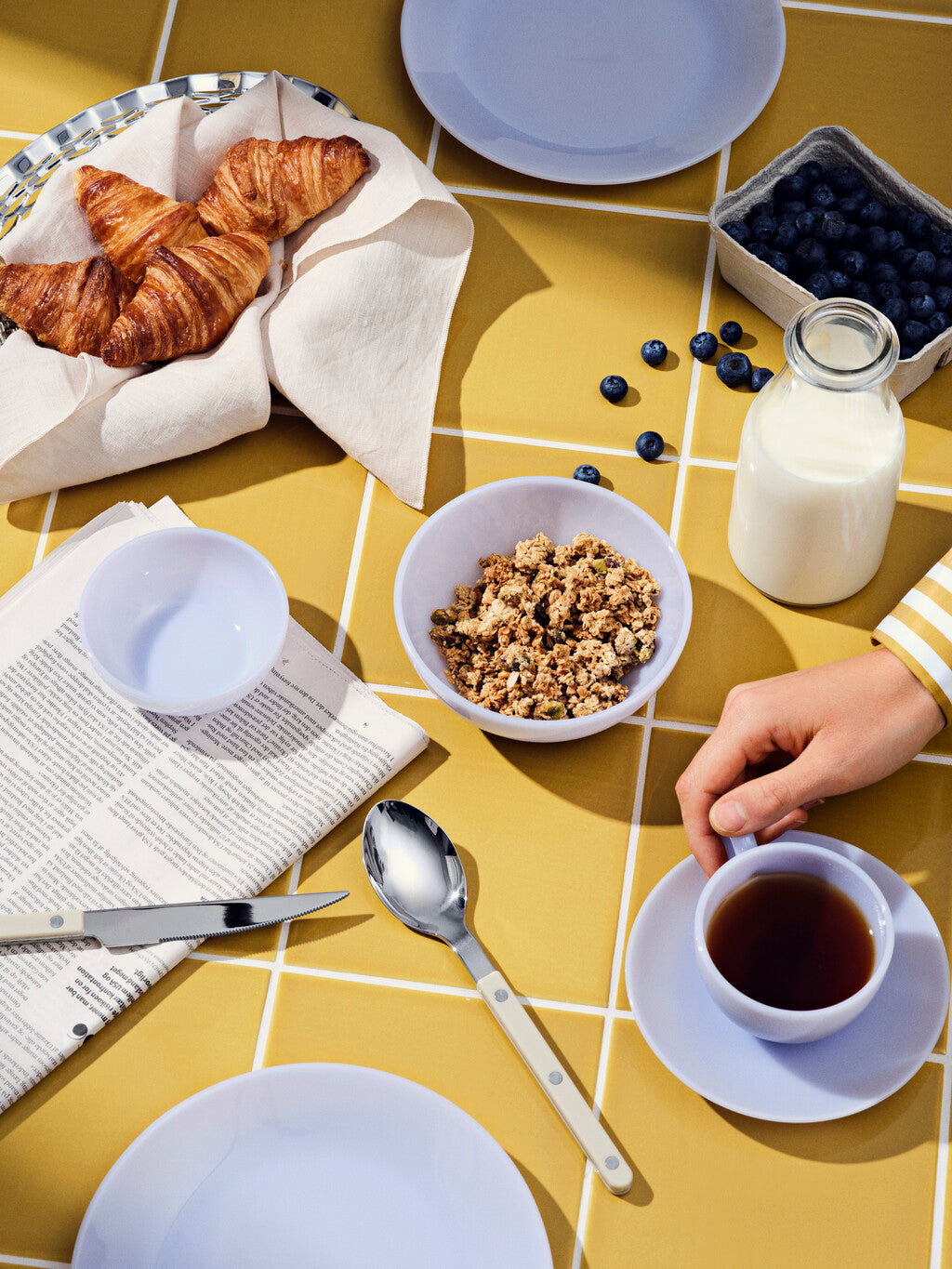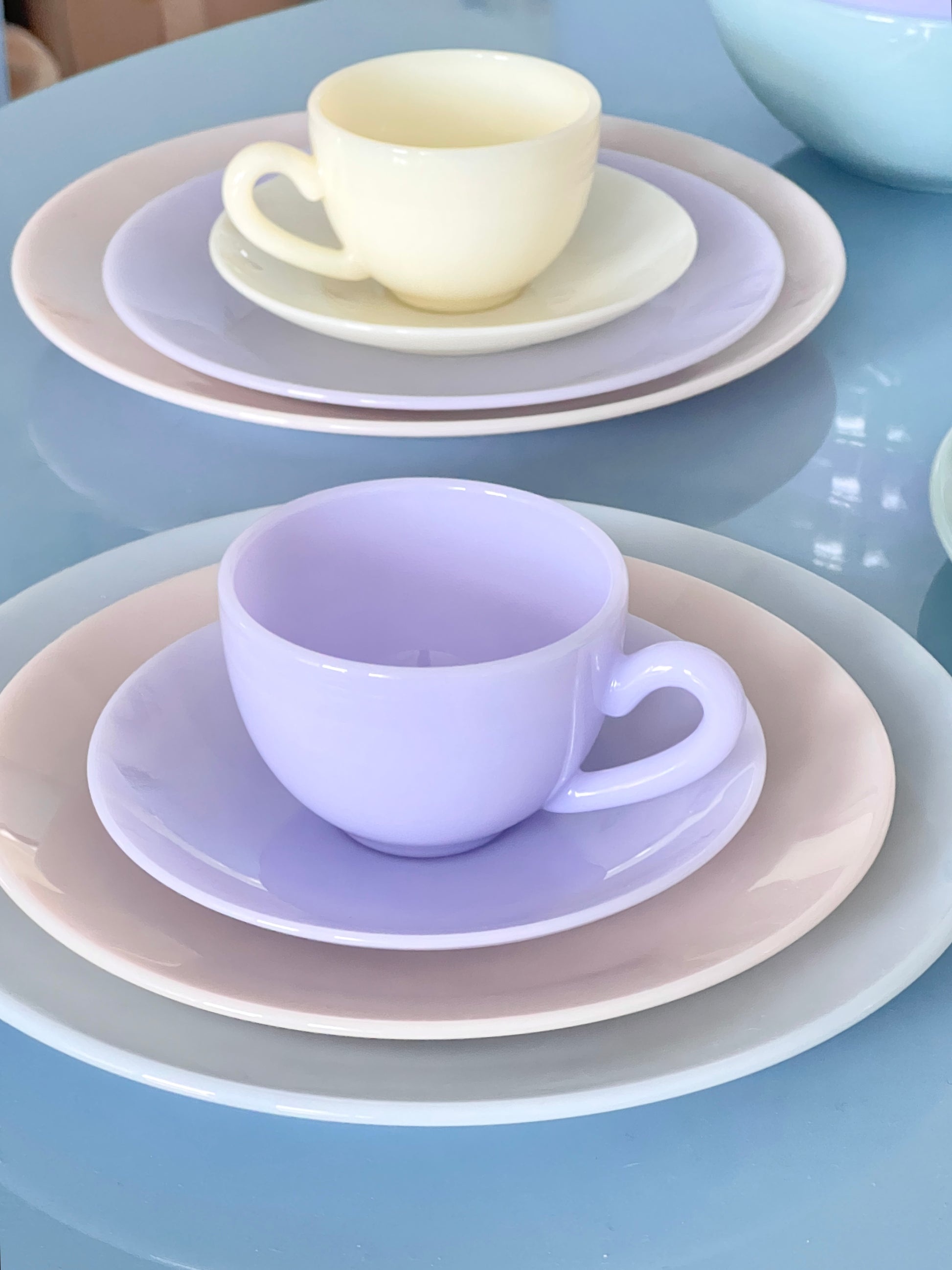Modern pastel milk glass series by Copenhagen Denmark Lucie Kaas. Milk or Opal glass is known for its ‘foggy’ look, giving it a milk-ish touch. The range of colors invites you to experiment with different combinations to achieve a modern and festive setting. Bring that Danish Chic to your table.