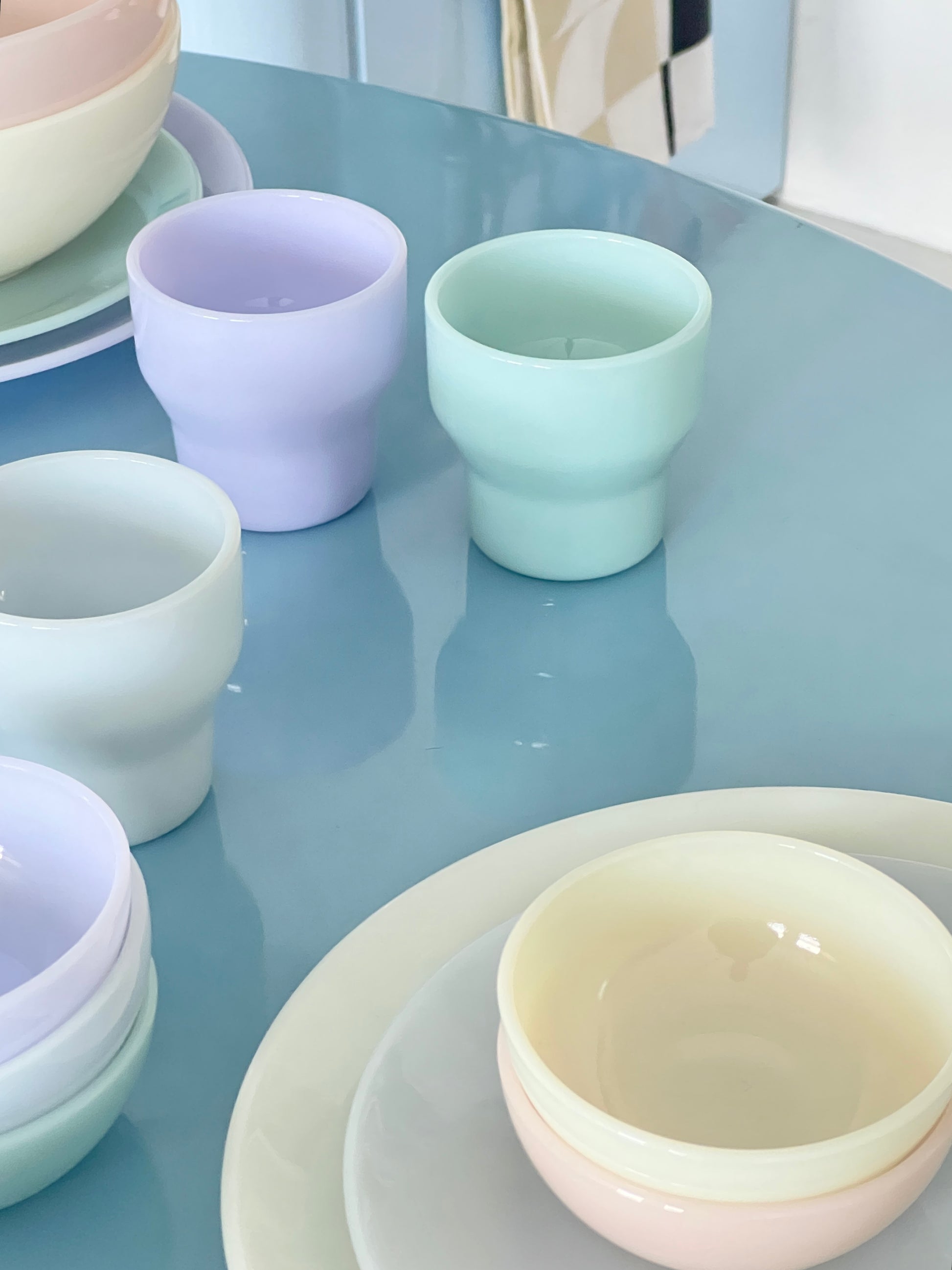 Modern pastel milk glass series by Copenhagen Denmark Lucie Kaas. Milk or Opal glass is known for its ‘foggy’ look, giving it a milk-ish touch. The range of colors invites you to experiment with different combinations to achieve a modern and festive setting. Bring that Danish Chic to your table.