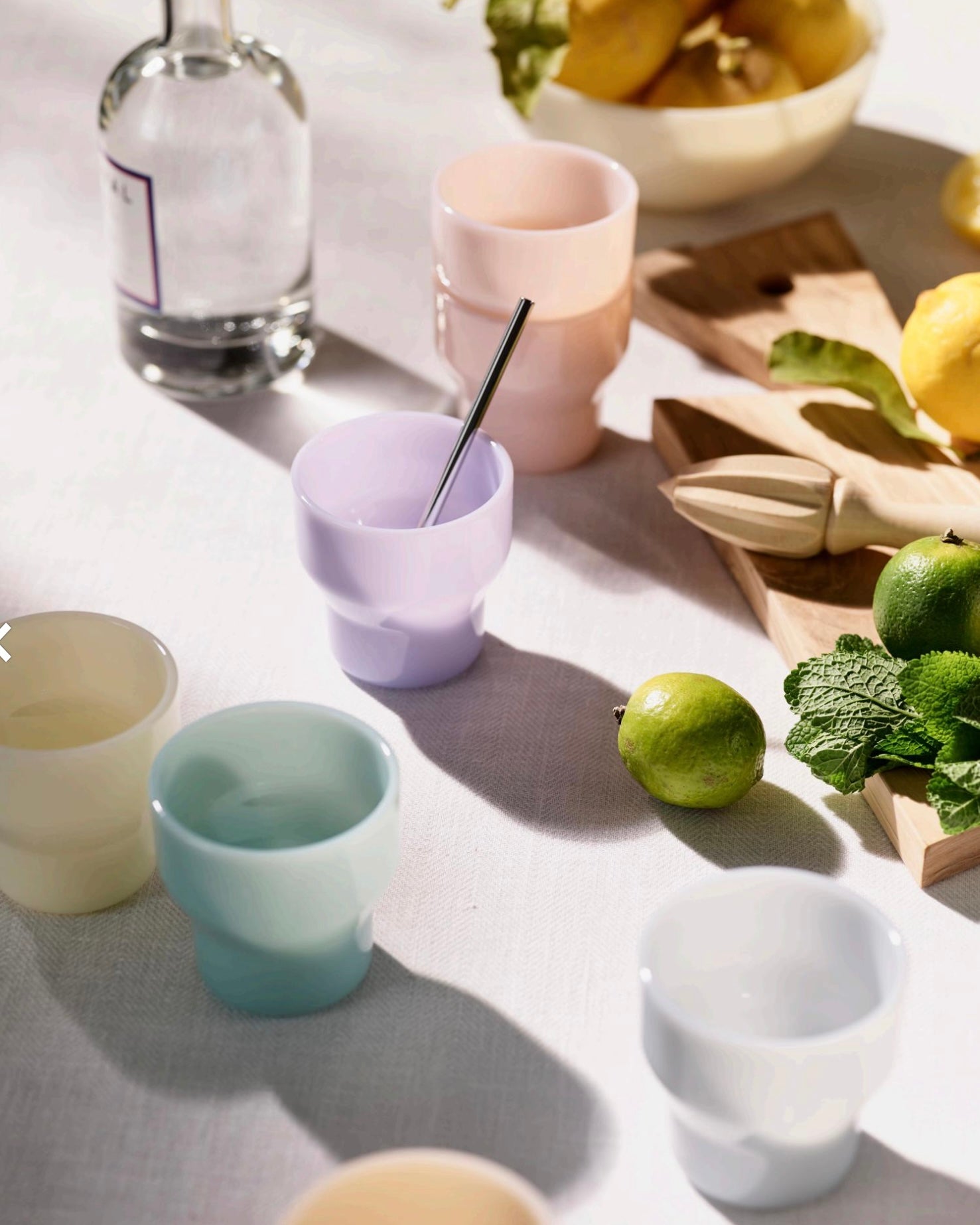 Modern pastel milk glass series by Copenhagen Denmark Lucie Kaas. Milk or Opal glass is known for its ‘foggy’ look, giving it a milk-ish touch. The range of colors invites you to experiment with different combinations to achieve a modern and festive setting. Bring that Danish Chic to your table.