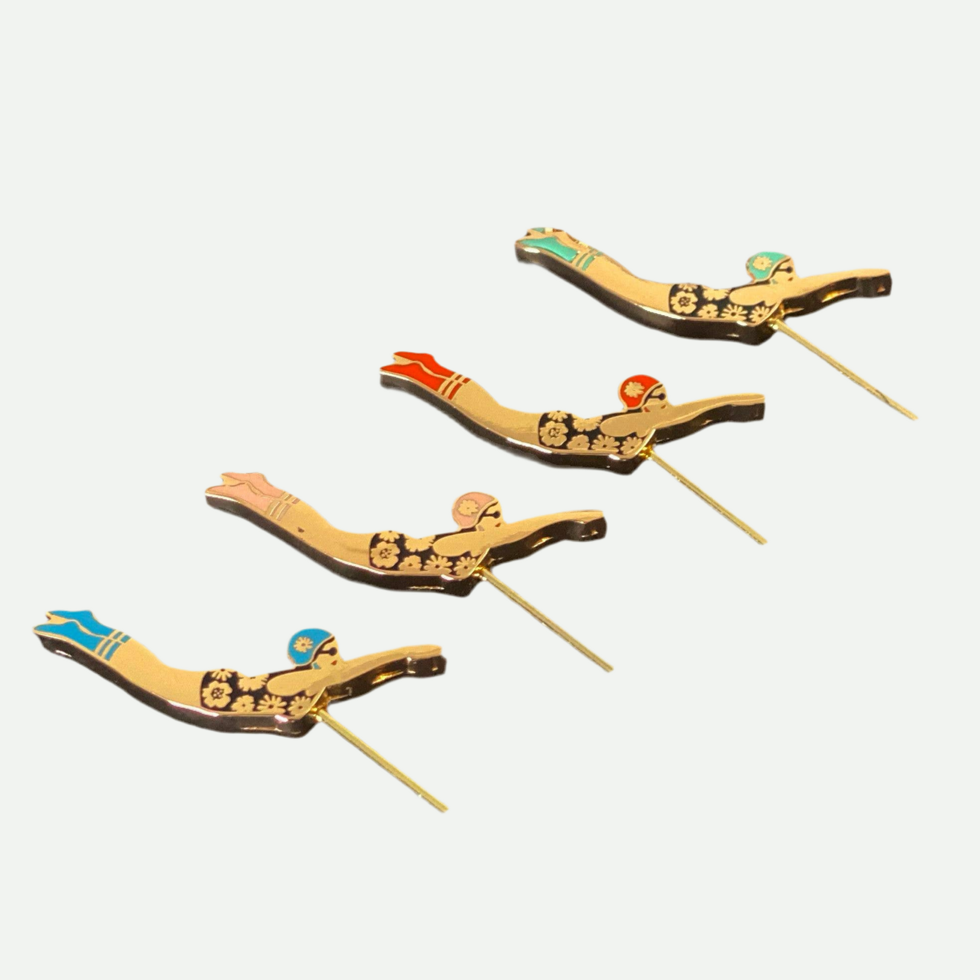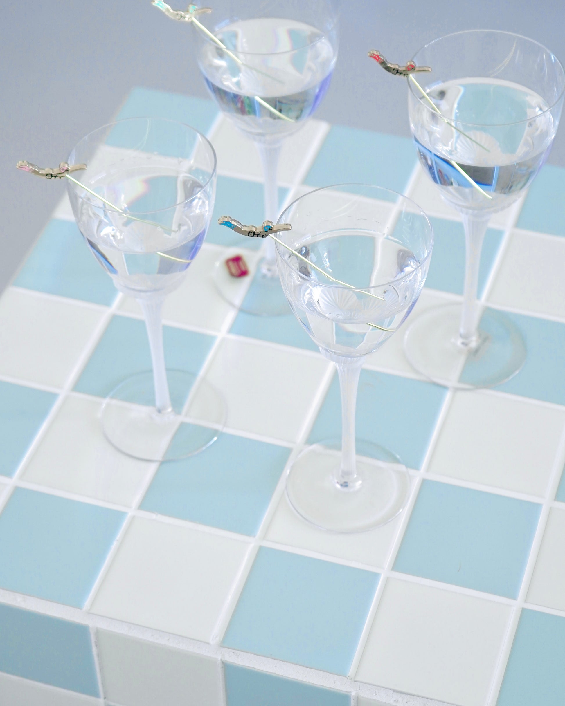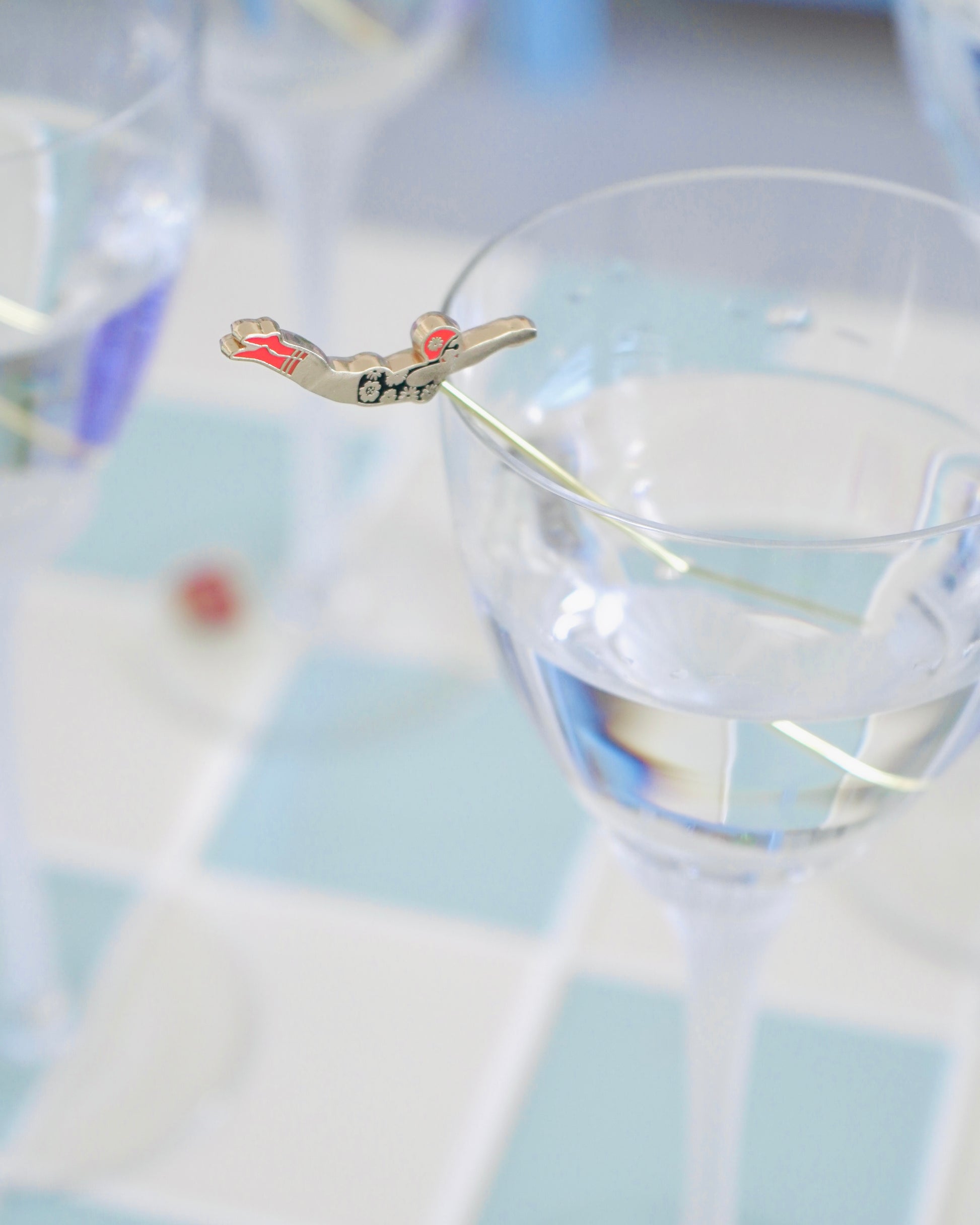 Dive in! A set of 4 cocktail picks, by New York creative studio Love & Victory, with an old fashioned diver ready to take the plunge. Includes four gold tone picks with 4 different colors of enamel finish.