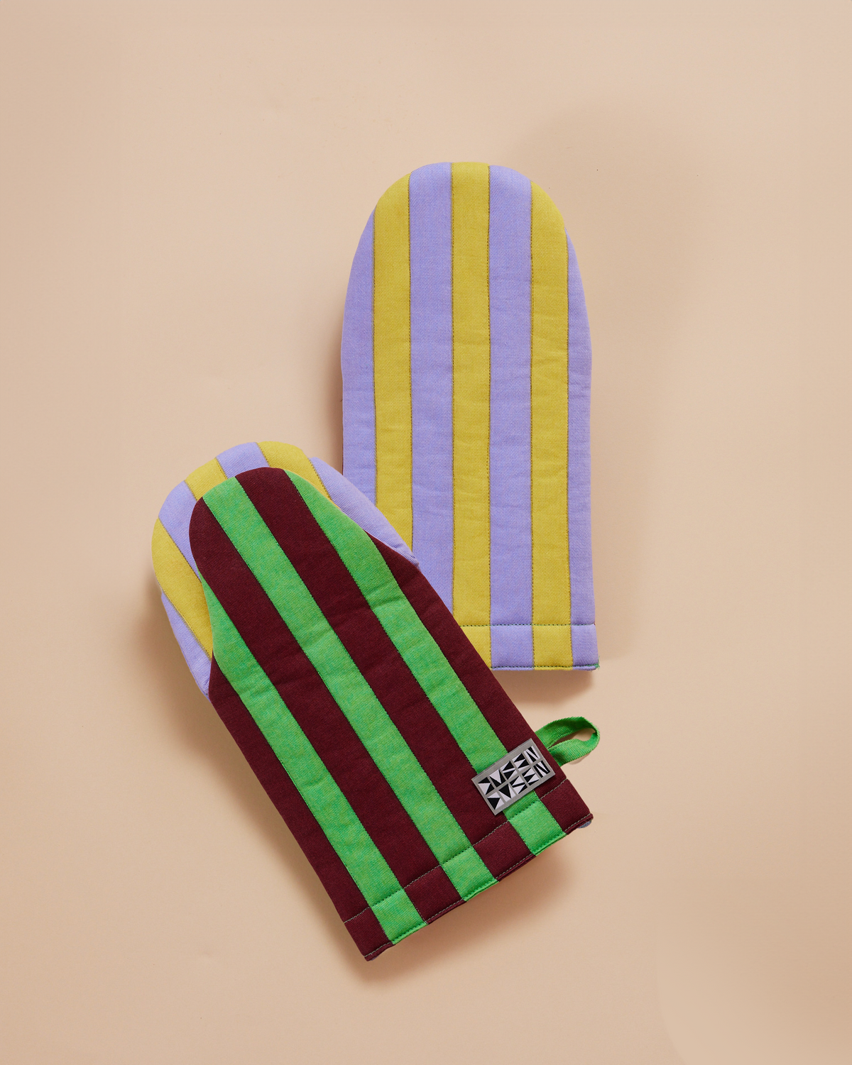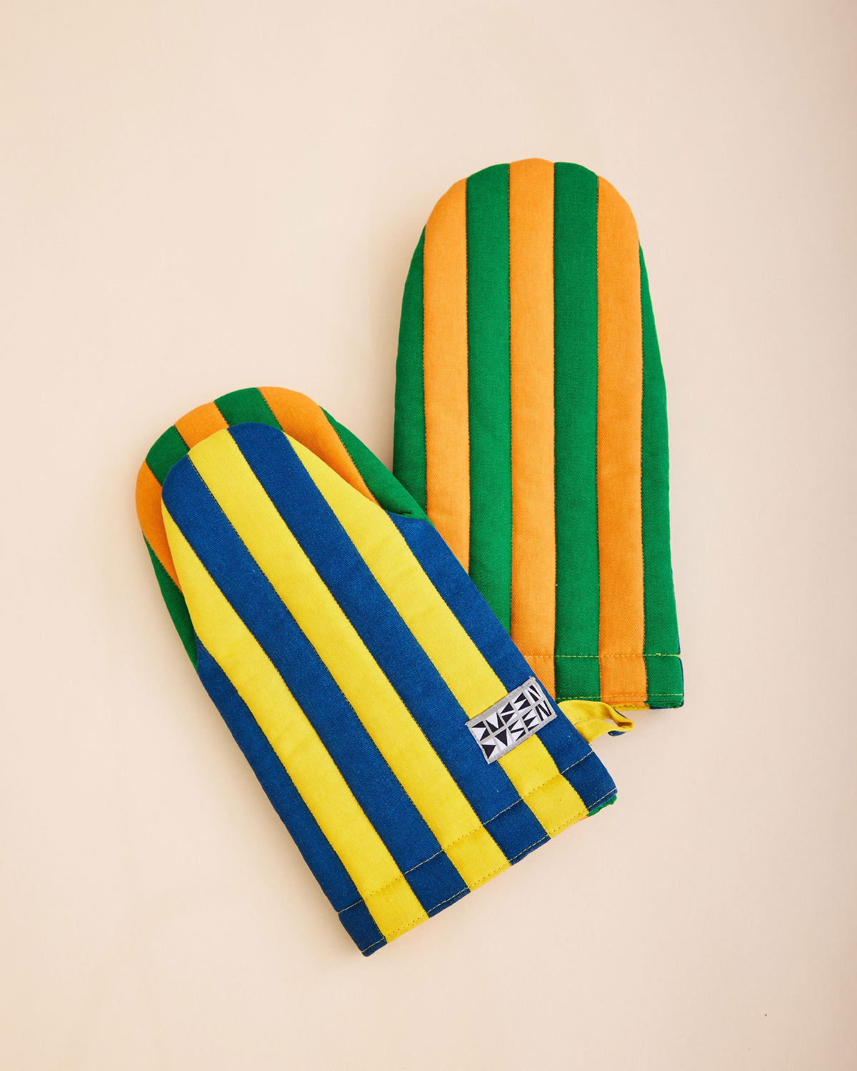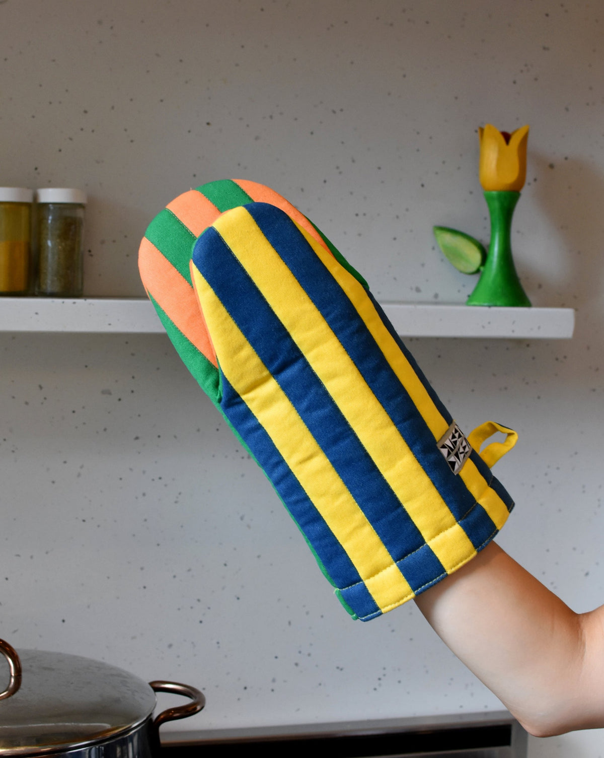 Material: Resists temperatures up to 400 degrees Fahrenheit. Do not use mitts when wet. Padded oven mitt in contrasting stripe colorways. Features a "frog-style" mitt shape, top stitched brand label, and a side loop. 100% cotton quilted canvas base, with polyester fill.