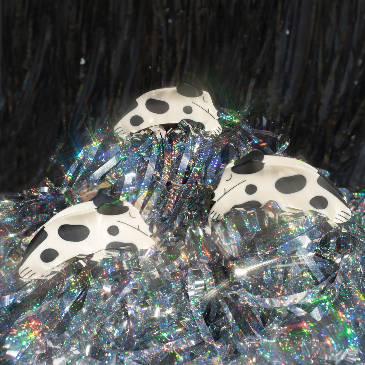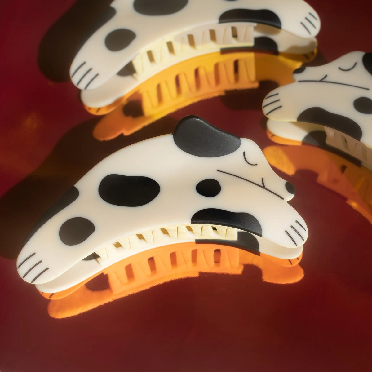 A cute black and white spotted puppy hair claw with a matte finish!