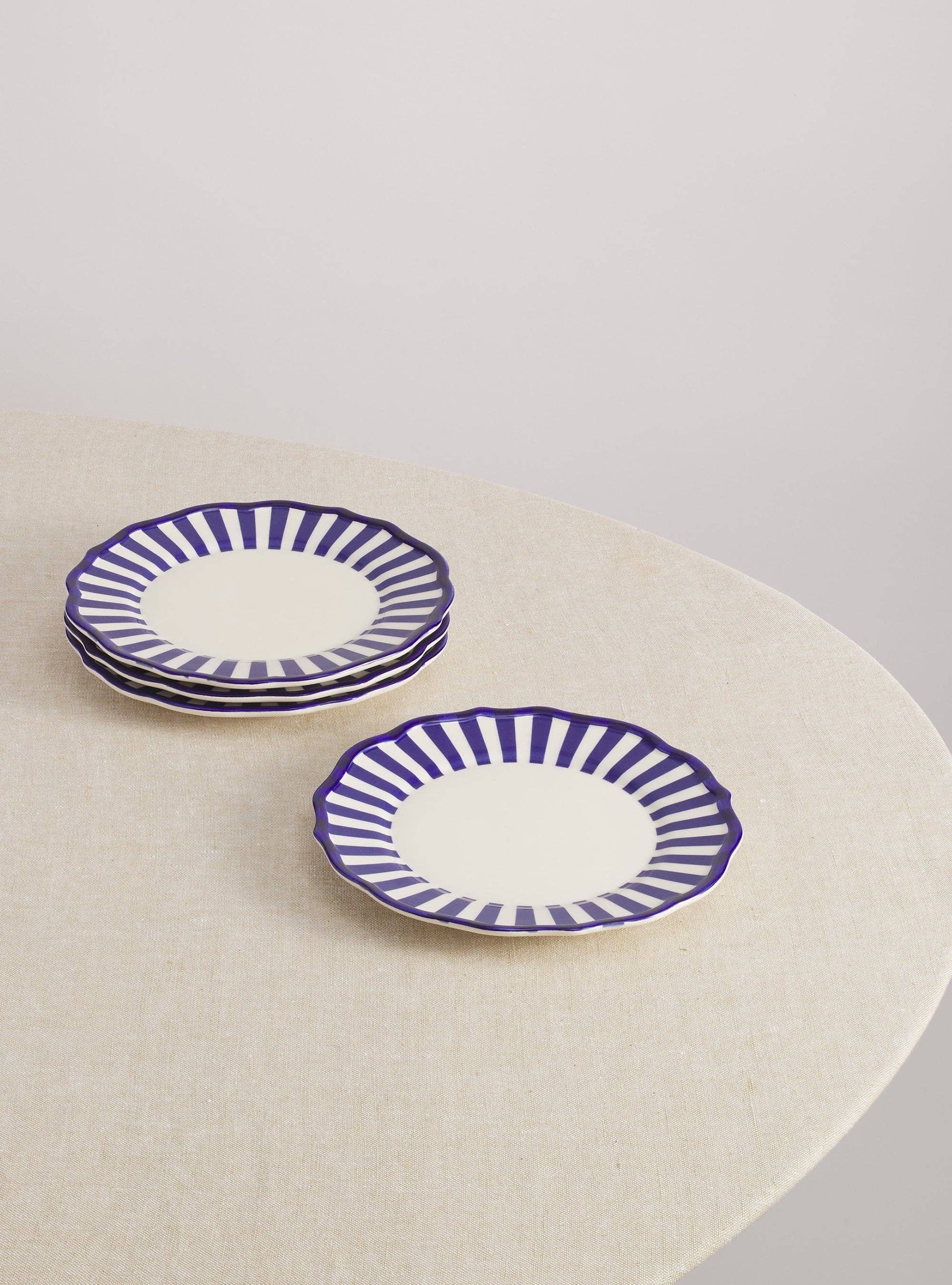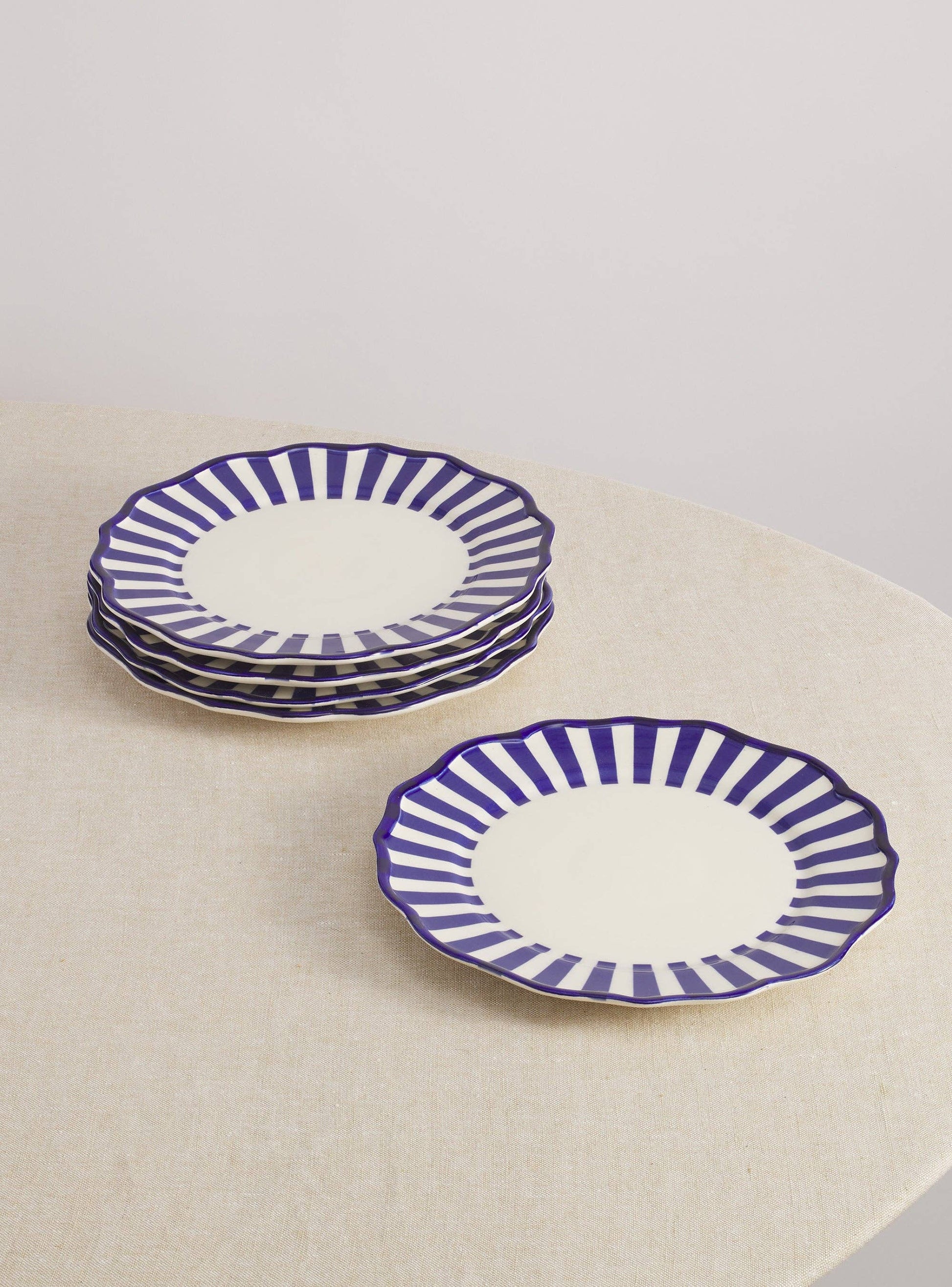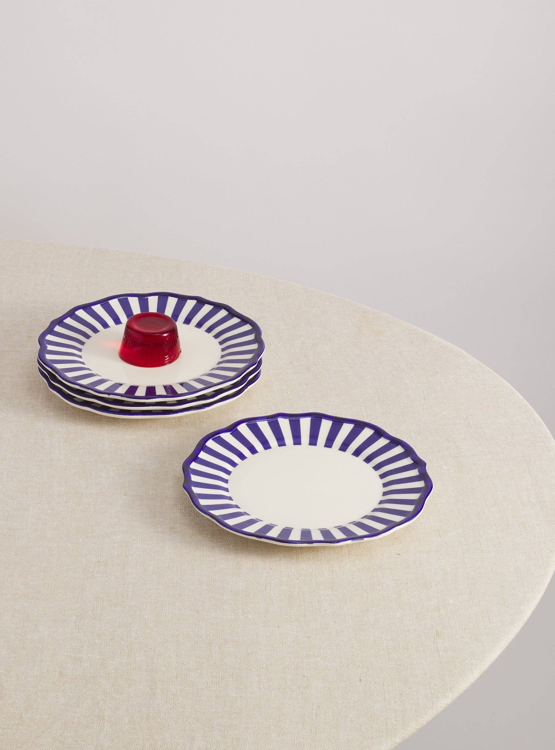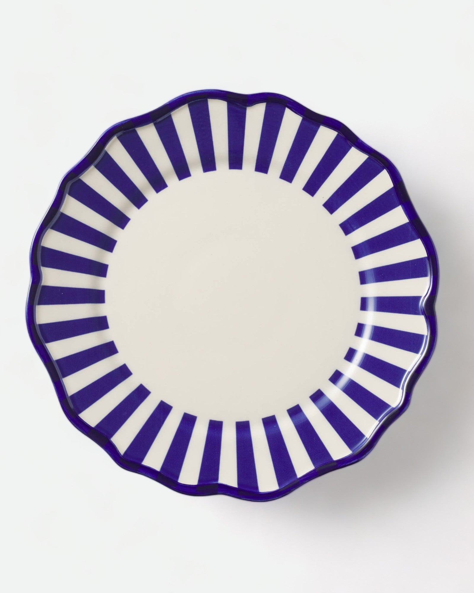 Handmade and hand-painted ceramic earthenware by Maison Madison, designed in New York and made in Portugal. The striped nautical Riviera Plate is elevated just enough to reserve food juices and maintain compact stacking in your kitchen cupboard.