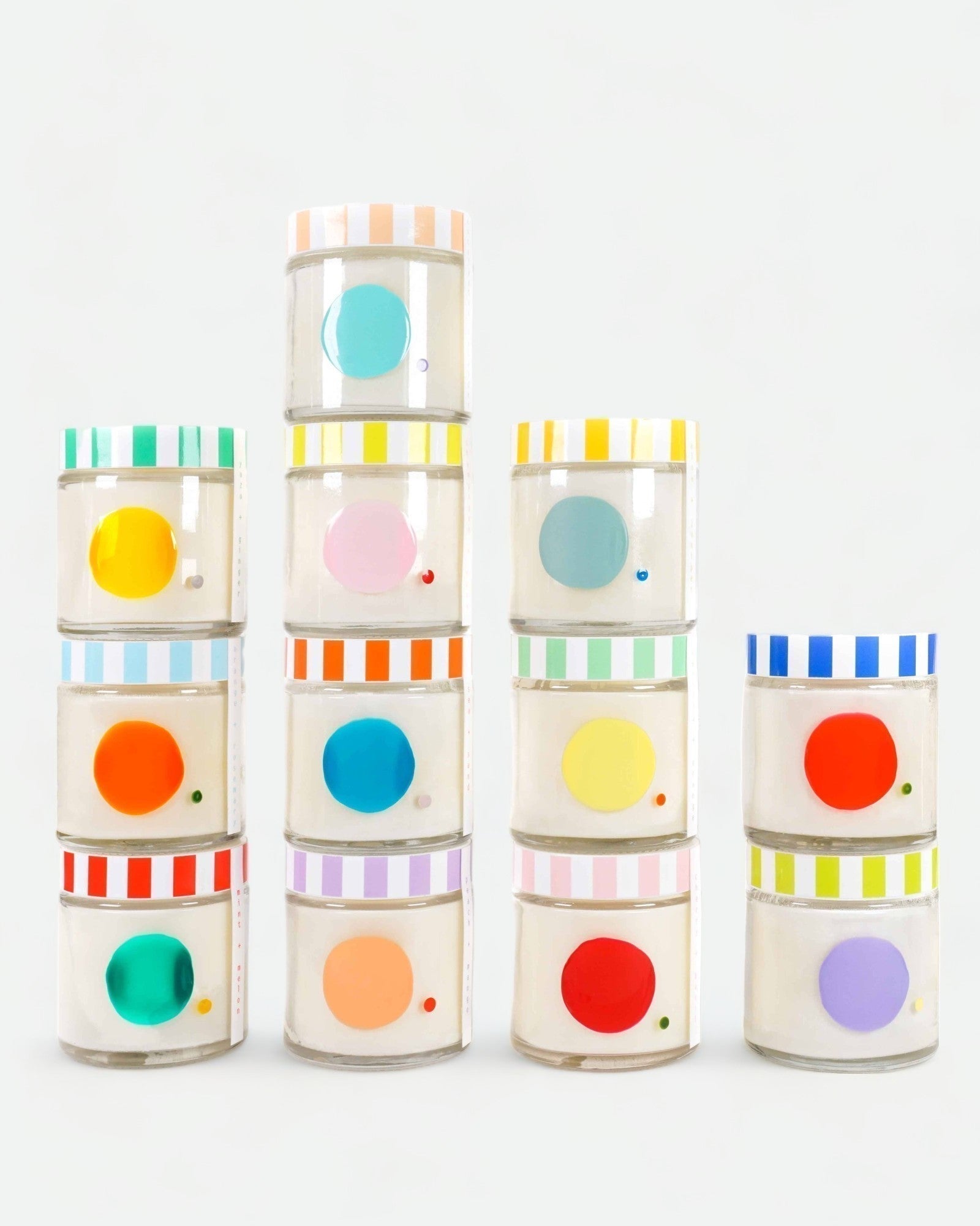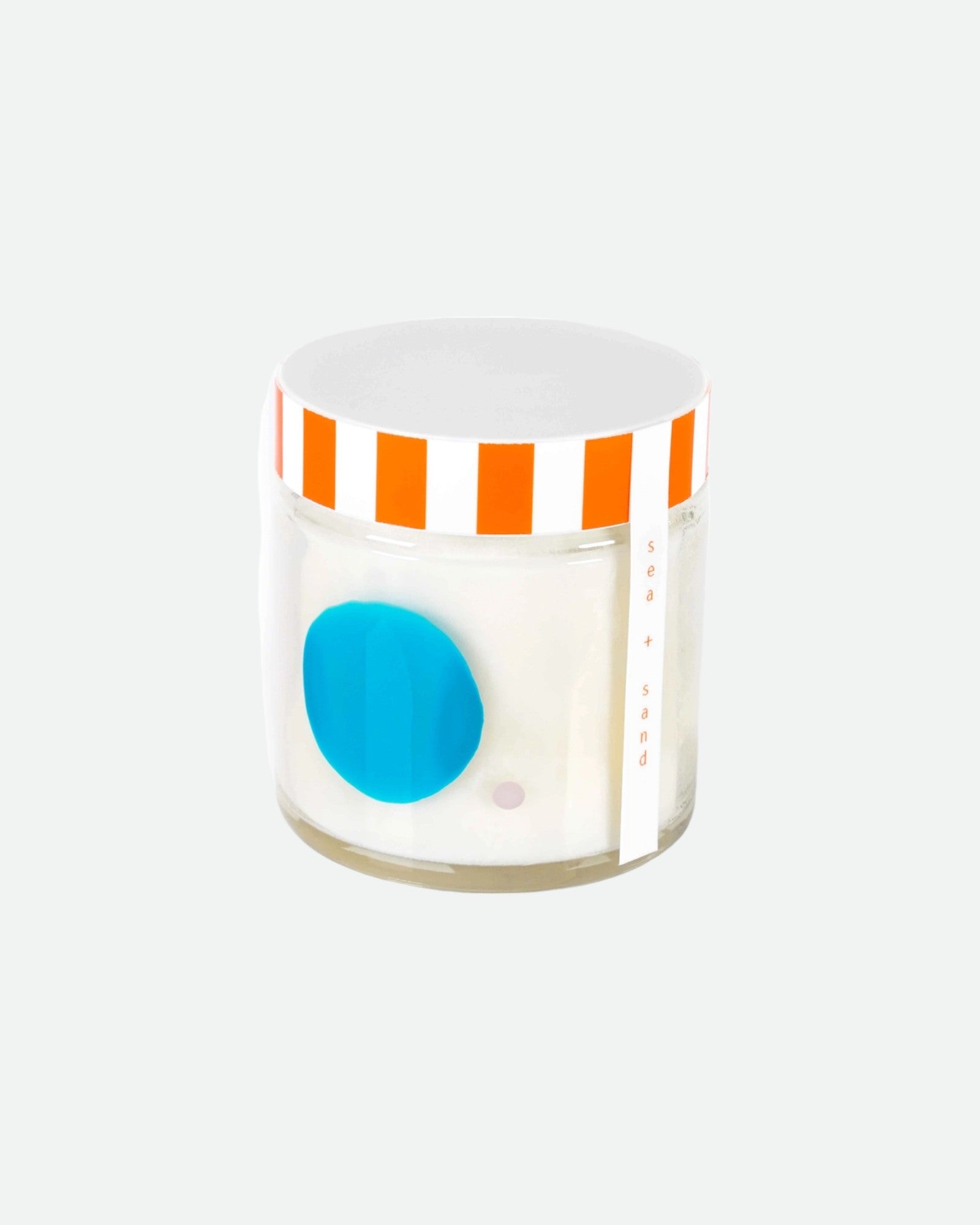 Sea and Sand scent hand-painted glass candle by Barcelona artisan brand, painted color indicating its scent.