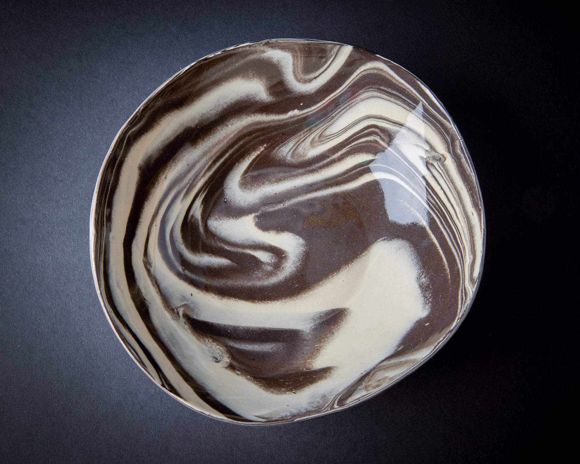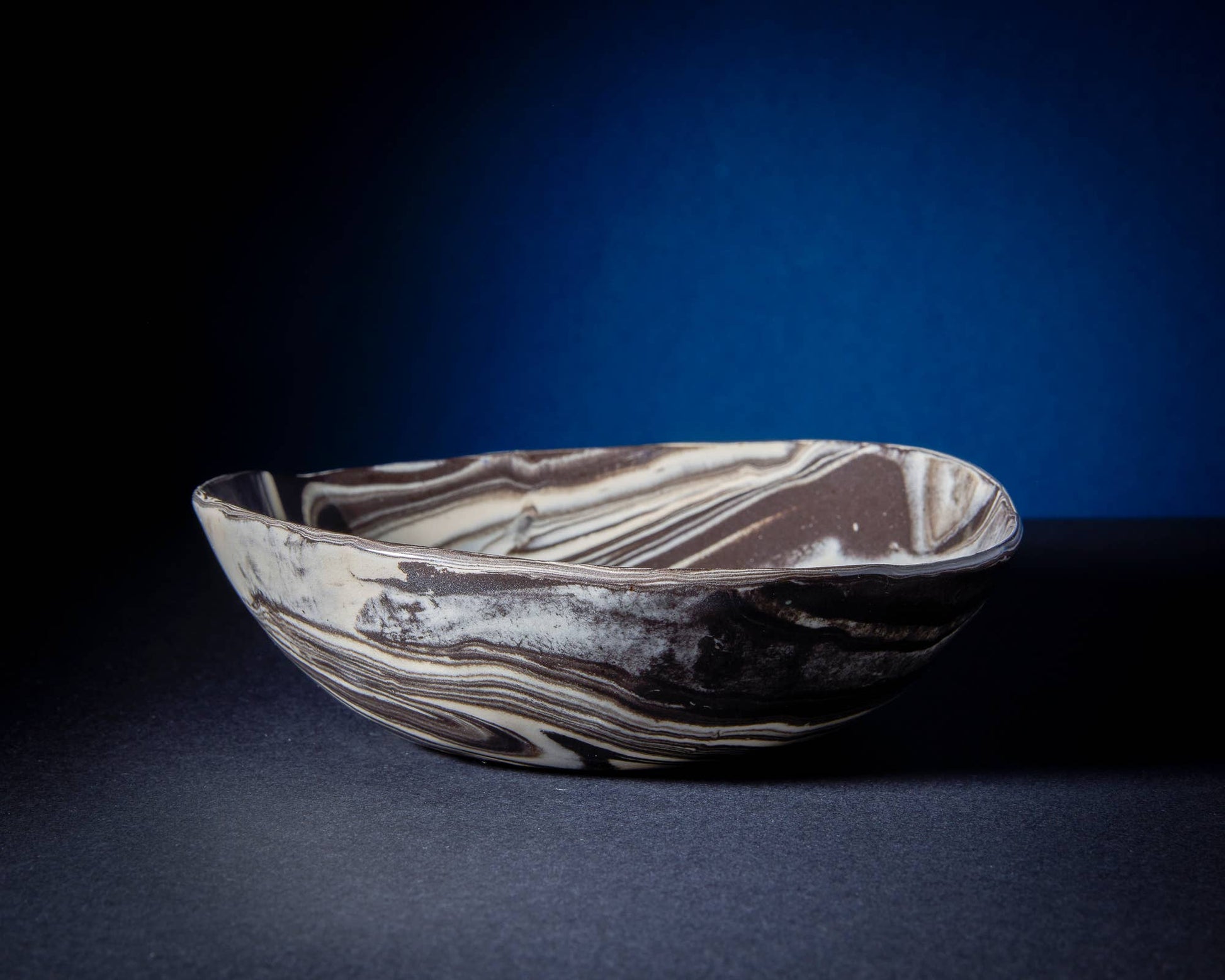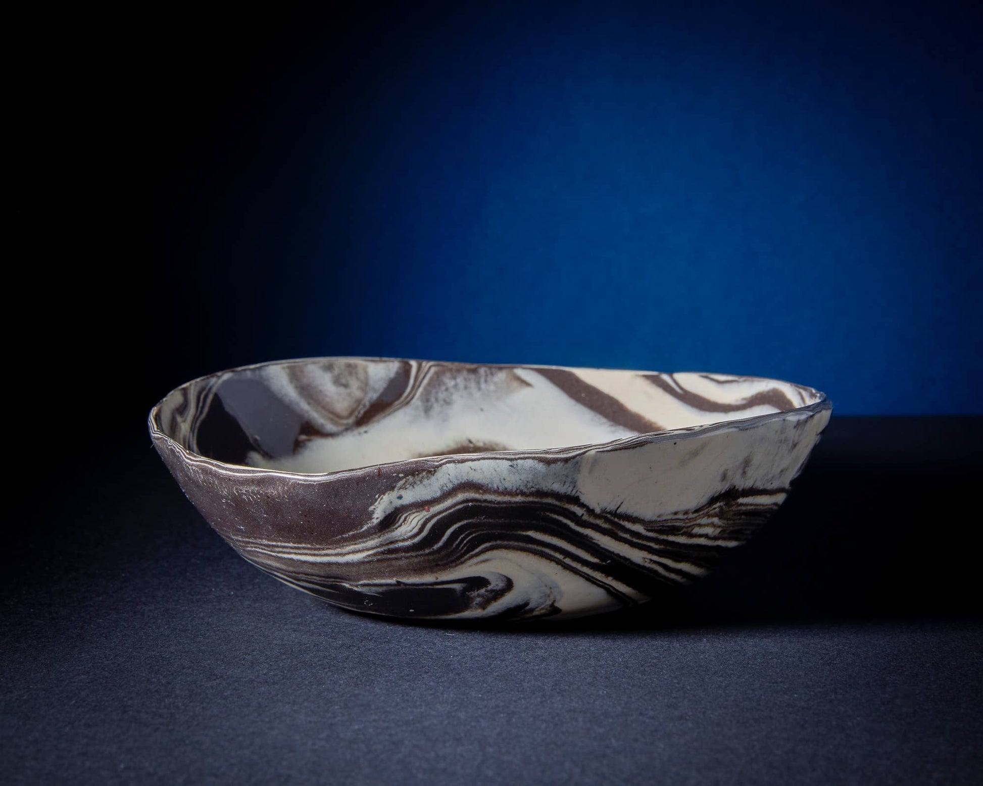Striking and sophisticated, this bowl features a swirling blend of rich charcoal and soft ivory clay. The dramatic marbling evokes ink in water or plumes of smoke — bold, elegant, and endlessly captivating. Handcrafted with each bowl is entirely one-of-a-kind. Ideal for serving, storing, or simply showing off. Made to be used and admired. Handcrafted in Brooklyn, NY.