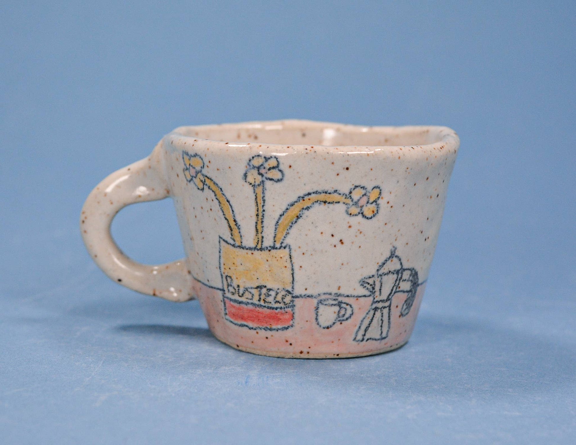 A hand built stoneware cup! This is not a big boy...great for espressos or shots! All cups are made in house by hand, so slight variations will occur between each piece.