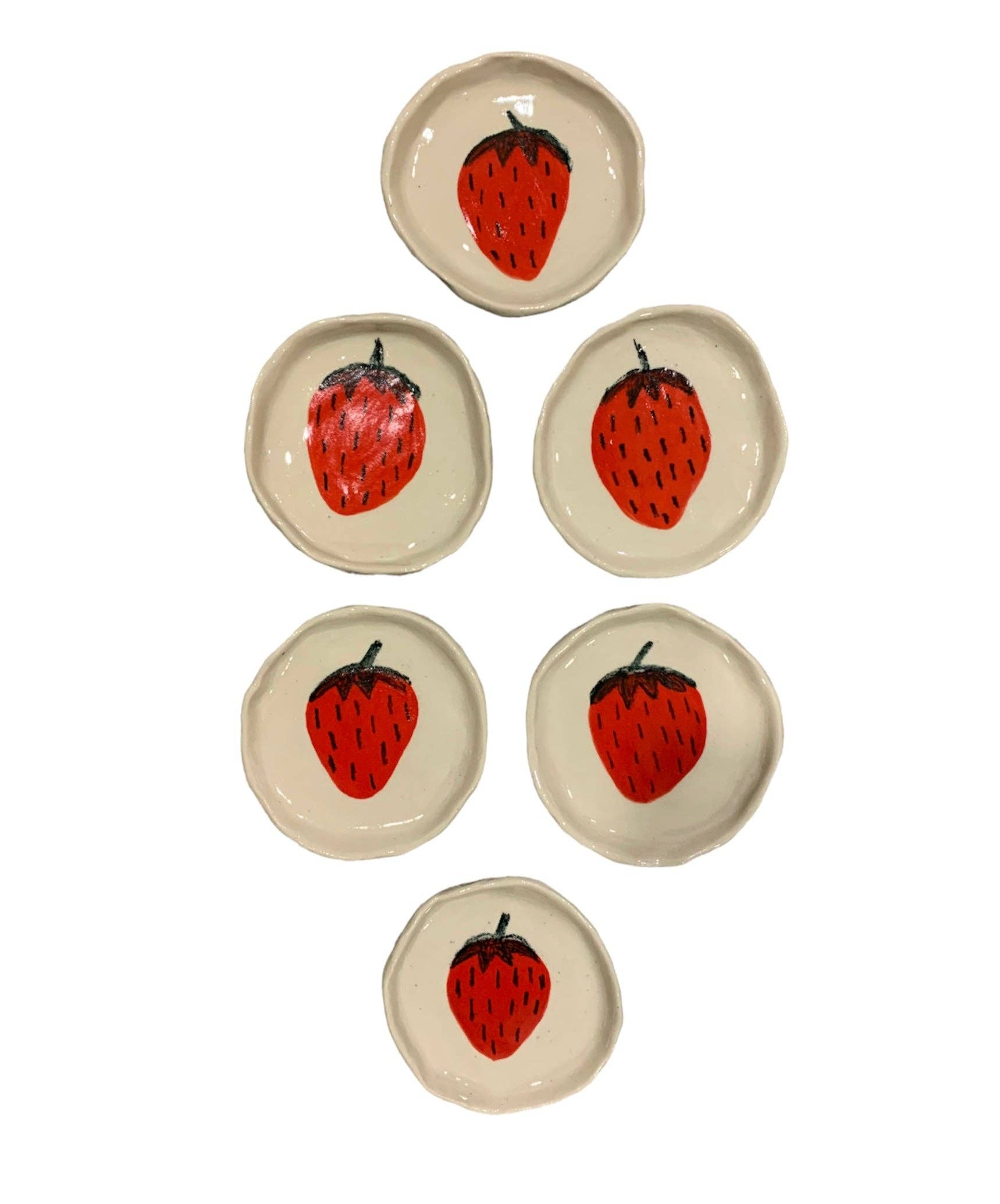 These handmade strawberry trays are perfect for rings, trinkets, or holding a single strawberry. Each mini dish is handmade with hand painted strawberry illustration. Due to their handmade nature each dish will vary slightly from each other and the photos.