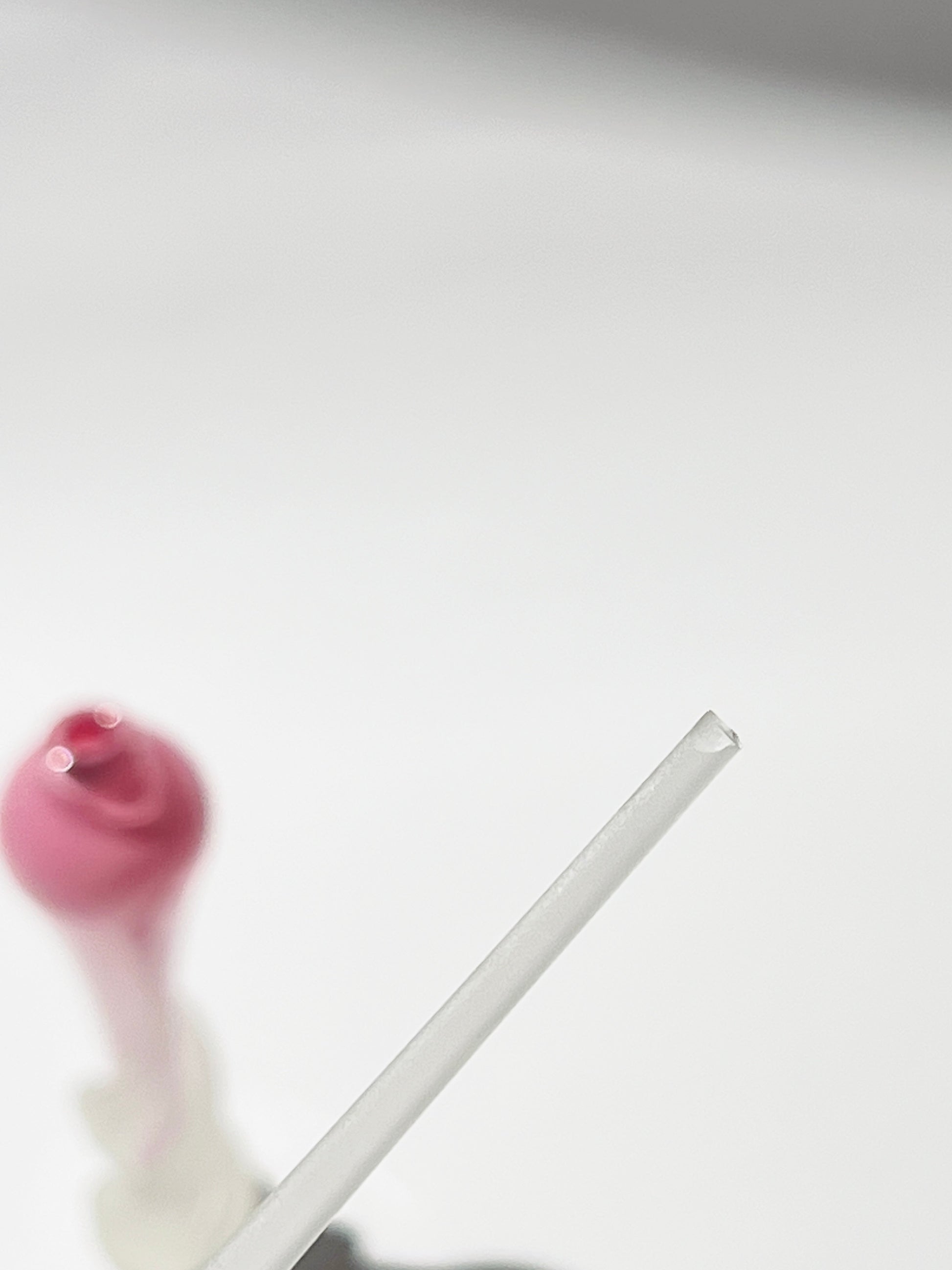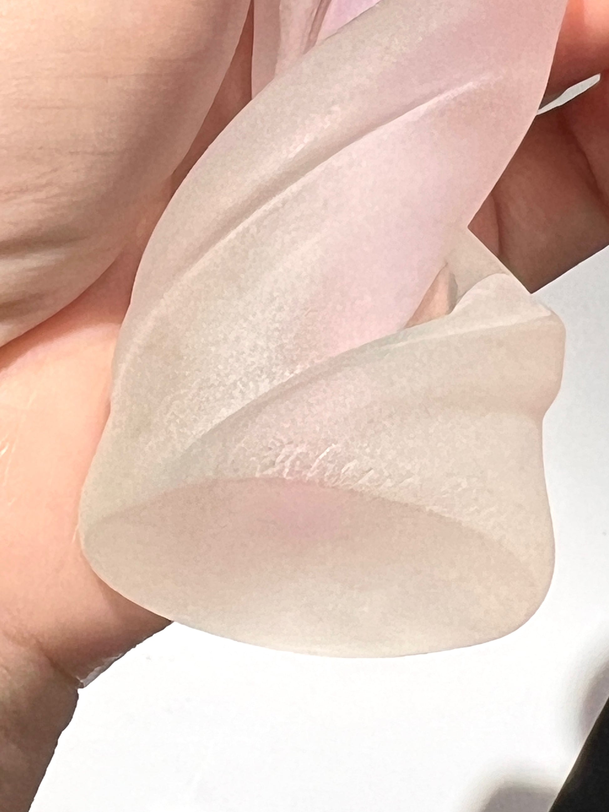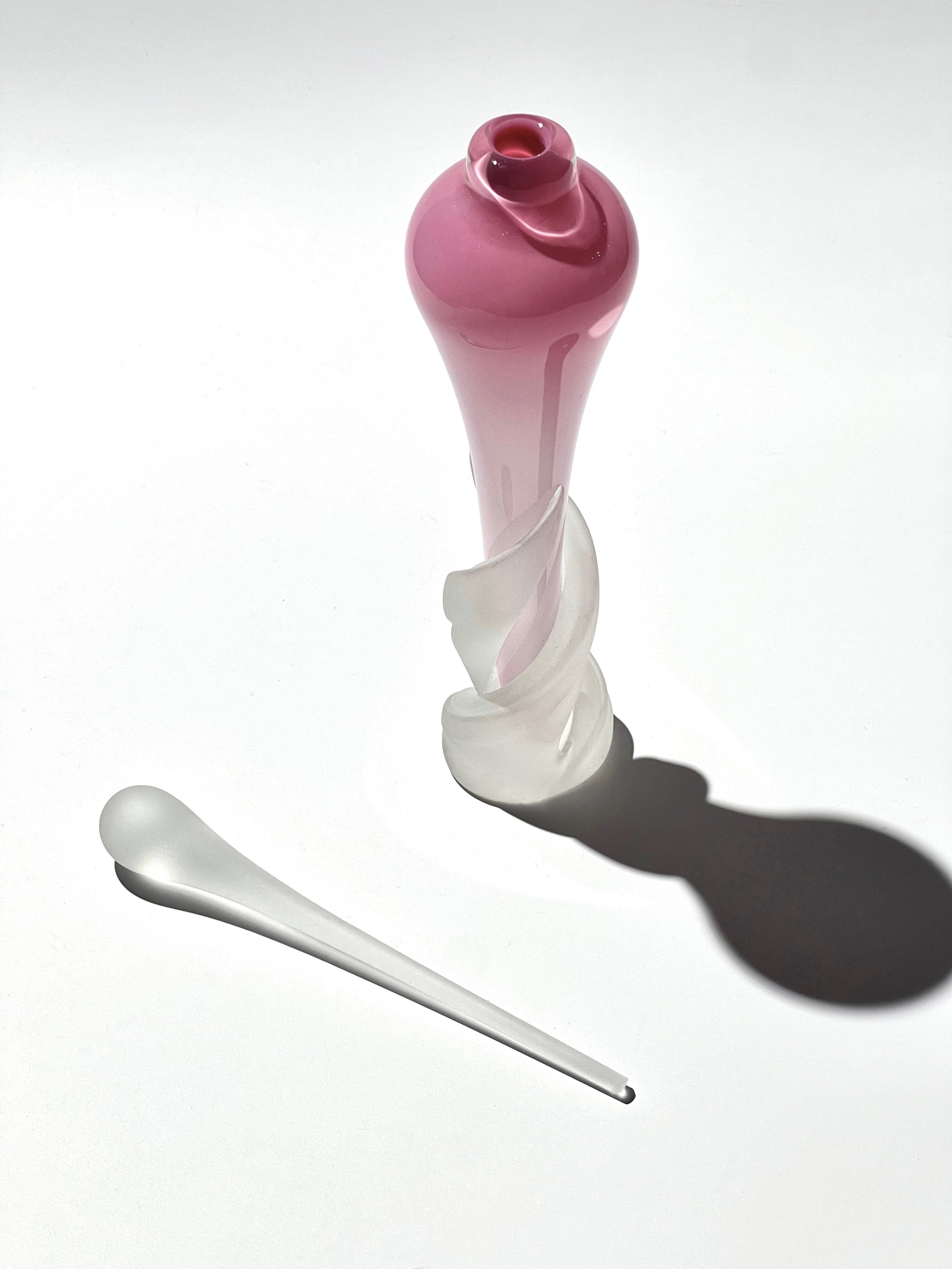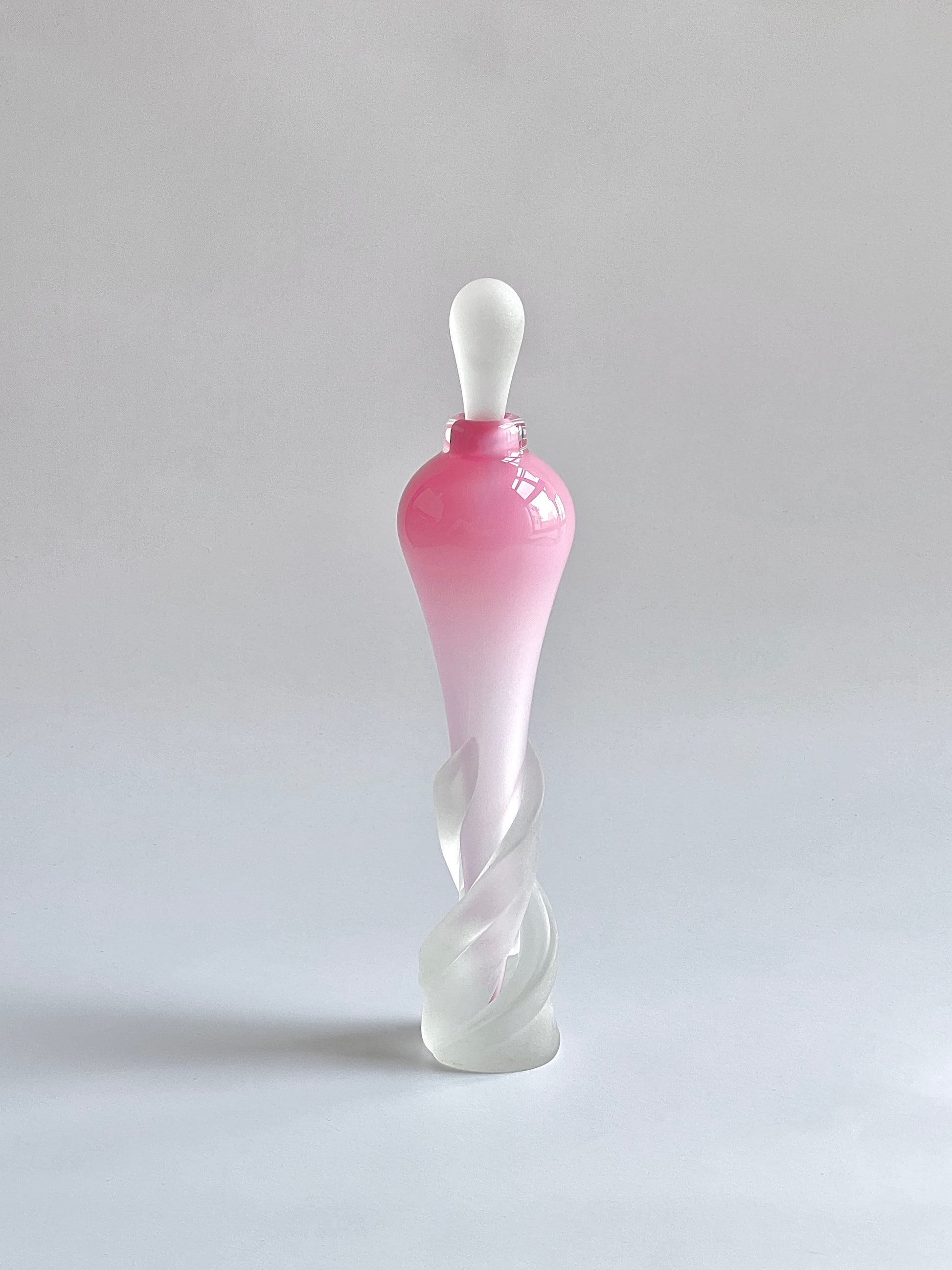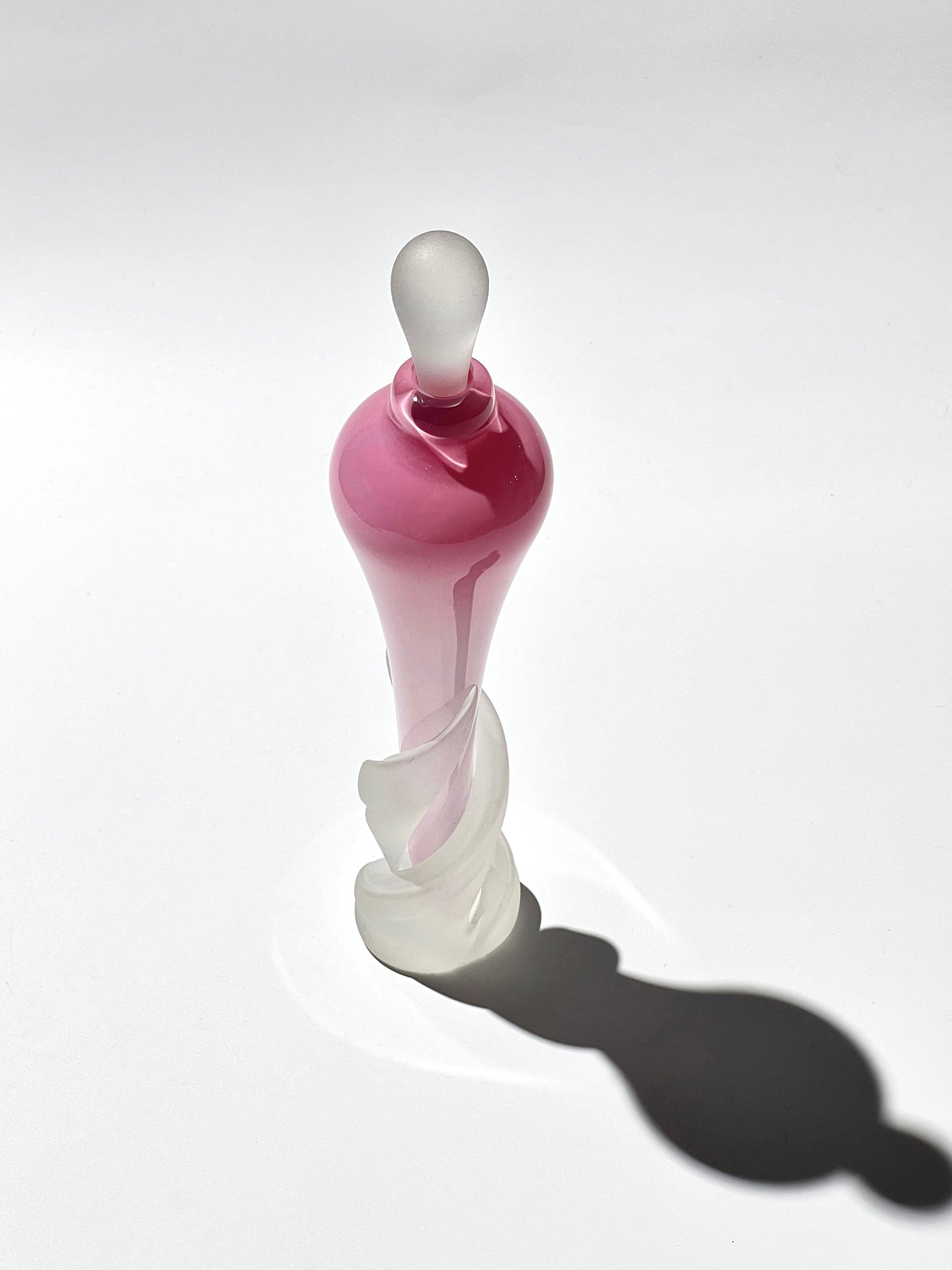 RI based glass artist Matthew Buechner signed, ombre light pink swirl perfume bottle. Frosted stopper and bottom.