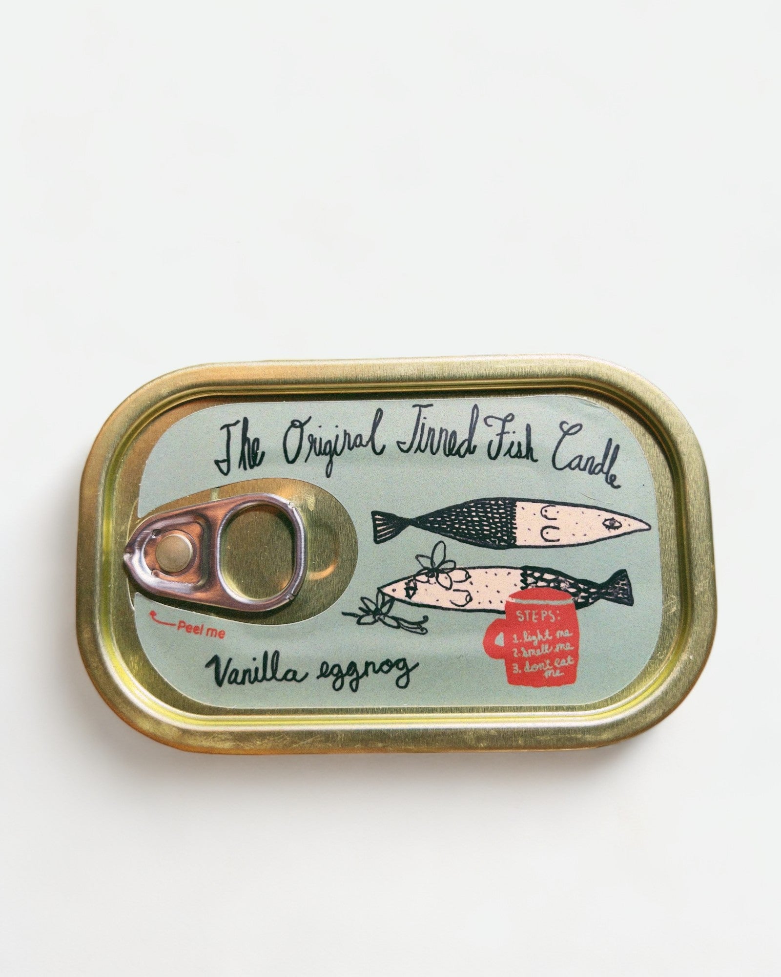 Experience the enchantment of Tinned Fish candles: hand-poured soy candles that mimic sardine cans. The magic begins as you peel back the tin lid, revealing a whimsical scene reminiscent of actual sardines in a tin. HOLIDAY STYLE, this is vanilla eggnog scent. You're welcome.