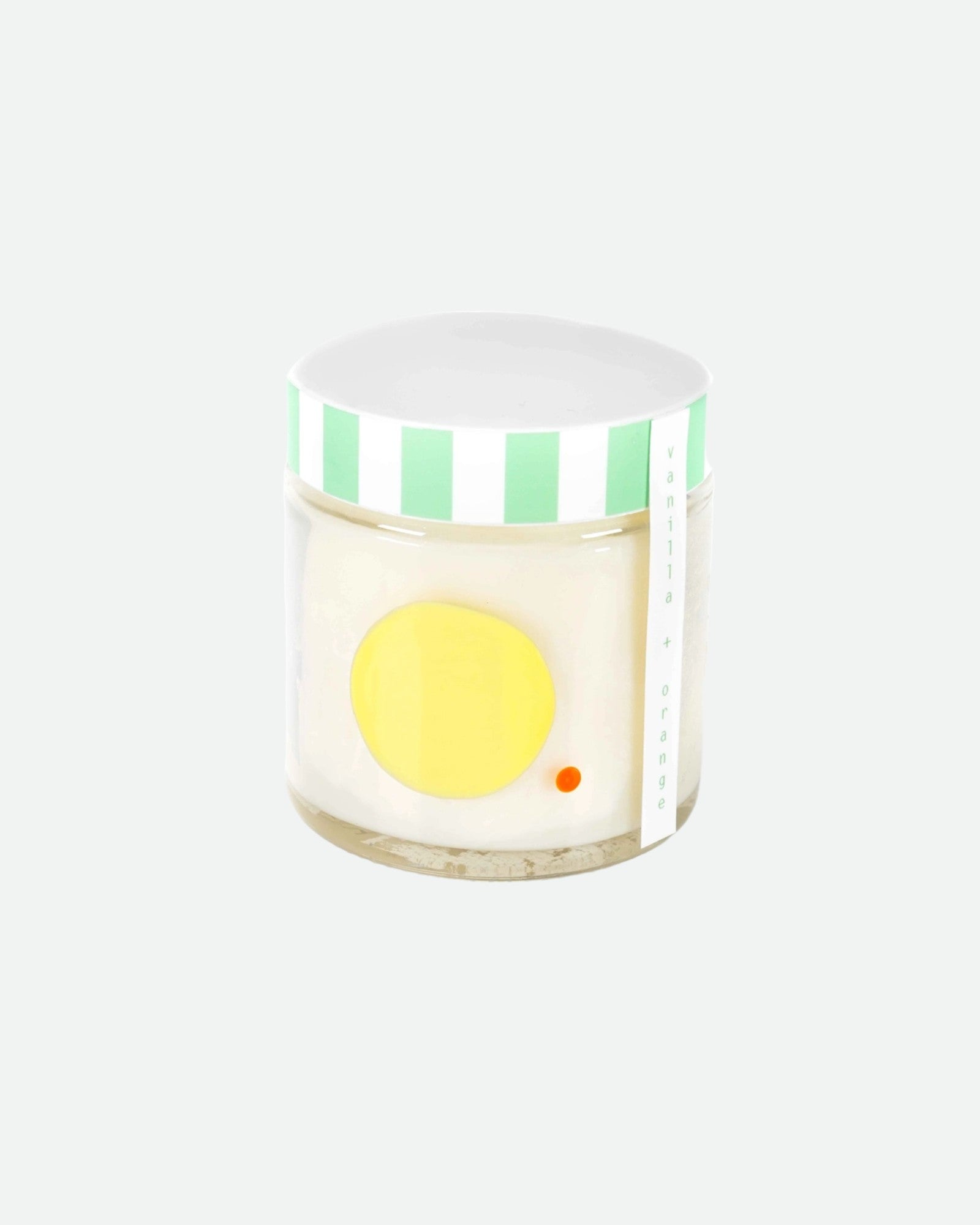 Vanilla and Orange scent hand-painted glass candle by Barcelona artisan brand, painted color indicating its scent.