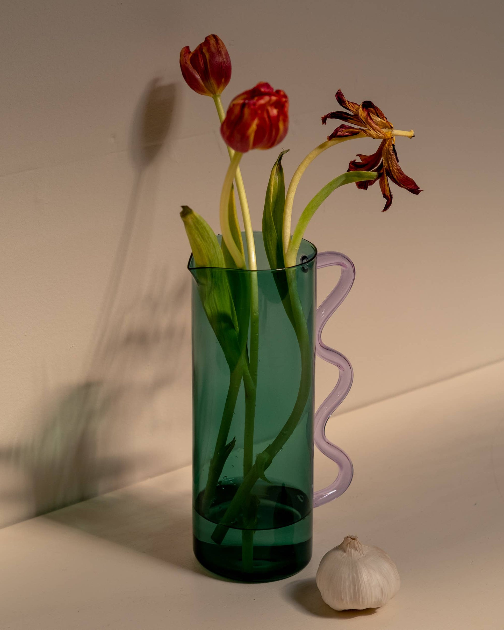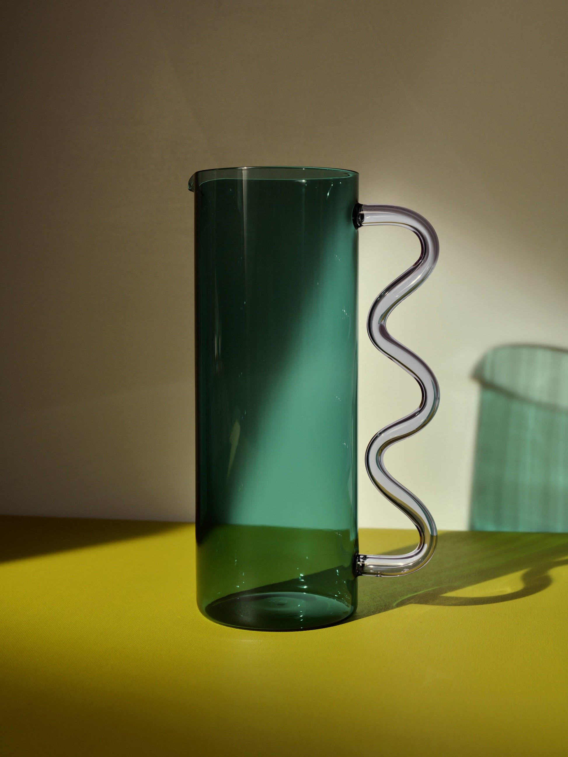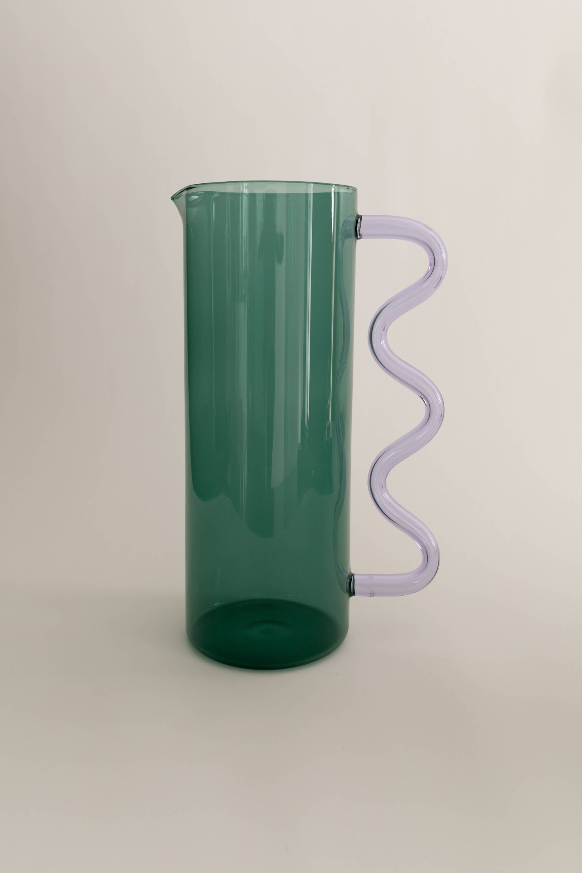 A borosilicate glass pitcher, for pouring water, juice, watering plants, holding flowers, or any other use you can think of.